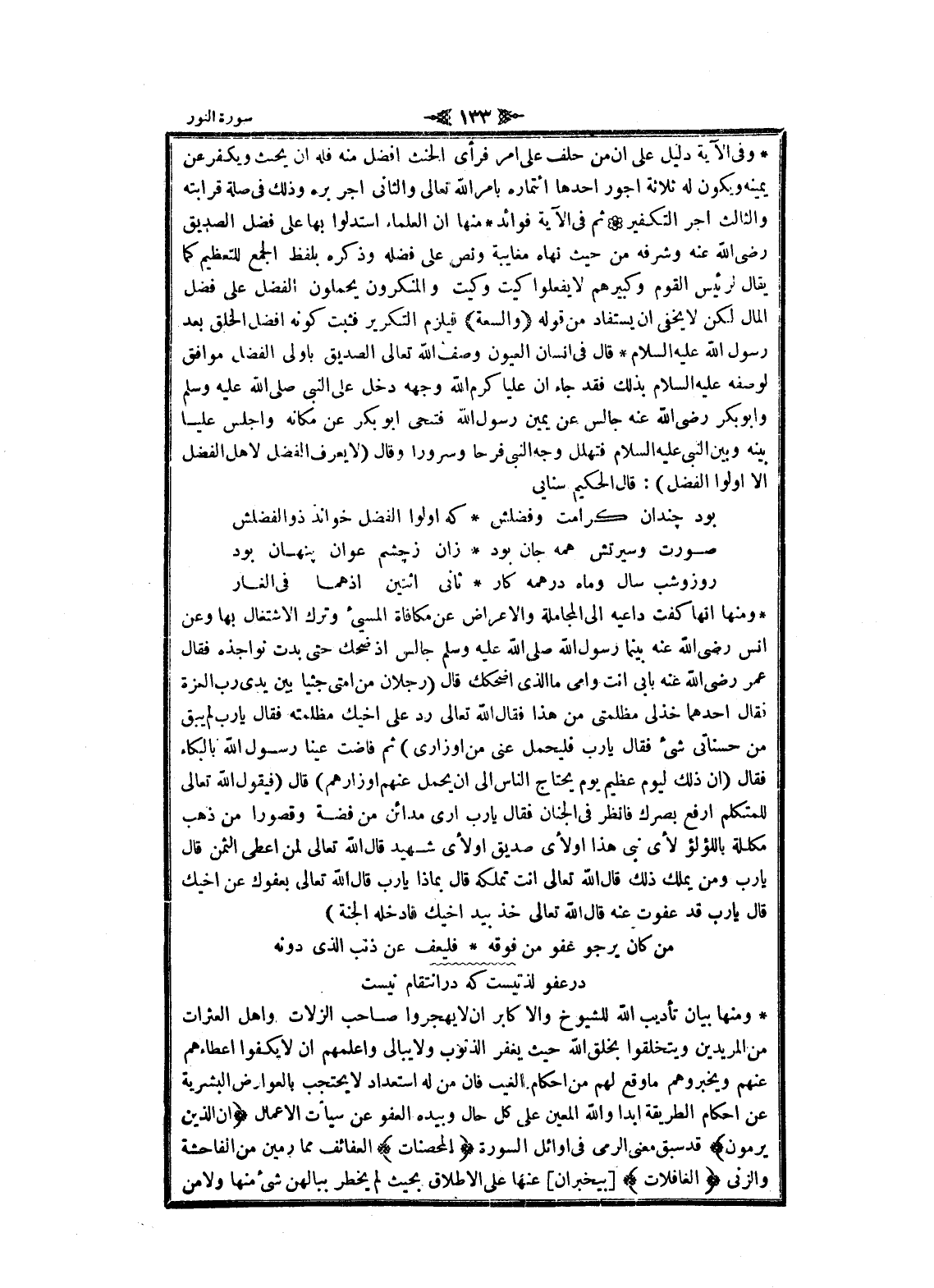 وفى الآية دليل على ان من حلف على امر فرأى الحنث أفضل منه فله ان يحث ويكفر عن يمينه ويكون له ثلاثة أجور أحدها ائتماره بامر الله تعالى والثاني اجر بره وذلك فى صلة قرابته والثالث اجر التكفير ثم فى الآية فوائد منها ان العلماء استدلوا بها على فضل الصديق رضى الله عنه وشرفه من حيث نهاه مغايبة ونص على فضله وذكره بلفظ الجمع للتعظيم كما يقال لرئيس القوم وكبيرهم لا يفعلوا كيت وكيت والمنكرون يحملون الفضل على فضل المال لكن لا يخفى ان يستفاد من قوله (وَالسَّعَةِ) فيلزم التكرير فثبت كونه أفضل الخلق بعد رسول الله عليه السلام قال فى انسان العيون وصف الله تعالى الصديق باولى الفضل موافق لوصفه عليه السلام بذلك فقد جاء ان عليا كرم الله وجهه دخل على النبي صلى الله عليه وسلم وابو بكر رضى الله عنه جالس عن يمين رسول الله فتنحى ابو بكر عن مكانه واجلس عليا بينه وبين النبي عليه السلام فتهلل وجه النبي فرحا وسرورا وقال (لا يعرف الفضل لاهل الفضل الا أولوا الفضل) : قال الحكيم سنايى