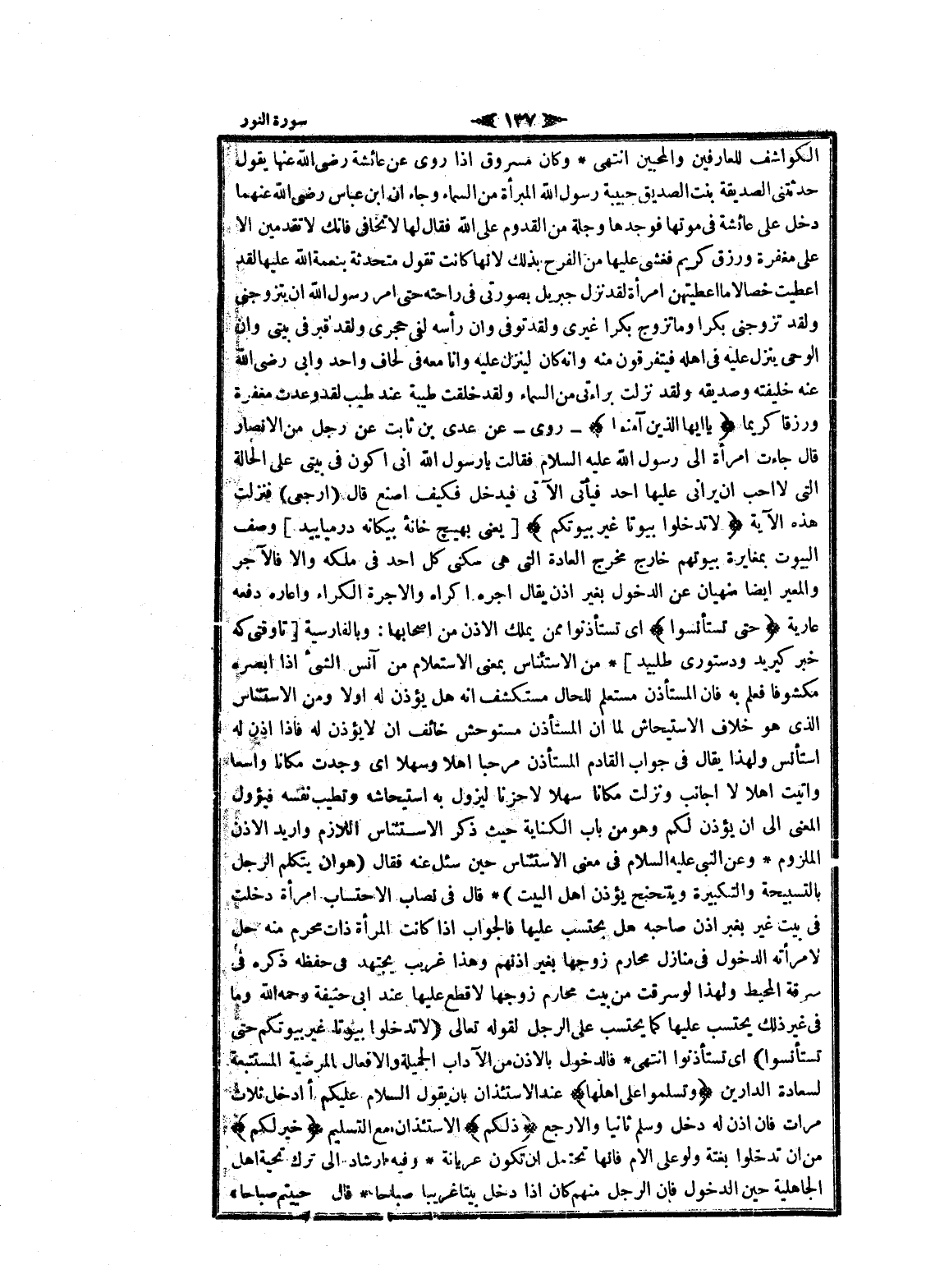 الكواشف للعارفين والمحبين انتهى وكان مسروق إذا روى عن عائشة رضى الله عنها يقول حدثتنى الصديقة بنت الصديق حبيبة رسول الله المبرأة من السماء وجاء ان ابن عباس رضى الله عنهما دخل على عائشة فى موتها فوجدها وجلة من القدوم على الله فقال لها لا تخافي فانك لا تقدمين الا على مغفرة ورزق كريم فغشى عليها من الفرح بذلك لانها كانت تقول متحدثة بنعمة الله عليها لقد أعطيت خصالا ما اعطيتهن امرأة لقد نزل جبريل بصورتى فى راحته حتى امر رسول الله ان يتزوجنى ولقد تزوجنى بكرا وما تزوج بكرا غيرى ولقد توفى وان رأسه لفى حجرى ولقد قبر فى بيتي وان الوحى ينزل عليه فى اهله فيتفرقون منه وانه كان لينزل عليه وانا معه فى لحاف واحد وابى رضى الله عنه خليفته وصديقه ولقد نزلت براءتي من السماء ولقد خلقت طيبة عند طيب لقد وعدت مغفرة ورزقا كريما يا أَيُّهَا الَّذِينَ آمَنُوا- روى- عن عدى بن ثابت عن رجل من الأنصار قال جاءت امرأة الى رسول الله عليه السلام فقالت يا رسول الله انى أكون فى بيتي على الحالة التي لا أحب ان يرانى عليها أحد فيأتى الآتي فيدخل فكيف اصنع قال (ارْجِعِي) فنزلت هذه الآية لا تَدْخُلُوا بُيُوتاً غَيْرَ بُيُوتِكُمْ [يعنى بهيچ خانه بيكانه درمياييد] وصف البيوت بمغايرة بيوتهم خارج مخرج العادة التي هى سكنى كل أحد فى ملكه والا فالآجر والمعير ايضا منهيان عن الدخول بغير اذن يقال اجره اكراه والاجرة الكراء وأعاره دفعه عارية حَتَّى تَسْتَأْنِسُوا اى تستأذنوا ممن يملك الاذن من أصحابها: وبالفارسية [تا وقتى كه خبر كيريد ودستورى طلبيد] من الاستئناس بمعنى الاستعلام من آنس الشيء إذا أبصره مكشوفا فعلم به فان المستأذن مستعلم للحال مستكشف انه هل يؤذن له اولا ومن الاستئناس الذي هو خلاف الاستيحاش لما ان المستأذن مستوحش خائف ان لا يؤدن له فاذا اذن له استأنس ولهذا يقال فى جواب القادم المستأذن مرحبا أهلا وسهلا اى وجدت مكانا واسعا وأتيت أهلا لا أجانب ونزلت مكانا سهلا لا حزنا ليزول به استيحاشه وتطيب نفسه فيؤول المعنى الى ان يؤذن لكم وهو من باب الكناية حيث ذكر الاستئناس اللازم وأريد الاذن الملزوم وعن النبي عليه السلام فى معنى الاستئناس حين سئل عنه فقال (هو ان يتكلم الرجل بالتسبيحة والتكبيرة ويتنحنح يؤذن اهل البيت) قال فى نصاب الاحتساب امرأة دخلت فى بيت غير بغير اذن صاحبه هل يحتسب عليها فالجواب إذا كانت المرأة ذات محرم منه حل لامرأته الدخول فى منازل محارم زوجها بغير إذنهم وهذا غريب يجتهد فى حفظه ذكره فى سرقة المحيط ولهذا لو سرقت من بيت محارم زوجها لا قطع عليها عند ابى حنيفة رحمه الله وما فى غير ذلك يحتسب عليها كما يحتسب على الرجل لقوله تعالى (لا تَدْخُلُوا بُيُوتاً غَيْرَ بُيُوتِكُمْ حَتَّى تَسْتَأْنِسُوا) اى تستأذنوا انتهى فالدخول بالاذن من الآداب الجميلة والافعال المرضية المستتبعة لسعادة الدارين وَتُسَلِّمُوا عَلى أَهْلِها عند الاستئذان بان يقول السلام عليكم أادخل ثلاث مرات فان اذن له دخل وسلم ثانيا والا رجع ذلِكُمْ الاستئذان مع التسليم خَيْرٌ لَكُمْ من ان تدخلوا بغتة ولو على الام فانها تحتمل ان تكون عريانة وفيه ارشاد الى ترك تحية اهل الجاهلية حين الدخول فان الرجل منهم كان إذا دخل بيتا غريبا صباحا قال «حييتم صباحا»