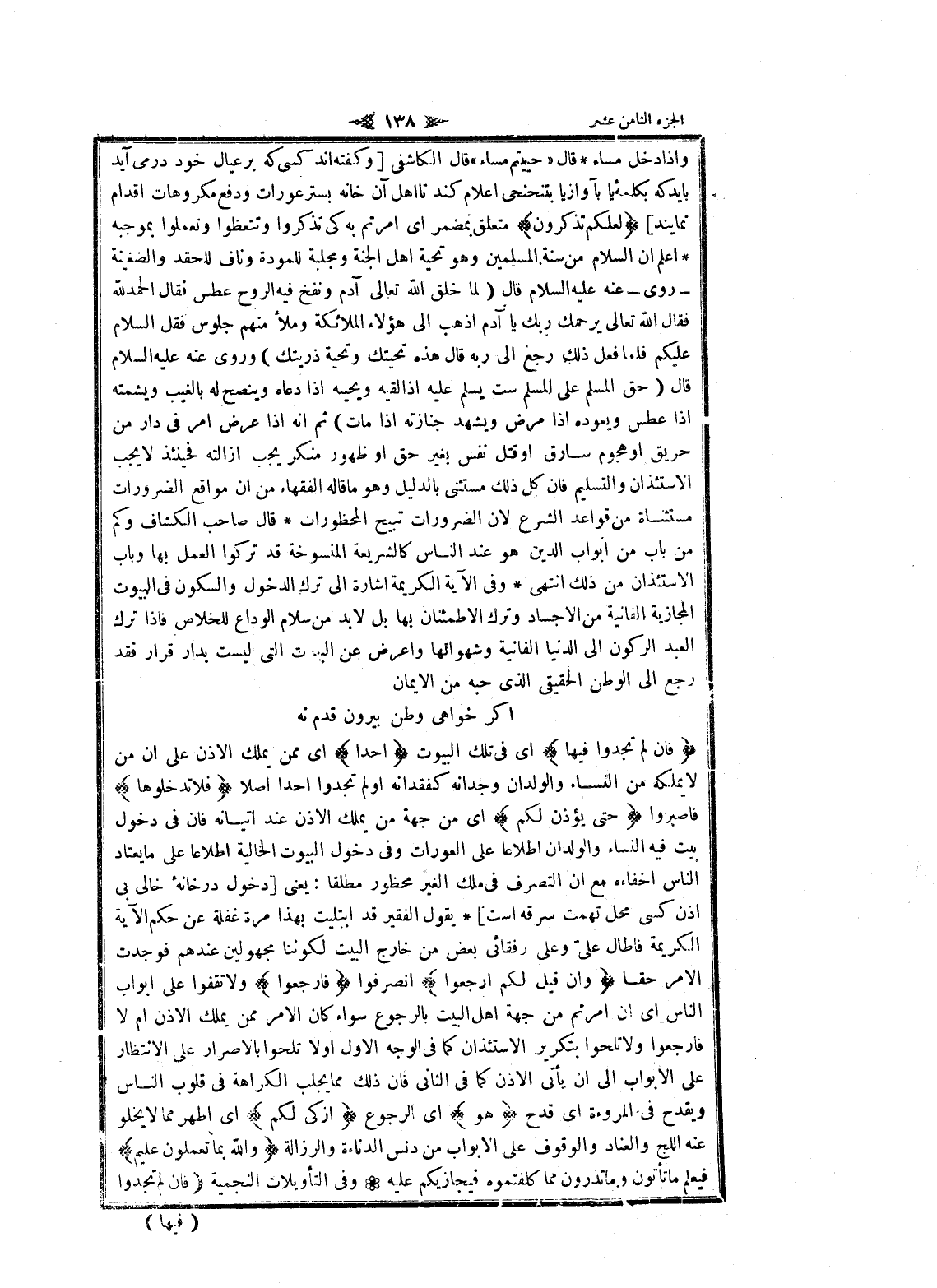 وإذا دخل مساء قال «حييتم مساء» قال الكاشفى [وكفته اند كسى كه بر عيال خود در مى آيد بايد كه بكلمه يا بآواز يا بتنحنحى اعلام كند تا اهل آن خانه بستر عورات ودفع مكروهات أقدام نمايند] لَعَلَّكُمْ تَذَكَّرُونَ متعلق بمضمر اى أمرتم به كى تذكروا وتتعظوا وتعملوا بموجبه اعلم ان السلام من سنة المسلمين وهو تحية اهل الجنة ومجلبة للمودة وناف للحقد والضغينة- روى- عنه عليه السلام قال (لما خلق الله تعالى آدم ونفخ فيه الروح عطس فقال الحمد لله فقال الله تعالى يرحمك ربك يا آدم اذهب الى هؤلاء الملائكة وملأ منهم جلوس فقل السلام عليكم فلما فعل ذلك رجع الى ربه قال هذه تحيتك وتحية ذريتك) وروى عنه عليه السلام قال (حق المسلم على المسلم ست يسلم عليه إذا لقيه ويجيبه إذا دعاه وينصح له بالغيب ويشمته إذا عطس ويعوده إذا مرض ويشهد جنازته إذا مات) ثم انه إذا عرض امر فى دار من حريق او هجوم سارق او قتل نفس بغير حق او ظهور منكر يجب إزالته فحينئذ لا يجب الاستئذان والتسليم فان كل ذلك مستثنى بالدليل وهو ما قاله الفقهاء من ان مواقع الضرورات مستثناة من قواعد الشرع لان الضرورات تبيح المحظورات قال صاحب الكشاف وكم من باب من أبواب الدين هو عند الناس كالشريعة المنسوخة قد تركوا العمل بها وباب الاستئذان من ذلك انتهى وفى الآية الكريمة اشارة الى ترك الدخول والسكون فى البيوت المجازية الفانية من الأجساد وترك الاطمئنان بها بل لا بد من سلام الوداع للخلاص فاذا ترك العبد الركون الى الدنيا الفانية وشهواتها واعرض عن البيوت التي ليست بدار قرار فقد رجع الى الوطن الحقيقي الذي حبه من الايمان
