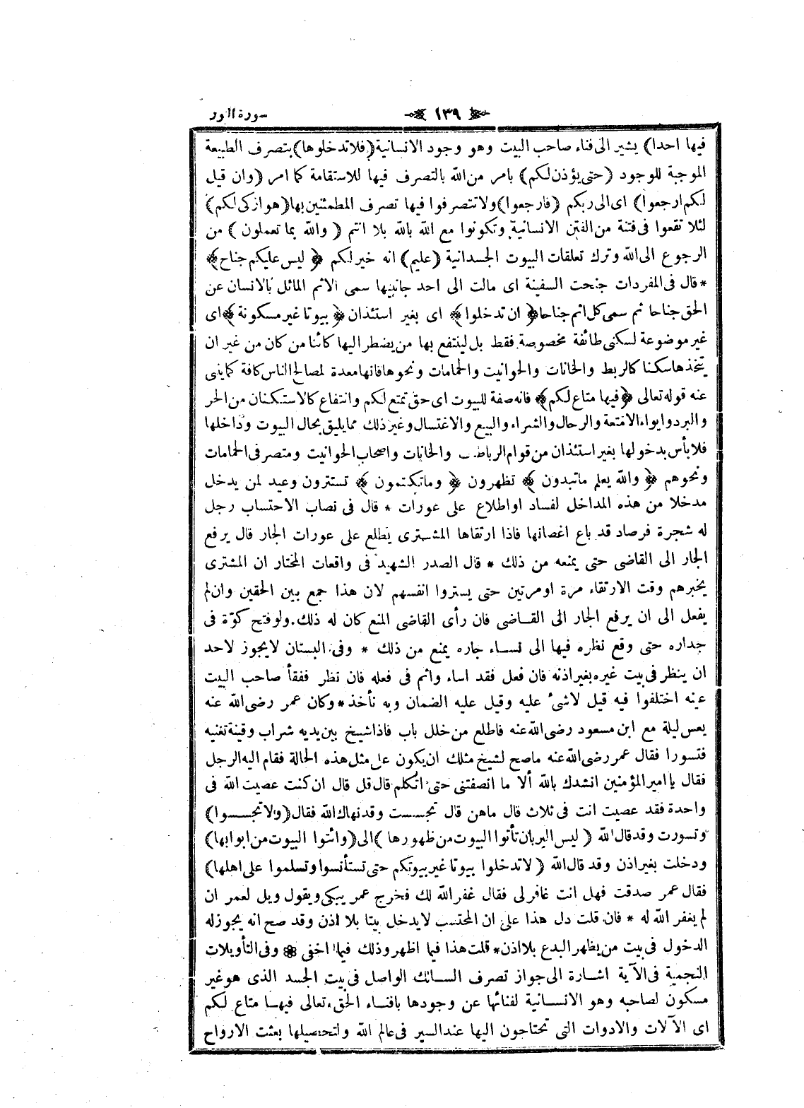يشير الى فناء صاحب البيت وهو وجود الانسانية (فَلا تَدْخُلُوها) بتصرف الطبيعة الموجبة للوجود (حَتَّى يُؤْذَنَ لَكُمْ) بامر من الله بالتصرف فيها للاستقامة كما امر (وَإِنْ قِيلَ لَكُمُ ارْجِعُوا) اى الى ربكم (فَارْجِعُوا) ولا تتصرفوا فيها تصرف المطمئنين بها (هُوَ أَزْكى لَكُمْ) لئلا تقعوا فى فتنة من الفتن الانسانية وتكونوا مع الله بالله بلا أنتم (وَاللَّهُ بِما تَعْمَلُونَ) من الرجوع الى الله وترك تعلقات البيوت الجسدانية (عَلِيمٌ) انه خير لكم لَيْسَ عَلَيْكُمْ جُناحٌ قال فى المفردات جنحت السفينة اى مالت الى أحد جانبيها سمى الإثم المائل بالإنسان عن الحق جناحا ثم سمى كل اثم جناحا أَنْ تَدْخُلُوا اى بغير استئذان بُيُوتاً غَيْرَ مَسْكُونَةٍ اى غير موضوعة لسكنى طائفة مخصوصة فقط بل لينتفع بها من يضطر إليها كائنا من كان من غير ان يتخذها سكنا كالربط والخانات والحوانيت والحمامات ونحوها فانها معدة لمصالح الناس كافة كما ينبى عنه قوله تعالى فِيها مَتاعٌ لَكُمْ فانه صفة للبيوت اى حق تمتع لكم وانتفاع كالاستكنان من الحر والبرد وإيواء الامتعة والرحال والشراء والبيع والاغتسال وغير ذلك مما يليق بحال البيوت وداخلها فلا بأس بدخولها بغير استئذان من قوام الرباطات والخانات واصحاب الحوانيت ومتصرفى الحمامات ونحوهم وَاللَّهُ يَعْلَمُ ما تُبْدُونَ تظهرون وَما تَكْتُمُونَ تستترون وعيد لمن يدخل مدخلا من هذه المداخل لفساد او اطلاع على عورات قال فى نصاب الاحتساب رجل له شجرة فرصاد قد باع أغصانها فاذا ارتقاها المشترى يطلع على عورات الجار قال يرفع الجار الى القاضي حتى يمنعه من ذلك قال الصدر الشهيد فى واقعات المختار ان المشترى يخبرهم وقت الارتقاء مرة او مرتين حتى يستروا أنفسهم لان هذا جمع بين الحقين وان لم يفعل الى ان يرفع الجار الى القاضي فان رأى القاضي المنع كان له ذلك. ولو فتح كوّة فى جداره حتى وقع نظره فيها الى نساء جاره يمنع من ذلك وفى البستان لا يجوز لاحد ان ينظر فى بيت غيره بغير اذنه فان فعل فقد أساء واثم فى فعله فان نظر ففقأ صاحب البيت عينه اختلفوا فيه قيل لا شىء عليه وقيل عليه الضمان وبه نأخذ وكان عمر رضى الله عنه يعس ليلة مع ابن مسعود رضى الله عنه فاطلع من خلل باب فاذا شيخ بين يديه شراب وقينة تغنيه فتسورا فقال عمر رضى الله عنه ما صح لشيخ مثلك ان يكون على مثل هذه الحالة فقام اليه الرجل فقال يا امير المؤمنين أنشدك بالله ألا ما أنصفتني حتى أتكلم قال قل قال ان كنت عصيت الله فى واحدة فقد عصيت أنت فى ثلاث قال ما هن قال تجسست وقد نهاك الله فقال (وَلا تَجَسَّسُوا) وتسورت وقد قال الله (لَيْسَ الْبِرُّ بِأَنْ تَأْتُوا الْبُيُوتَ مِنْ ظُهُورِها) الى (وَأْتُوا الْبُيُوتَ مِنْ أَبْوابِها) ودخلت بغير اذن وقد قال الله (لا تَدْخُلُوا بُيُوتاً غَيْرَ بُيُوتِكُمْ حَتَّى تَسْتَأْنِسُوا وَتُسَلِّمُوا عَلى أَهْلِها) فقال عمر صدقت فهل أنت غافر لى فقال غفر الله لك فخرج عمر يبكى ويقول ويل لعمر ان لم يغفر الله له فان قلت دل هذا على ان المحتسب لا يدخل بيتا بلا اذن وقد صح انه يجوز له الدخول فى بيت من يظهر البدع بلا اذن قلت هذا فيما اظهر وذلك فيما أخفى وفى التأويلات النجمية فى الآية اشارة الى جواز تصرف السالك الواصل فى بيت الجسد الذي هو غير مسكون لصاحبه وهو الانسانية لفنائها عن وجودها بافناء الحق تعالى فيها متاع لكم اى الآلات والأدوات التي تحتاجون إليها عند السير فى عالم الله ولتحصيلها بعثت الأرواح