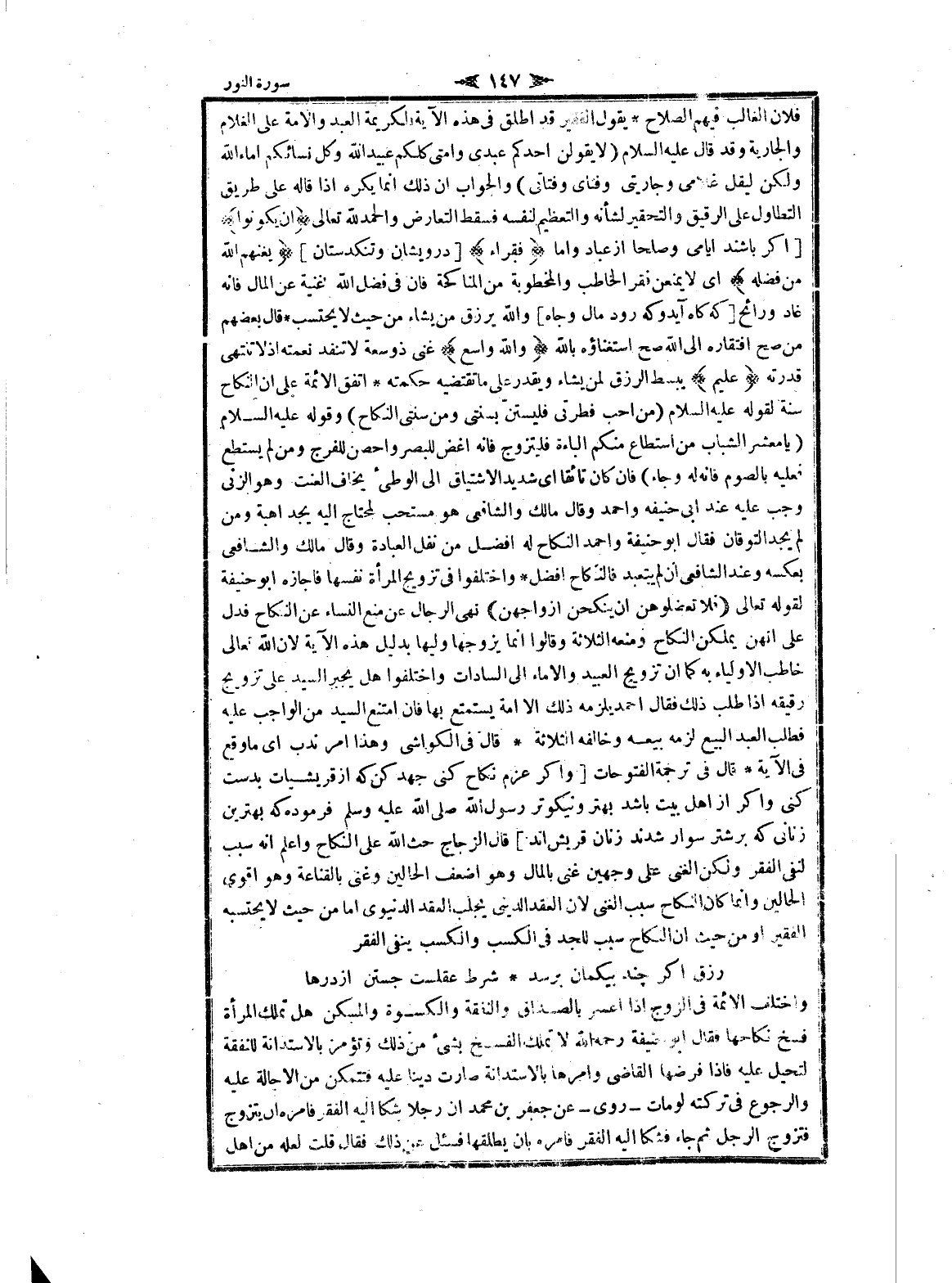 فلان الغالب فيهم الصلاح يقول الفقير قد اطلق فى هذه الآية الكريمة العبد والامة على الغلام والجارية وقد قال عليه السلام (لا يقولن أحدكم عبدى وأمتي كلكم عبيد الله وكل نسائكم إماء الله ولكن ليقل غلامى وجاريتى وفتاى وفتاتى) والجواب ان ذلك انما يكره إذا قاله على طريق التطاول على الرقيق والتحقير لشأنه والتعظيم لنفسه فسقط التعارض والحمد لله تعالى إِنْ يَكُونُوا [اگر باشند أيامي وصلحا از عباد واما فُقَراءَ [درويشان وتنكدستان] يُغْنِهِمُ اللَّهُ مِنْ فَضْلِهِ اى لا يمنعن فقر الخاطب والمخطوبة من المناكحة فان فى فضل الله غنية عن المال فانه غاد ورائح [كه كاه آيد وكه رود مال وجاه] والله يرزق من يشاء من حيث لا يحتسب قال بعضهم من صح افتقاره الى الله صح استغناؤه بالله وَاللَّهُ واسِعٌ غنى ذو سعة لا تنفد نعمته إذ لا تنتهى قدرته عَلِيمٌ يبسط الرزق لمن يشاء ويقدر على ما تقتضيه حكمته اتفق الائمة على ان النكاح سنة لقوله عليه السلام (من أحب فطرتى فليستنّ بسنتى ومن سنتى النكاح) وقوله عليه السلام (يا معشر الشباب من استطاع منكم الباءة فليتزوج فانه اغض للبصر وأحصن للفرج ومن لم يستطع فعليه بالصوم فانه له وجاء) فان كان تائقا اى شديد الاشتياق الى الوطئ يخاف العنت وهو الزنى وجب عليه عند ابى حنيفه واحمد وقال مالك والشافعي هو مستحب لمحتاج اليه يجد اهبة ومن لم يجد التوقان فقال ابو حنيفة واحمد النكاح له أفضل من نفل العبادة وقال مالك والشافعي بعكسه وعند الشافعي ان لم يتعبد فالنكاح أفضل واختلفوا فى تزويج المرأة نفسها فاجازه ابو حنيفة لقوله تعالى (فَلا تَعْضُلُوهُنَّ أَنْ يَنْكِحْنَ أَزْواجَهُنَّ) نهى الرجال عن منع النساء عن النكاح فدل على انهن يملكن النكاح ومنعه الثلاثة وقالوا انما يزوجها وليها بدليل هذه الآية لان الله تعالى خاطب الأولياء به كما ان تزويج العبيد والإماء الى السادات واختلفوا هل يجبر السيد على تزويج رقيقه إذا طلب ذلك فقال احمد يلزمه ذلك الا امة يستمتع بها فان امتنع السيد من الواجب عليه فطلب العبد البيع لزمه بيعه وخالفه الثلاثة قال فى الكواشي وهذا امر ندب اى ما وقع فى الآية قال فى ترجمة الفتوحات [واگر عزم نكاح كنى جهد كن كه از قريشيات بدست كنى واگر از اهل بيت باشد بهتر ونيكوتر رسول الله صلى الله عليه وسلم فرموده كه بهترين زنانى كه بر شتر سوار شدند زنان قريش اند] قال الزجاج حث الله على النكاح واعلم انه سبب لنفى الفقر ولكن الغنى على وجهين غنى بالمال وهو أضعف الحالين وغنى بالقناعة وهو أقوى الحالين وانما كان النكاح سبب الغنى لان العقد الديني يجلب العقد الدنيوي اما من حيث لا يحتسبه الفقير او من حيث ان النكاح سبب للجد فى الكسب والكسب ينفى الفقر