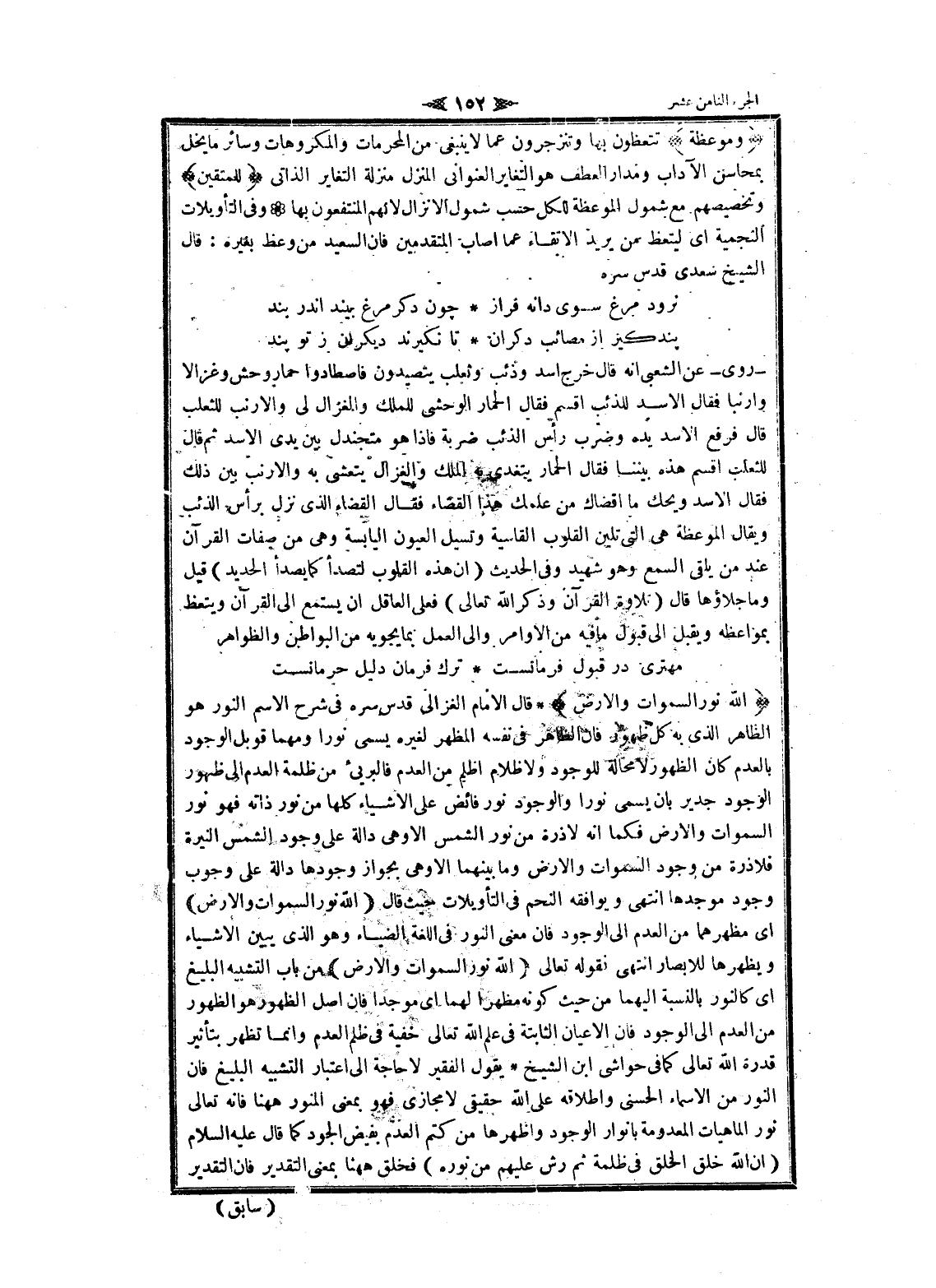 اللَّهُ نُورُ السَّماواتِ وَالْأَرْضِ قال الامام الغزالي قدس سره فى شرح الاسم النور هو الظاهر الذي به كل ظهور فان الظاهر فى نفسه المظهر لغيره يسمى نورا ومهما قوبل الوجود بالعدم كان الظهور لا محالة للوجود ولا ظلام اظلم من العدم فالبريئ من ظلمة العدم الى ظهور الوجود جدير بان يسمى نورا والوجود نور فائض على الأشياء كلها من نور ذاته فهو نور السموات والأرض فكما انه لا ذرة من نور الشمس الا وهى دالة على وجود الشمس النيرة فلا ذرة من وجود السموات والأرض وما بينهما إلا وهي بجواز وجودها دالة على وجوب وجود موجدها انتهى ويوافقه النجم فى التأويلات حيث قال (اللَّهُ نُورُ السَّماواتِ وَالْأَرْضِ) اى مظهرهما من العدم الى الوجود فان معنى النور فى اللغة الضياء وهو الذي يبين الأشياء ويظهرها للابصار انتهى فقوله تعالى (اللَّهُ نُورُ السَّماواتِ وَالْأَرْضِ) من باب التشبيه البليغ اى كالنور بالنسبة إليهما من حيث كونه مظهرا لهما اى موجدا فان اصل الظهور هو الظهور من العدم الى الوجود فان الأعيان الثابتة فى علم الله تعالى خفية فى ظلم العدم وانما تظهر بتأثير قدرة الله تعالى كما فى حواشى ابن الشيخ يقول الفقير لا حاجة الى اعتبار التشبيه البليغ فان النور من الأسماء الحسنى وإطلاقه على الله حقيقى لا مجازى فهو بمعنى المنور هاهنا فانه تعالى نور الماهيات المعدومة بانوار الوجود وأظهرها من كتم العدم بفيض الجود كما قال عليه السلام (ان الله خلق الخلق فى ظلمة ثم رش عليهم من نوره) فخلق هاهنا بمعنى التقدير فان التقدير