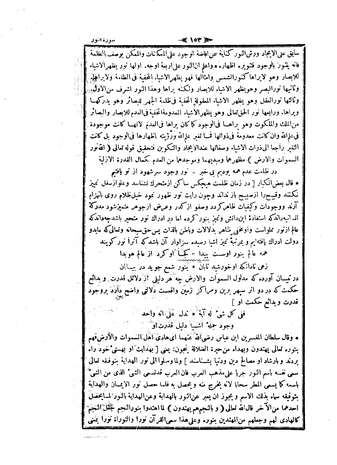 وقال سلطان المفسرين ابن عباس رضى الله عنهما اى هادى اهل السموات والأرض فهم بنوره تعالى يهتدون وبهداه من حيرة الضلالة ينجون: يعنى [بهدايت او بهستىء خود راه بردند وبإرشاد او مصالح دين ودنيا بشناسند] ولما وصلوا الى نور الهداية بتوفيقه تعالى سمى نفسه باسم النور جريا على مذهب العرب فان العرب قد تسمى الشيء الذي من الشيء باسمه كما يسمى المطر سحابا لانه يخرج منه ويحصل به فلما حصل نور الايمان والهداية بتوفيقه سماه بذلك الاسم ويجوز ان يعبر عن النور بالهداية وعن الهداية بالنور لما يحصل أحدهما من الآخر قال الله تعالى (وَبِالنَّجْمِ هُمْ يَهْتَدُونَ) لما اهتدوا بنور النجم جعل النجم كالهادى لهم وجعلهم من المهتدين بنوره وعلى هذا سمى القرآن نورا والتوراة نورا بمعنى