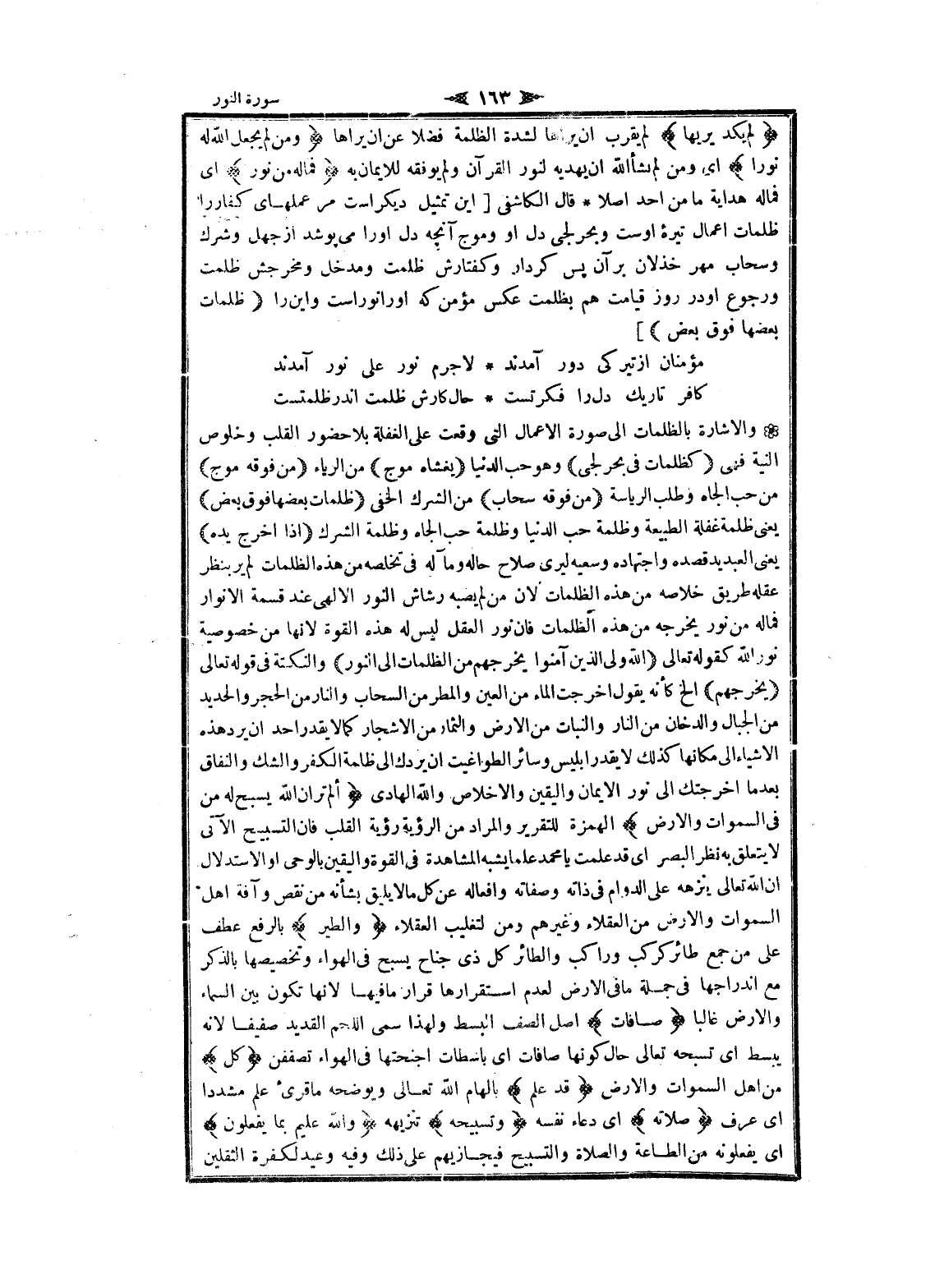 والاشارة بالظلمات الى صورة الأعمال التي وقعت على الغفلة بلا حضور القلب وخلوص النية فهى (كَظُلُماتٍ فِي بَحْرٍ لُجِّيٍّ) وهو حب الدنيا (يَغْشاهُ مَوْجٌ) من الرياء (مِنْ فَوْقِهِ مَوْجٌ) من حب الجاه وطلب الرياسة (مِنْ فَوْقِهِ سَحابٌ) من الشرك الخفي (ظُلُماتٌ بَعْضُها فَوْقَ بَعْضٍ) يعنى ظلمة غفلة الطبيعة وظلمة حب الدنيا وظلمة حب الجاه وظلمة الشرك (إِذا أَخْرَجَ يَدَهُ) يعنى العبد يد قصده واجتهاده وسعيه ليرى صلاح حاله ومآله فى تخلصه من هذه الظلمات لم ير بنظر عقله طريق خلاصه من هذه الظلمات لان من لم يصبه رشاش النور الإلهي عند قسمة الأنوار فما له من نور يخرجه من هذه الظلمات فان نور العقل ليس له هذه القوة لانها من خصوصية نور الله كقوله تعالى (اللَّهُ وَلِيُّ الَّذِينَ آمَنُوا يُخْرِجُهُمْ مِنَ الظُّلُماتِ إِلَى النُّورِ) والنكتة فى قوله تعالى (يُخْرِجُهُمْ) إلخ كأنه يقول أخرجت الماء من العين والمطر من السحاب والنار من الحجر والحديد من الجبال والدخان من النار والنبات من الأرض والثمار من الأشجار كما لا يقدر أحد ان يرد هذه الأشياء الى مكانها كذلك لا يقدر إبليس وسائر الطواغيت ان يردك الى ظلمة الكفر والشك والنفاق بعد ما أخرجتك الى نور الايمان واليقين والإخلاص والله الهادي أَلَمْ تَرَ أَنَّ اللَّهَ يُسَبِّحُ لَهُ مَنْ فِي السَّماواتِ وَالْأَرْضِ) الهمزة للتقرير والمراد من الرؤية رؤية القلب فان التسبيح الآتي لا يتعلق به نظر البصر اى قد علمت يا محمد علما يشبه المشاهدة فى القوة واليقين بالوحى او الاستدلال ان الله تعالى ينزهه على الدوام فى ذاته وصفاته وأفعاله عن كل ما لا يليق بشأنه من نقص وآفة اهل السموات والأرض من العقلاء وغيرهم ومن لتغليب العقلاء وَالطَّيْرُ بالرفع عطف على من جمع طائر كركب وراكب والطائر كل ذى جناح يسبح فى الهواء وتخصيصها بالذكر مع اندراجها فى جملة ما فى الأرض لعدم استقرارها قرار ما فيها لانها تكون بين السماء والأرض غالبا صَافَّاتٍ اصل الصف البسط ولهذا سمى اللحم القديد صفيفا لانه يبسط اى تسبحه تعالى حال كونها صافات اى باسطات أجنحتها فى الهواء تصففن كُلٌّ من اهل السموات والأرض قَدْ عَلِمَ بالهام الله تعالى ويوضحه ما قرئ علم مشددا اى عرف صَلاتَهُ اى دعاء نفسه وَتَسْبِيحَهُ تنزيهه وَاللَّهُ عَلِيمٌ بِما يَفْعَلُونَ اى يفعلونه من الطاعة والصلاة والتسبيح فيجازيهم على ذلك وفيه وعيد لكفرة الثقلين