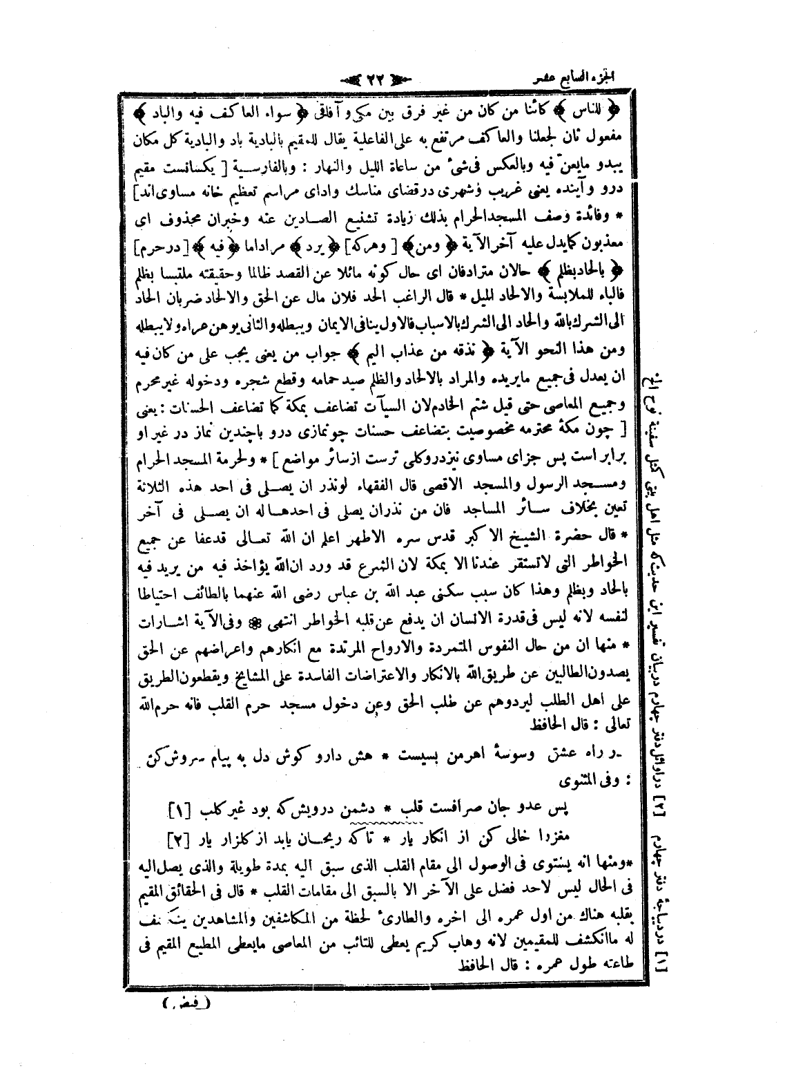 بتضاعف حسنات چونمازى درو با چندين نماز در غير او برابر است پس جزاى مساوى نيز در وكلى ترست از سائر مواضع] ولحرمة المسجد الحرام ومسجد الرسول والمسجد الأقصى قال الفقهاء لو نذر ان يصلى فى أحد هذه الثلاثة تعيين بخلاف سائر المساجد فان من نذران يصلى فى أحدها له ان يصلى فى آخر قال حضرة الشيخ الأكبر قدس سره الأطهر اعلم ان الله تعالى قد عفا عن جميع الخواطر التي لا تستقر عندنا الا بمكة لان الشرع قد ورد ان الله يؤاخذ فيه من يريد فيه بإلحاد وبظلم وهذا كان سبب سكنى عبد الله بن عباس رضى الله عنهما بالطائف احتياطا لنفسه لانه ليس فى قدرة الإنسان ان يدفع عن قلبه الخواطر انتهى وفى الآية إشارات منها ان من حال النفوس المتمردة والأرواح المرتدة مع انكارهم واعراضهم عن الحق يصدون الطالبين عن طريق الله بالإنكار والاعتراضات الفاسدة على المشايخ ويقطعون الطريق على اهل الطلب ليردوهم عن طلب الحق وعن دخول مسجد حرم القلب فانه حرم الله تعالى: قال الحافظ