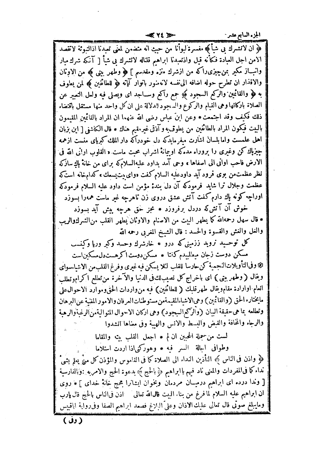 أَنْ لا تُشْرِكْ بِي شَيْئاً مفسرة لبوأنا من حيث انه متضمن لمعنى تعبدنا إذ التبوئة لا تقصد الا من أجل العبادة فكأنه قيل وإذ تعبدنا ابراهيم قلنا له لا تشرك بي شيأ [آنكه شرك ميار وانباز مكير بمن چيزى را كه من از شرك منزه ومقدسم] وَطَهِّرْ بَيْتِيَ من الأوثان والاقذار ان تطرح حوله اضافه الى نفسه لانه منور بانوار آياته لِلطَّائِفِينَ لمن يطوف به وَالْقائِمِينَ وَالرُّكَّعِ السُّجُودِ جمع راكع وساجد اى ويصلى فيه ولعل التعبير عن الصلاة بأركانها وهى القيام والركوع والسجود للدلالة على ان كل واحد منها مستقل باقتضاء ذلك فكيف وقد اجتمعت وعن ابن عباس رضى الله عنهما ان المراد بالقائمين المقيمون بالبيت فيكون المراد بالطائفين من يطوف به وآفاقى غير مقيم هناك قال الكاشفى [اين بزبان اهل علمست واما بلسان اشارت ميفرمايد كه دل خود را كه دار الملك كبرياى منست از همه چيز پاك كن وغيرى را برو راه مده كه او پيمانه إشراب محبت ماست «القلوب أواني الله فى الأرض فاحب أواني الى أصفاها» وحي آمد بداود عليه السلام كه براى من خانه پاك ساز كه نظر عظمت من بوى فرود آيد داود عليه السلام كفت «واى بيت يسعك» كدام خانه است كه عظمت وجلال ترا شايد فرمود كه آن دل بنده مؤمن است داود عليه السلام فرمود كه او را چهـ كونه پاك دارم كفت آتش عشق در وى زن تا هر چهـ غير پيش آيد بسوزد