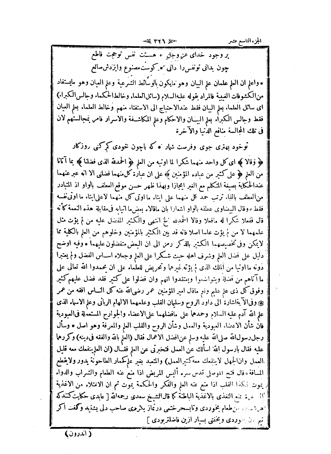 واعلم ان العلم علمان علم البيان وهو ما يكون بالوسائط الشرعية وعلم العيان وهو ما يستفاد من الكشوفات الغيبية فالمراد بقوله عليه السلام (سائل العلماء وخالط الحكماء وجالس الكبراء) اى سائل العلماء بعلم البيان فقط عند الاحتياج الى الاستفتاء منهم وخالط العلماء بعلم العيان فقط وجالس الكبراء بعلم البيان والاحكام وعلم المكاشفة والاسرار فامر بمجالستهم لان فى تلك المجالسة منافع الدنيا والآخرة