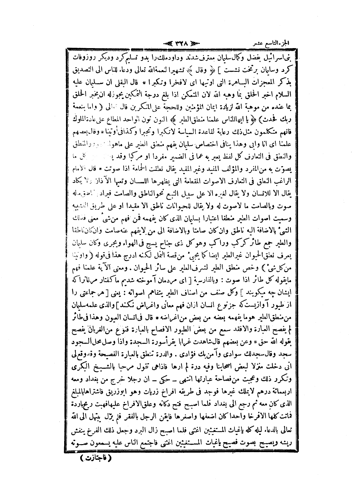 بنى إسرائيل بفضل وكمال سليمان معترف شدند وداود ملك را بدو تسليم كرد وديكر روز وفات كرد وسليمان بر تخت نشست] وَقالَ تشهيرا لنعمة الله تعالى ودعاء للناس الى التصديق بذكر المعجزات الباهرة التي أوتيها اى لا فخرا وتكبرا قال البقلى ان سليمان عليه السلام اخبر الخلق بما وهبه الله لان المتمكن إذا بلغ درجة التمكين يجوز له ان يخبر الخلق بما عنده من موهبة الله لزيادة ايمان المؤمنين وللحجة على المنكرين قال تعالى (وَأَمَّا بِنِعْمَةِ رَبِّكَ فَحَدِّثْ) يا أَيُّهَا النَّاسُ عُلِّمْنا مَنْطِقَ الطَّيْرِ النون نون الواحد المطاع على عادة الملوك فانهم متكلمون مثل ذلك رعاية لقاعدة السياسة لا تكبرا وتجبرا وكذا فى أوتينا وقال بعضهم علمنا اى انا وابى وهذا ينافى اختصاص سليمان بفهم منطق الطير على ما هو المشهور والمنطق والنطق فى التعارف كل لفظ يعبر به عما فى الضمير مفردا او مركبا وقد يطلق على كل ما يصوّت به من المفرد والمؤلف المفيد وغير المفيد يقال نطقت الحمامة إذا صوتت قال الامام الراغب النطق فى التعارف الأصوات المقطعة التي يظهرها اللسان وتعيها الآذان ولا يكاد يقال الا للانسان ولا يقال لغيره الا على سبيل التبع نحو الناطق والصامت فيراد بالناطق ماله صوت وبالصامت ما لا صوت له ولا يقال للحيوانات ناطق الا مقيدا او على طريق التشبيه وسميت أصوات الطير منطقا اعتبارا بسليمان الذي كان يفهمه فمن فهم من شىء معنى فذلك الشيء بالاضافة اليه ناطق وان كان صامتا وبالاضافة الى من لا يفهم عنه صامت وان كان ناطقا والطير جمع طائر كركب وراكب وهو كل ذى جناح يسج فى الهواء ويجرى وكان سليمان يعرف نطق الحيوان غير الطير ايضا كما يجيئ من قصة النمل لكنه أدرج هذا فى قوله (وَأُوتِينا مِنْ كُلِّ شَيْءٍ) وخص منطق الطير لشرف الطير على سائر الحيوان. ومعنى الآية علمنا فهم ما يقوله كل طائر إذا صوت: وبالفارسية [اى مردمان آموخته شديم ما كفتار مرغانرا كه ايشان چهـ ميكويند] وكل صنف من اصناف الطير يتفاهم أصواته: يعنى [هر جماعتى را از طيور آوازيست كه جز نوع انسان از ان فهم معانى واغراض نكند] والذي علمه سليمان من منطق الطير هو ما يفهمه بعضه من بعض من أغراضه قال فى انسان العيون وهذا فى طائر لم يفصح العبارة والا فقد سمع من بعض الطيور الإفصاح بالعبارة فنوع من الغربان يفصح بقوله الله حق وعن بعضهم قال شاهدت غرابا يقرأ سورة السجدة وإذا وصل محل السجود سجد وقال سجد لك سوادى وآمن بك فؤادى. والدرة تنطق بالعبارة الفصيحة وقد وقع لى انى دخلت منزلا لبعض أصحابنا وفيه درة لم ارها فاذا هى تقول مرحبا بالشيخ البكري وتكرر ذلك وعجبت من فصاحة عبارتها انتهى- حكى- ان رجلا خرج من بغداد ومعه اربعمائة درهم لا يملك غيرها فوجد فى طريقه أفراخ زريات وهو ابو زريق فاشتراها بالمبلغ الذي كان معه ثم رجع الى بغداد فلما أصبح فتح دكانه وعلق الافراخ عليها فهبت ريح بارادة فماتت كلها الا فرخا واحدا كان أضعفها وأصغرها فايقن الرجل بالفقر فلم يزل يبتهل الى الله تعالى بالدعاء ليله كله يا غياث المستغيثين أغثني فلما أصبح زال البرد وجعل ذلك الفرخ ينفش ريشه ويصيح بصوت فصيح يا غياث المستغيثين أغثني فاجتمع الناس عليه يسمعون صوته
