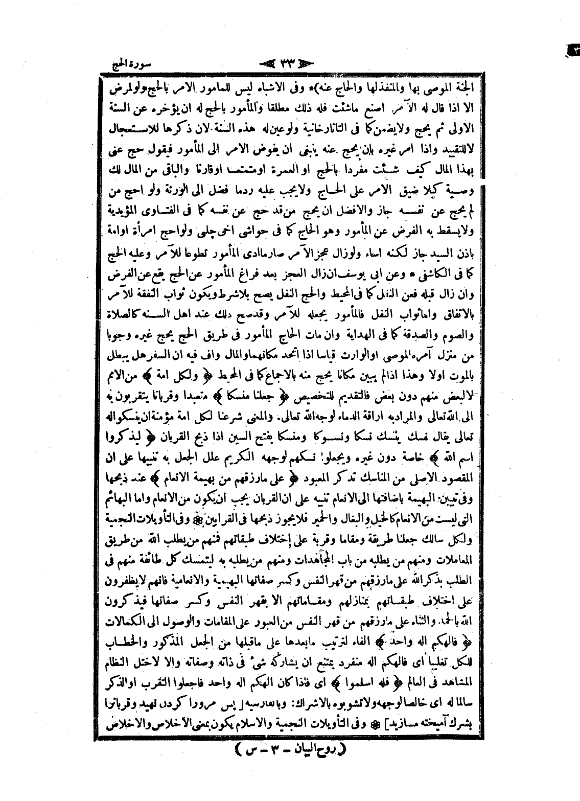 الجنة الموصى بها والمنفذ لها والحاج عنه) وفى الأشباه ليس للمامور الأمر بالحج ولو لمرض الا إذا قال له الآمر اصنع ما شئت فله ذلك مطلقا والمأمور بالحج له ان يؤخره عن السنة الاولى ثم يحج ولا يضمن كما فى التاتارخانية ولو عين له هذه السنة لان ذكرها للاستعجال لا للتقييد وإذا امر غيره بان يحج عنه ينبغى ان يفوض الأمر الى المأمور فيقول حج عنى بهذا المال كيف شئت مفردا بالحج او العمرة او متمتعا او قارنا والباقي من المال لك وصية كيلا ضيق الأمر على الحاج ولا يجب عليه ردما فضل الى الورثة ولو أحج من لم يحج عن نفسه جاز والأفضل ان يحج من قد حج عن نفسه كما فى الفتاوى المؤيدية ولا يسقط به الفرض عن المأمور وهو الحاج كما فى حواشى أخي چلبى ولو أحج امرأة او امة بإذن السيد جاز لكنه أساء ولو زال عجز الآمر صار ما ادى المأمور تطوعا للآمر وعليه الحج كما فى الكاشفى وعن ابى يوسف ان زال العجز بعد فراغ المأمور عن الحج يقع عن الفرض وان زال قبله فعن النفل كما فى المحيط والحج النفل يصح بلا شرط ويكون ثواب النفقة للآمر بالاتفاق واما ثواب النفل فالمأمور يجعله للآمر وقد صح ذلك عند اهل السنة كالصلاة والصوم والصدقة كما فى الهداية وان مات الحاج المأمور فى طريق الحج يحج غيره وجوبا من منزل آمره الموصى او الوارث قياسا إذا اتحد مكانهما والمال واف فيه ان السفر هل يبطل بالموت اولا وهذا إذا لم يبين مكانا يحج منه بالإجماع كما فى المحيط وَلِكُلِّ أُمَّةٍ من الأمم لا لبعض منهم دون بعض فالتقديم للتخصيص جَعَلْنا مَنْسَكاً متعبدا وقربانا يتقربون به الى الله تعالى والمراد به اراقة الدماء لوجه الله تعالى. والمعنى شرعنا لكل امة مؤمنة ان ينسكو اله تعالى يقال نسك ينسك نسكا ونسوكا ومنسكا بفتح السين إذا ذبح القربان لِيَذْكُرُوا اسْمَ اللَّهِ خاصة دون غيره ويجعلوا نسكهم لوجهه الكريم علل الجعل به تنبيها على ان المقصود الأصلي من المناسك تذكر المعبود عَلى ما رَزَقَهُمْ مِنْ بَهِيمَةِ الْأَنْعامِ عند ذبحها وفى تبيين البهيمة بإضافتها الى الانعام تنبيه على ان القربان يجب ان يكون من الانعام واما البهائم التي ليست من الانعام كالخيل والبغال والحمير فلا يجوز ذبحها فى القرابين وفى التأويلات النجمية ولكل سالك جعلنا طريقة ومقاما وقربة على اختلاف طبقاتهم فمنهم من يطلب الله من طريق المعاملات ومنهم من يطلبه من باب المجاهدات ومنهم من يطلبه به ليتمسك كل طائفة منهم فى الطلب بذكر الله على ما رزقهم من قهر النفس وكسر صفاتها البهيمية والانعامية فانهم لا يظفرون على اختلاف طبقاتهم بمنازلهم ومقاماتهم الا بقهر النفس وكسر صفاتها فيذكرون الله بالحمد والثناء على ما رزقهم من قهر النفس من العبور على المقامات والوصول الى الكمالات فَإِلهُكُمْ إِلهٌ واحِدٌ الفاء لترتيب ما بعدها على ما قبلها من الجعل المذكور والخطاب للكل تغليبا اى فالهكم اله منفرد يمتنع ان يشاركه شىء فى ذاته وصفاته والا لاختل النظام المشاهد فى العالم فَلَهُ أَسْلِمُوا اى فاذا كان إلهكم اله واحد فاجعلوا التقرب او الذكر سالما له اى خالصا لوجهه ولا تشوبوه بالاشراك: وبالفارسية [پس مرو را كردن نهيد وقربانرا بشرك آميخته مسازيد] وفى التأويلات النجمية والإسلام يكون بمعنى الإخلاص والإخلاص