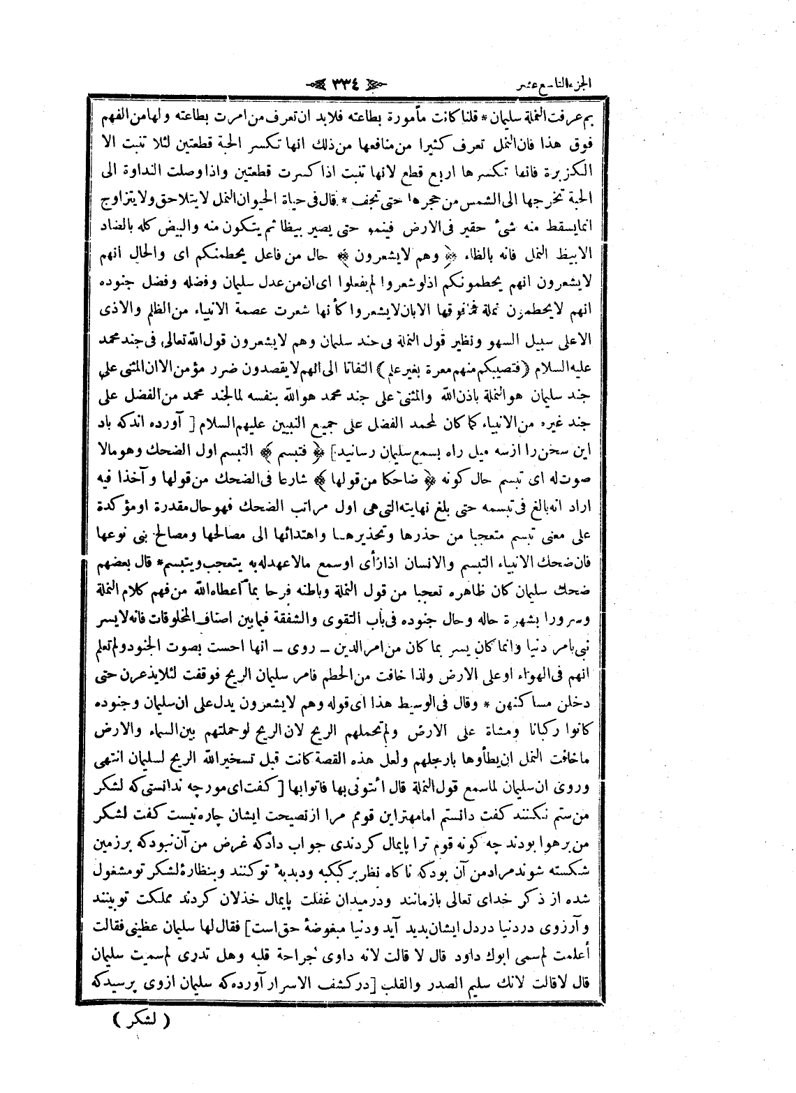 بم عرفت النملة سليمان قلنا كانت مأمورة بطاعته فلا بد ان تعرف من أمرت بطاعته ولها من الفهم فوق هذا فان النمل تعرف كثيرا من منافعها من ذلك انها تكسر الحبة قطعتين لئلا تنبت الا الكزبرة فانها تكسرها اربع قطع لانها تنبت إذا كسرت قطعتين وإذا وصلت النداوة الى الحبة تخرجها الى الشمس من حجرها حتى تجف قال فى حياة الحيوان النمل لا يتلاحق ولا يتزاوج انما يسقط منه شىء حقير فى الأرض فينمو حتى يصير بيظا ثم يتكون منه والبيض كله بالضاد إلا بيظ النمل فانه بالظاء وَهُمْ لا يَشْعُرُونَ حال من فاعل يحطمنكم اى والحال انهم لا يشعرون انهم يحطمونكم إذ لو شعروا لم يفعلوا اى ان من عدل سليمان وفضله وفضل جنوده انهم لا يحطمون نملة فما فوقها الا بان لا يشعروا كأنها شعرت عصمة الأنبياء من الظلم والأذى الأعلى سبيل السهو ونظير قول النملة فى حند سليمان وهم لا يشعرون قول الله تعالى فى جند محمد عليه السلام (فَتُصِيبَكُمْ مِنْهُمْ مَعَرَّةٌ بِغَيْرِ عِلْمٍ) التفاتا الى انهم لا يقصدون ضرر مؤمن الا ان المثنى على جند سليمان هو النملة بإذن الله والمثنى على جند محمد هو الله بنفسه لما لجند محمد من الفضل على جند غيره من الأنبياء كما كان لمحمد الفضل على جميع النبيين عليهم السلام [آورده اند كه باد اين سخن را از سه ميل راه بسمع سليمان رسانيد] فَتَبَسَّمَ التبسم أول الضحك وهو مالا صوت له اى تبسم حال كونه ضاحِكاً مِنْ قَوْلِها شارعا فى الضحك من قولها وآخذا فيه أراد انه بالغ فى تبسمه حتى بلغ نهايته التي هى أول مراتب الضحك فهو حال مقدرة او مؤكدة على معنى تبسم متعجبا من حذرها وتحذيرها واهتدائها الى مصالحها ومصالح بنى نوعها فان ضحك الأنبياء التبسم والإنسان إذا رأى او سمع ما لا عهد له به يتعجب ويتبسم قال بعضهم ضحك سليمان كان ظاهره تعجبا من قول النملة وباطنه فرحا بما أعطاه الله من فهم كلام النملة وسرورا بشهرة حاله وحال جنوده فى باب التقوى والشفقة فيما بين اصناف المخلوقات فانه لا يسر نبى بامر دنيا وانما كان يسر بما كان من امر الدين- روى- انها احست بصوت الجنود ولم تعلم انهم فى الهواء او على الأرض ولذا خافت من الحطم فامر سليمان الريح فوقفت لئلا يذعرن حتى دخلن مساكنهن وقال فى الوسيط هذا اى قوله وهم لا يشعرون يدل على ان سليمان وجنوده كانوا ركبانا ومشاة على الأرض ولم تحملهم الريح لان الريح لو حملتهم بين السماء والأرض ما خافت النمل ان يطأوها بأرجلهم ولعل هذه القصة كانت قبل تسخير الله الريح لسليمان انتهى وروى ان سليمان لما سمع قول النملة قال ائتوني بها فاتوا بها [كفت اى مورچهـ ندانستى كه لشكر من ستم نكنند كفت دانستم اما مهتر اين قومم مرا از نصيحت ايشان چاره نيست كفت لشكر من بر هوا بودند چهـ كونه قوم ترا پايمال كردندى جواب داد كه غرض من آن نبود كه بر زمين شكسته شوند مراد من آن بود كه ناكاه نظر بر كبكبه ودبدبه تو كنند وبنظاره لشكر تو مشغول شده از ذكر خداى تعالى باز مانند ودر ميدان غفلت پايمال خذلان كردند مملكت تو بينند وآرزوى در دنيا در دل ايشان پديد آيد ودنيا مبغوضه حق است] فقال لها سليمان عظينى فقالت أعلمت لم سمى أبوك داود قال لا قالت لانه داوى جراحة قلبه وهل تدرى لم سميت سليمان قال لا قالت لانك سليم الصدر والقلب [در كشف الاسرار آورده كه سليمان از وى پرسيد كه