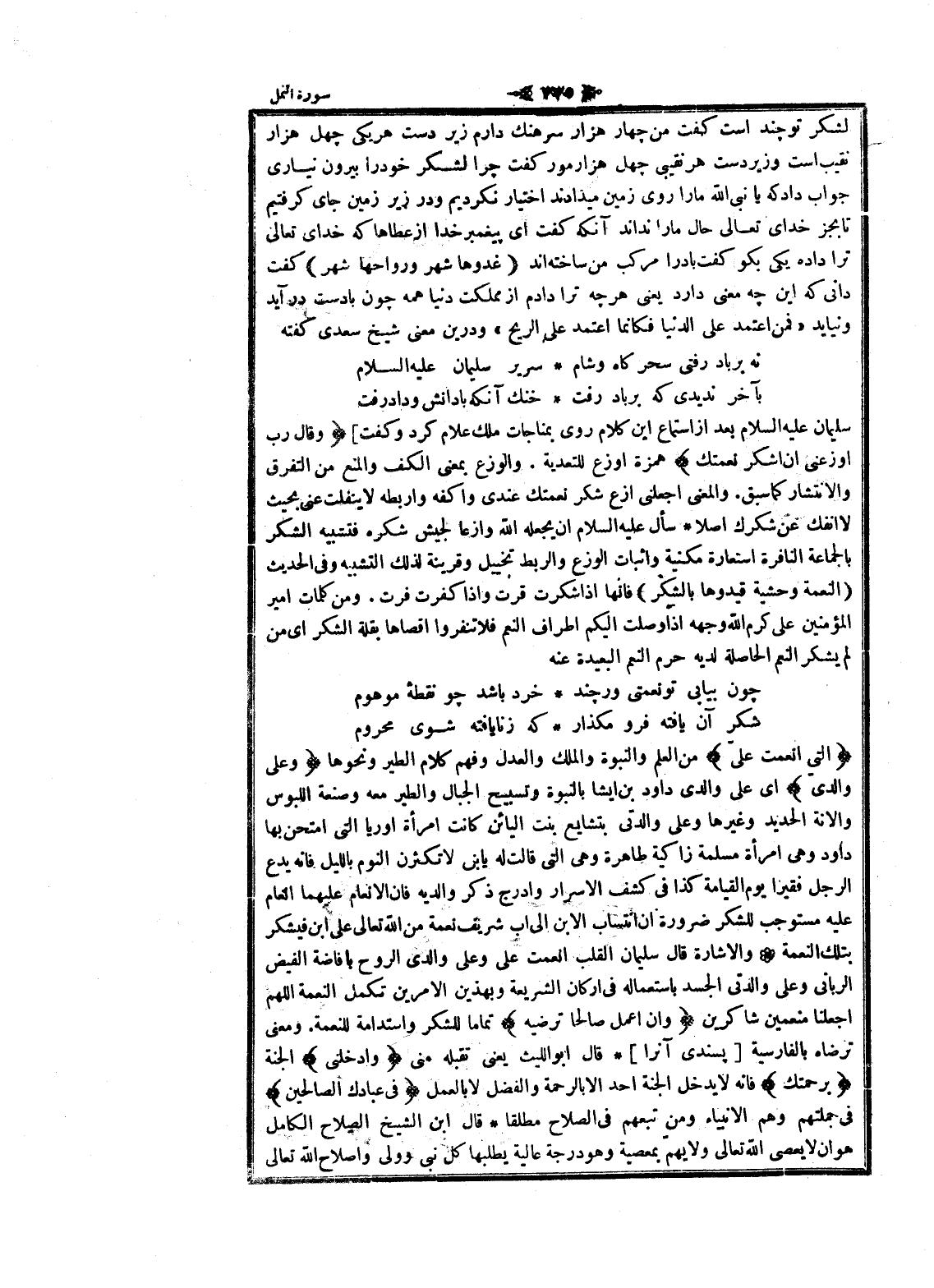 الَّتِي أَنْعَمْتَ عَلَيَّ من العلم والنبوة والملك والعدل وفهم كلام الطير ونحوها وَعَلى والِدَيَّ اى على والدي داود بن ايشا بالنبوة وتسبيح الجبال والطير معه وصنعة اللبوس وإلانة الحديد وغيرها وعلى والدتي بتشايع بنت اليائن كانت امرأة أوريا التي امتحن بها داود وهى امرأة مسلمة زاكية طاهرة وهى التي قالت له يا بنى لا تكثرن النوم بالليل فانه يدع الرجل فقيرا يوم القيامة كذا فى كشف الاسرار وأدرج ذكر والديه فان الانعام عليهما انعام عليه مستوجب للشكر ضرورة ان انتساب الابن الى اب شريف نعمة من الله تعالى على ابن فيشكر بتلك النعمة والاشارة قال سليمان القلب أنعمت على وعلى والدي الروح بافاضة الفيض الرباني وعلى والدتي الجسد باستعماله فى اركان الشريعة وبهذين الامرين تكمل النعمة اللهم اجعلنا منعمين شاكرين وَأَنْ أَعْمَلَ صالِحاً تَرْضاهُ تماما للشكر واستدامة للنعمة. ومعنى ترضاه بالفارسية [پسندى آنرا] قال ابو الليث يعنى تقبله منى وَأَدْخِلْنِي الجنة بِرَحْمَتِكَ فانه لا يدخل الجنة أحد الا بالرحمة والفضل لا بالعمل فِي عِبادِكَ الصَّالِحِينَ فى جملتهم وهم الأنبياء ومن تبعهم فى الصلاح مطلقا قال ابن الشيخ الصلاح الكامل هو ان لا يعصى الله تعالى ولا يهمّ بمعصية وهو درجة عالية يطلبها كل نبى وولى وإصلاح الله تعالى