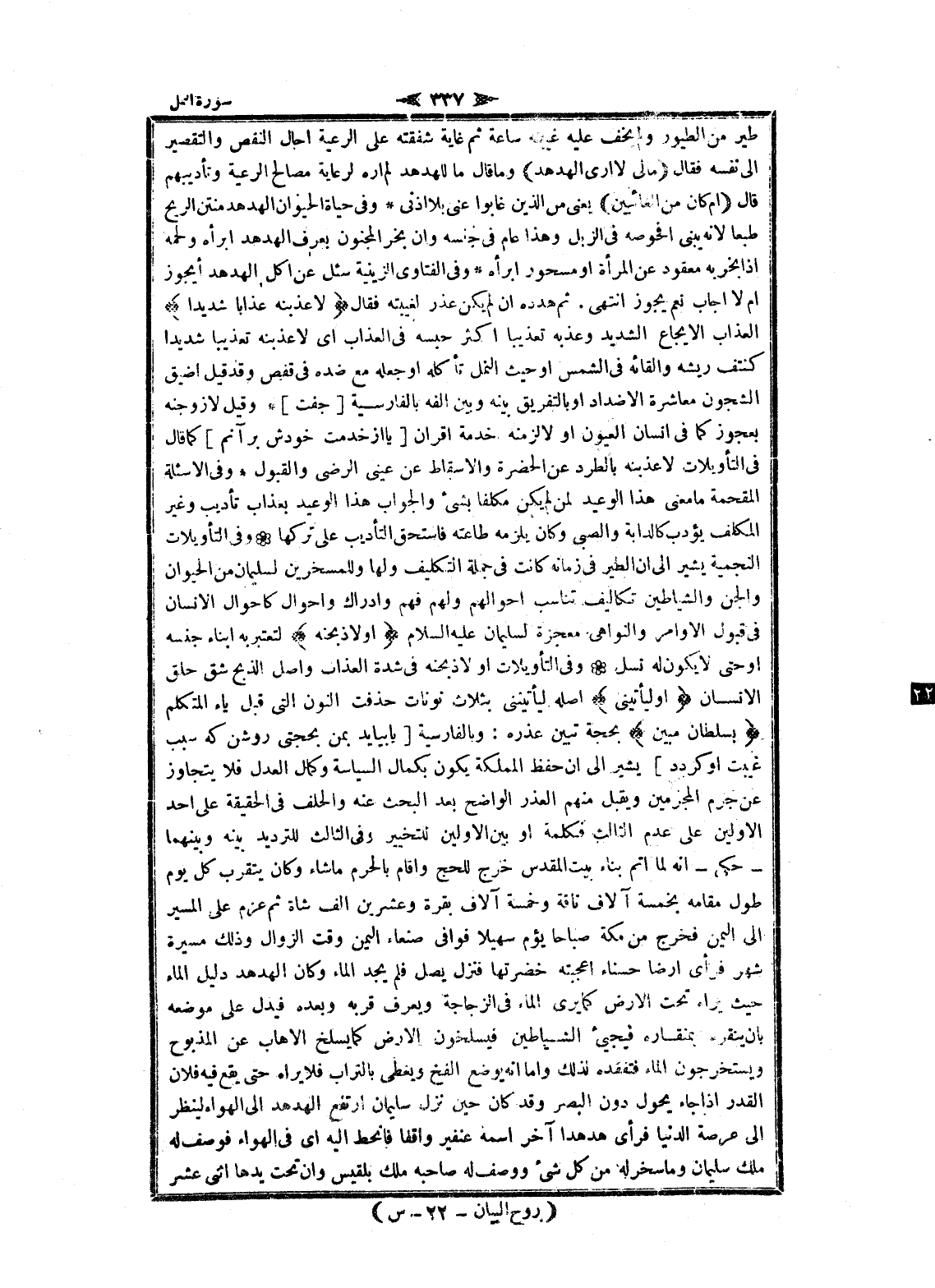 طير من الطيور ولم يخف عليه غيبته ساعة ثم غاية شفقته على الرعية أحال النقص والتقصير الى نفسه فقال (ما لِيَ لا أَرَى الْهُدْهُدَ) وما قال ما للهدهد لم أره لرعاية مصالح الرعية وتأديبهم قال (أَمْ كانَ مِنَ الْغائِبِينَ) يعنى من الذين غابوا عنى بلا اذنى وفى حياة الحيوان الهدهد منتن الريح طبعا لانه يبنى افحوصه فى الزبل وهذا عام فى جنسه وان بخر المجنون بعرف الهدهد ابرأه ولحمه إذا بخر به معقود عن المرأة او مسحور ابرأه وفى الفتاوى الزينية سئل عن أكل الهدهد أيجوز أم لا أجاب نعم يجوز انتهى. ثم هدده ان لم يكن عذر لغيبته فقال لَأُعَذِّبَنَّهُ عَذاباً شَدِيداً العذاب الايجاع الشديد وعذبه تعذيبا اكثر حبسه فى العذاب اى لاعذبنه تعذيبا شديدا كنتف ريشه والقائه فى الشمس او حيث النمل تأكله او جعله مع ضده فى قفص وقد قيل أضيق الشجون معاشرة الاضداد او بالتفريق بينه وبين الفه بالفارسية [جفت] وقيل لازوجنه بعجوز كما فى انسان العيون او لا لزمنه خدمة اقران [يا از خدمت خودش بر آنم] كما قال فى التأويلات لاعذبنه بالطرد عن الحضرة والاسقاط عن عينى الرضى والقبول وفى الاسئلة المقحمة ما معنى هذا الوعيد لمن لم يكن مكلفا بشىء والجواب هذا الوعيد بعذاب تأديب وغير المكلف يؤدب كالدابة والصبى وكان يلزمه طاعته فاستحق التأديب على تركها وفى التأويلات النجمية يشير الى ان الطير فى زمانه كانت فى جملة التكليف ولها وللمسخرين لسليمان من الحيوان والجن والشياطين تكاليف تناسب أحوالهم ولهم فهم وادراك واحوال كاحوال الإنسان فى قبول الأوامر والنواهي معجزة لسليمان عليه السلام أَوْ لَأَذْبَحَنَّهُ لتعتبر به أبناء جنسه او حتى لا يكون له نسل وفى التأويلات او لاذبحنه فى شدة العذاب واصل الذبح شق حلق الإنسان أَوْ لَيَأْتِيَنِّي أصله ليأتيننى بثلاث نونات حذفت النون التي قبل ياء المتكلم بِسُلْطانٍ مُبِينٍ بحجة تبين عذره: وبالفارسية [يا بيايد بمن بحجتي روشن كه سبب غيبت او كردد] يشير الى ان حفظ المملكة يكون بكمال السياسة وكمال العدل فلا يتجاوز عن جرم المجرمين ويقبل منهم العذر الواضح بعد البحث عنه والحلف فى الحقيقة على أحد الأولين على عدم الثالث فكلمة او بين الأولين للتخيير وفى الثالث للترديد بينه وبينهما- حكى- انه لما أتم بناء بيت المقدس خرج للحج واقام بالحرم ما شاء وكان يتقرب كل يوم طول مقامه بخمسة آلاف ناقة وخمسة آلاف بقرة وعشرين الف شاة ثم عزم على المسير الى اليمن فخرج من مكة صباحا يؤم سهيلا فوافى صنعاء اليمن وقت الزوال وذلك مسيرة شهر فرأى أرضا حسناء أعجبته خضرتها فنزل يصل فلم يجد الماء وكان الهدهد دليل الماء حيث يراه تحت الأرض كما يرى الماء فى الزجاجة ويعرف قربه وبعده فيدل على موضعه بان ينقره بمنقاره فيجيىء الشياطين فيسلخون الأرض كما يسلخ الإهاب عن المذبوح ويستخرجون الماء فتفقده لذلك واما انه يوضع الفخ ويغطى بالتراب فلا يراه حتى يقع فيه فلان القدر إذا جاء يحول دون البصر وقد كان حين نزل سليمان ارتفع الهدهد الى الهواء لينظر الى عرصة الدنيا فرأى هدهد آخر اسمه عنفير واقفا فانحط اليه اى فى الهواء فوصف له ملك سليمان وما سخر له من كل شىء ووصف له صاحبه ملك بلقيس وان تحت يدها اثنى عشر