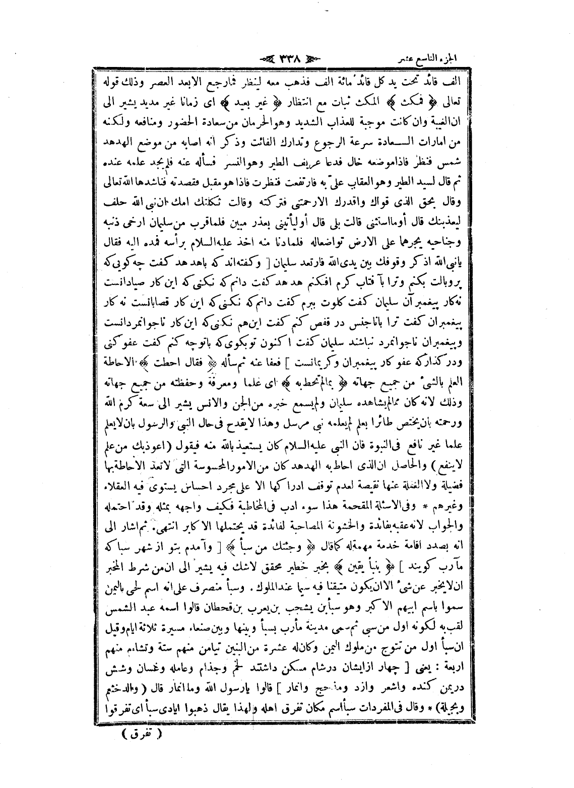 الف قائد تحت يد كل قائد مائة الف فذهب معه لينظر فما رجع الا بعد العصر وذلك قوله تعالى فَمَكَثَ المكث ثبات مع انتظار غَيْرَ بَعِيدٍ اى زمانا غير مديد يشير الى ان الغيبة وان كانت موجبة للعذاب الشديد وهو الحرمان من سعادة الحضور ومنافعه ولكنه من امارات السعادة سرعة الرجوع وتدارك الفائت وذكر انه أصابه من موضع الهدهد شمس فنظر فاذا موضعه خال فدعا عريف الطير وهو النسر فسأله عنه فلم يجد علمه عنده ثم قال لسيد الطير وهو العقاب علىّ به فارتفعت فنظرت فاذا هو مقبل فقصدته فناشدها الله تعالى وقال بحق الذي قواك وأقدرك الا رحمتنى فتركته وقالت ثكلتك أمك ان نبى الله حلف ليعذبنك قال أو ما استثنى قالت بلى قال أو ليأتينى بعذر مبين فلما قرب من سليمان ارخى ذنبه وجناحيه يجرهما على الأرض تواضعا له فلما دنا منه أخذ عليه السلام برأسه فمده اليه فقال يا نبى الله اذكر وقوفك بين يدى الله فارتعد سليمان [وكفته اند كه با هدهد كفت چهـ كويى كه پر وبالت بكنم وترا بآفتاب گرم افكنم هدهد كفت دانم كه نكنى كه اين كار صيادانست نه كار پيغمبر آن سليمان كفت كلوت ببرم كفت دانم كه نكنى كه اين كار قصابانست نه كار پيغمبران كفت ترا با ناجنس در قفص كنم كفت اين هم نكنى كه اين كار نا جوانمردانست و پيغمبران نا جوانمرد نباشند سليمان كفت اكنون تو بكوى كه با تو چهـ كنم كفت عفو كنى ودر كذار كه عفو كار پيغمبران وكريمانست] فعفا عنه ثم سأله فَقالَ أَحَطْتُ الإحاطة العلم بالشيء من جميع جهاته بِما لَمْ تُحِطْ بِهِ اى علما ومعرفة وحفظته من جميع جهاته وذلك لانه كان مما لم يشاهده سليمان ولم يسمع خبره من الجن والانس يشير الى سعة كرم الله ورحمته بان يختص طائرا بعلم لم يعلمه نبى مرسل وهذا لا يقدح فى حال النبي والرسول بان لا يعلم علما غير نافع فى النبوة فان النبي عليه السلام كان يستعيذ بالله منه فيقول (أعوذ بك من علم لا ينفع) والحاصل ان الذي أحاط به الهدهد كان من الأمور المحسوسة التي لا تعد الإحاطة بها فضيلة ولا الغفلة عنها نقيصة لعدم توقف إدراكها الا على مجرد احساس يستوى فيه العقلاء وغيرهم وفى الاسئلة المقحمة هذا سوء ادب فى المخاطبة فكيف واجهه بمثله وقد احتمله والجواب لانه عقبه بفائدة والخشونة المصاحبة لفائدة قد يحتملها الأكابر انتهى. ثم أشار الى انه بصدد اقامة خدمة مهمة له كما قال وَجِئْتُكَ مِنْ سَبَإٍ [وآمدم بتو از شهر سبا كه مآرب كويند] بِنَبَإٍ يَقِينٍ بخبر خطير محقق لا شك فيه يشير الى ان من شرط المخبر ان لا يخبر عن شىء الا ان يكون متيقنا فيه سيما عند الملوك. وسبأ منصر على انه اسم لحى باليمن سموا باسم أبيهم الأكبر وهو سبأ بن يشجب بن يعرب بن قحطان قالوا اسمه عبد الشمس لقب به لكونه أول من سبى ثم سمى مدينة مأرب بسبأ وبينها وبين صنعاء مسيرة ثلاثة ايام وقيل ان سبأ أول من تتوج من ملوك اليمن وكان له عشرة من البنين تيامن منهم ستة وتشاءم منهم اربعة: يعنى [چهار از ايشان در شام مسكن داشتند لخم وجذام وعامله وغسان وشش در يمن كنده وأشعر وأزد ومذحج وانمار] قالوا يا رسول الله وما انمار قال (والد خثعم وبجيلة) وقال فى المفردات سبأ اسم مكان تفرق اهله ولهذا يقال ذهبوا أيادي سبأ اى تفرقوا