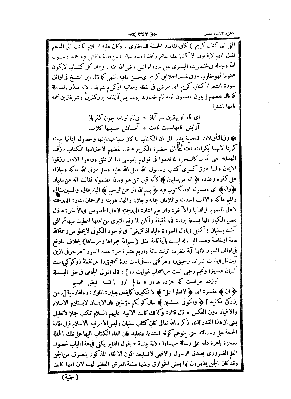 وفى التأويلات النجمية يشير الى ان الكتاب لما كان سببا لهدايتها وحصول إيمانها سمته كريما لانها بكرامته اهتدت الى حضرة الكريم قال بعضهم لاحترامها الكتاب رزقت الهداية حتى آمنت كالسحرة لما قدموا فى قولهم يا موسى اما ان تلقى وراعوا الأدب رزقوا الايمان ولما مزق كسرى كتاب رسول الله صلى الله عليه وسلم مزق الله ملكه وجازاه على كفره وعناده إِنَّهُ مِنْ سُلَيْمانَ كأنه قيل ممن هو وماذا مضمونه فقالت انه من سليمان وَإِنَّهُ اى مضمونه او المكتوب فيه بِسْمِ اللَّهِ الرَّحْمنِ الرَّحِيمِ الباء بقاؤه والسين سناؤه والميم ملكه والالف أحديته واللامان جماله وجلاله والهاء هويته والرحمان اشارة الى رحمته لاهل العموم فى الدنيا والآخرة والرحيم اشارة الى رحمته لاهل الخصوص فى الآخرة قال بعض الكبار انها بسملة براءة فى الحقيقة ولكن لما وقع التبري من أهلها أعطيت للبهائم التي آمنت بسليمان واكتفى فى أول السورة بالباء إذ كل شىء فى الوجود الكونى لا يخلو من رحمة الله عامة او خاصة وهذه البسملة ليست بآية تامة مثل (بِسْمِ اللَّهِ مَجْراها وَمُرْساها) بخلاف ما وقع فى أوائل السور فانها آية منفردة نزلت مائة واربع عشرة مرة عدد السور [هر حرفى ازين آيت ظرفى است شراب رحيق را وهر كلمتى صدفى است دره تحقيق را هر نقطه زو كوكبى است آسمان هدايترا ونجم رجمى است مر اصحاب غوايت را] : قال المولى الجامى فى حق البسملة
