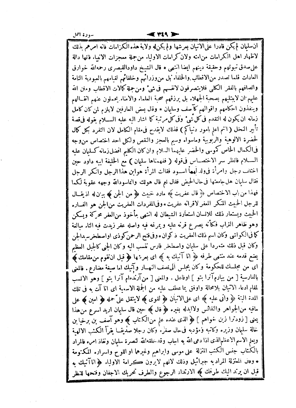 ان سليمان لم يكن قادرا على الإتيان بعرشها ولم يكن له ولاية هذه الكرامات فانه أمرهم بذلك لاظهار اهل الكرامات من أمته ولان كرامات الأولياء من جملة معجزات الأنبياء فانها دالة على صدق نبوتهم وحقيقة دينهم ايضا انتهى قال الشيخ داود القيصري رحمه الله خوارق العادات قلما تصدر من الاقطاب والخلفاء بل من وزرائهم وخلفائهم لقيامهم بالعبودية التامة واتصافهم بالفقر الكلى فلا يتصرفون لانفسهم فى شىء ومن جملة كمالات الاقطاب ومنن الله عليهم ان لا يبتليهم بصحبة الجهلاء بل يرزقهم صحبة العلماء والأمناء يحملون عنهم اثقالهم وينفذون أحكامهم وأقوالهم كآصف وسليمان وقال بعض العارفين لا يلزم لمن كان كامل زمانه ان يكون له التقدم فى كل شىء وفى كل مرتبة كما أشار اليه عليه السلام بقوله فى قصة تأبير النخل (أنتم اعلم بامور دنياكم) فذلك لا يقدح فى مقام الكامل لان التفرد بكل كمال لحضرة الالوهية والربوبية وما سواه وسيم بالعجز والنقص ولكل أحد اختصاص من وجه فى الكمال الخاص كموسى والخضر عليهما السلام وان كان الكليم أفضل زمانه كسليمان عليه السلام فانظر سر الاختصاص فى قوله (فَفَهَّمْناها سُلَيْمانَ) مع الخليفة أبيه داود حين اختلف رجل وامرأة فى ولد لهما اسود فقالت المرأة هو ابن هذا الرجل وأنكر الرجل فقال سليمان هل جامعتها فى حال الحيض فقال نعم قال هو لك وانما سود الله وجهه عقوبة لكما فهذا من باب الاختصاص قالَ عِفْرِيتٌ مارد خبيث مِنَ الْجِنِّ بيان له إذ يقال للرجل الخبيث المنكر المعفر لاقرانه عفريت وفى المفردات العفريت من الجن هو الفاره الخبيث ويستعار ذلك للانسان استعارة الشيطان له انتهى مأخوذ من العفر محركة ويسكن وهو ظاهر التراب فكأنه يصرع قرنه عليه ويمرغه فيه وأصله عفر زيدت فيه التاء مبالغة كما فى الكواشي وكان اسم ذلك العفريت ذكوان وفى فتح الرحمن كوذى او إصطخر سيد الجن وكان قبل ذلك متمردا على سليمان وإصطخر فارس تنسب اليه وكان الجنى كالجبل العظيم يضع قدمه عند منتهى طرفه أَنَا آتِيكَ بِهِ اى بعرشها قَبْلَ أَنْ تَقُومَ مِنْ مَقامِكَ اى من مجلسك للحكومة وكان يجلس الى نصف النهار وآتيك اما صيغة مضارع. فالمعنى بالفارسية [من بيارم آنرا بتو] او فاعل. والمعنى [من آرنده ام آنرا بتو] وهو الأنسب لمقام ادعاء الإتيان بلا محالة وأوفق بما عطف عليه من الجملة الاسمية اى انا آت به فى تلك المدة البتة وَإِنِّي عَلَيْهِ اى على الإتيان لَقَوِيٌّ لا يثقل علىّ حمله أَمِينٌ على ما فيه من الجواهر والنفائس ولا ابد له بغيره قالَ حين قال سليمان أريد اسرع من هذا يعنى [زودترا زين خواهم] الَّذِي عِنْدَهُ عِلْمٌ مِنَ الْكِتابِ وهو آصف بن برخيا بن خالة سليمان وزيره وكاتبه ومؤدبه فى حال صغره وكان رجلا صديقا يقرأ الكتب الالهية ويعلم الاسم الأعظم الذي إذا دعى الله به أجاب وقد خلقه الله لنصرة سليمان ونفاذ امره فالمراد بالكتاب جنس الكتب المنزلة على موسى وابراهيم وغيرهما او اللوح وأسراره المكتومة وقال المعتزلة المراد به جبرائيل وذلك لانهم لا يرون كرامة الأولياء أَنَا آتِيكَ بِهِ قَبْلَ أَنْ يَرْتَدَّ إِلَيْكَ طَرْفُكَ الارتداد الرجوع والطرف تحريك الأجفان وفتحها للنظر