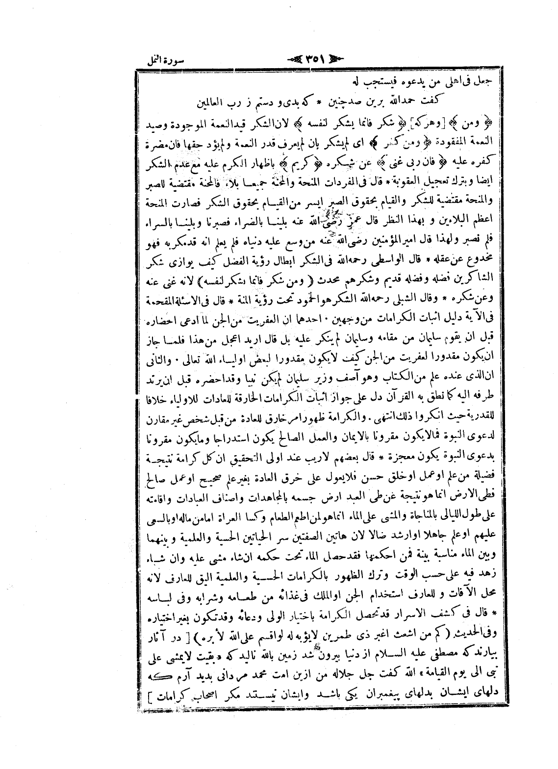 وَمَنْ [وهر كه] شَكَرَ فَإِنَّما يَشْكُرُ لِنَفْسِهِ لان الشكر قيد النعمة الموجودة وصيد النعمة المفقودة وَمَنْ كَفَرَ اى لم يشكر بان لم يعرف قدر النعمة ولم يؤد حقها فان مضرة كفره عليه فَإِنَّ رَبِّي غَنِيٌّ عن شكره كَرِيمٌ بإظهار الكرم عليه مع عدم الشكر ايضا وبترك تعجيل العقوبة قال فى المفردات المنحة والمحنة جميعا بلاء فالمحنة مقتضية للصبر والمنحة مقتضية للشكر والقيام بحقوق الصبر أيسر من القيام بحقوق الشكر فصارت المنحة أعظم البلاءين وبهذا النظر قال عمر رضى الله عنه بلينا بالضراء فصبرنا وبلينا بالسراء فلم نصبر ولهذا قال امير المؤمنين رضى الله عنه من وسع عليه دنياه فلم يعلم انه قد مكر به فهو مخدوع عن عقله قال الواسطي رحمه الله فى الشكر ابطال رؤية الفضل كيف يوازى شكر الشاكرين فضله وفضله قديم وشكرهم محدث (وَمَنْ شَكَرَ فَإِنَّما يَشْكُرُ لِنَفْسِهِ) لانه غنى عنه وعن شكره وقال الشبلي رحمه الله الشكر هو الخمود تحت رؤية المنة قال فى الاسئلة المقحمة فى الآية دليل اثبات الكرامات من وجهين. أحدهما ان العفريت من الجن لما ادعى احضاره قبل ان يقوم سليمان من مقامه وسليمان لم ينكر عليه بل قال أريد اعجل من هذا فلما جاز ان يكون مقدورا لعفريت من الجن كيف لا يكون مقدورا لبعض اولياء الله تعالى. والثاني ان الذي عنده علم من الكتاب وهو آصف وزير سليمان لم يكن نبيا وقد أحضره قبل ان يرتد طرفه اليه كما نطق به القرآن دل على جواز اثبات الكرامات الخارقة للعادات للاولياء خلافا للقدرية حيث أنكروا ذلك انتهى. والكرامة ظهور امر خارق للعادة من قبل شخص غير مقارن لدعوى النبوة فما لا يكون مقرونا بالايمان والعمل الصالح يكون استدراجا وما يكون مقرونا بدعوى النبوة يكون معجزة قال بعضهم لا ريب عند اولى التحقيق ان كل كرامة نتيجة فضيلة من علم او عمل او خلق حسن فلا يعول على خرق العادة بغير علم صحيح او عمل صالح فطى الأرض انما هو نتيجة عن طى العبد ارض جسمه بالمجاهدات واصناف العبادات وإقامته على طول الليالى بالمناجاة والمشي على الماء انما هو لمن اطعم الطعام وكسا العراة اما من ماله او بالسعي عليهم او علم جاهلا او ارشد ضالا لان هاتين الصفتين سر الحياتين الحسية والعلمية وبينهما وبين الماء مناسبة بينة فمن أحكمها فقد حصل الماء تحت حكمه ان شاء مشى عليه وان شاء زهد فيه على حسب الوقت وترك الظهور بالكرامات الحسية والعلمية أليق للعارف لانه محل الآفات وللعارف استخدام الجن او الملك فى غذائه من طعامه وشرابه وفى لباسه قال فى كشف الاسرار قد تحصل الكرامة باختيار الولي ودعائه وقد تكون بغير اختياره وفى الحديث (كم من اشعث اغبر ذى طمرين لا يؤبه له لو اقسم على الله لأبره) [در آثار بيارند كه مصطفى عليه السلام از دنيا بيرون شد زمين بالله ناليد كه «بقيت لا يمشى على نبى الى يوم القيامة» الله كفت جل جلاله من ازين امت محمد مردانى پديد آرم كه دلهاى ايشان بدلهاى پيغمبران يكى باشد وايشان نيستند مكر اصحاب كرامات]