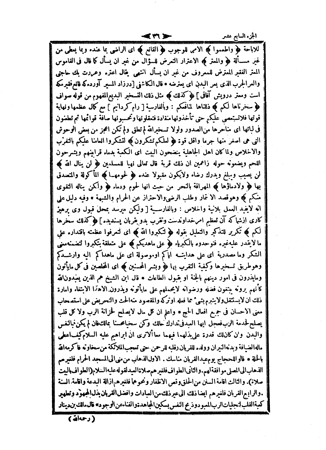 للاباحة وَأَطْعِمُوا الأمر للوجوب الْقانِعَ اى الراضي بما عنده وبما يعطى من غير مسألة وَالْمُعْتَرَّ الاعترار التعرض للسؤال من غير ان يسأل كما قال فى القاموس المعتر الفقير المعترض للمعروف من غير ان يسأل انتهى يقال اعتره وعررت بك حاجتى والعر الجرب الذي يعر البدن اى يعترضه قال الكاشفى [در زاد المسير آورده كه قانع فقير مكه است ومعتر درويش آفاقى] كَذلِكَ مثل ذلك التسخير البديع المفهوم من قوله صواف سَخَّرْناها لَكُمْ ذللناها لمنافعكم: وبالفارسية [رام كردانيم] مع كمال عظمها ونهاية قوتها فلا تستعصى عليكم حتى تأخذونها منقادة فتعقلونها وتحسبونها صافة قوائمها ثم تطعنون فى لباتها اى مناحرها من الصدور ولولا تسخير الله لم تطق ولم تكن أعجز من بعض الوحوش التي هى أصغر منها جرما واقل قوة لَعَلَّكُمْ تَشْكُرُونَ لتشكروا إنعامنا عليكم بالتقرب والإخلاص ولما كان اهل الجاهلية ينضحون البيت اى الكعبة بدماء قرابينهم ويشرحون اللحم ويضعونه حوله زاعمين ان ذلك قربة قال تعالى نهيا للمسلمين لَنْ يَنالَ اللَّهَ لن يصيب ويبلغ ويدرك رضاه ولا يكون مقبولا عنده لُحُومُها المأكولة والمتصدق بها وَلا دِماؤُها المهراقة بالنحر من حيث انها لحوم ودماء وَلكِنْ يَنالُهُ التَّقْوى مِنْكُمْ وهو قصد الايتمار وطلب الرضى والاحتراز عن الحرام والشبهة وفيه دليل على انه لا يفيد العمل بلا نية واخلاص: وبالفارسية [وليكن ميرسد بمحل قبول وى پرهيز كارى از شما كه آن تعظيم امر خداوندست وتقرب بدو بقربان پسنديده] كَذلِكَ سَخَّرَها لَكُمْ تكرير للتذكير والتعليل بقوله لِتُكَبِّرُوا اللَّهَ اى لتعرفوا عظمته باقتداره على ما لا يقدر عليه غيره فتوحدوه بالكبرياء عَلى ما هَداكُمْ على متعلقة بتكبروا لتضمنه معنى الشكر وما مصدرية اى على هدايته إياكم او موصولة اى على ما هداكم اليه وأرشدكم وهو طريق تسخيرها وكيفية التقرب بها وَبَشِّرِ الْمُحْسِنِينَ اى المخلصين فى كل ما يأتون وما يذرون فى امور دينهم بالجنة او بقبول الطاعات قال ابن الشيخ هم الذين يعبدون الله كأنهم يرونه يبتغون فضله ورضوانه لا يحملهم على ما يأتونه ويذرون الا هذا الابتغاء وامارة ذلك ان لا يستثقل ولا يتبرم بشىء مما فعله او تركه والمقصود منه الحث والتحريض على استصحاب معنى الإحسان فى جميع افعال الحج واعلم ان كل مال لا يصلح لخزانة الرب ولا كل قلب يصلح لخدمة الرب فعجل ايها العبد فى تدارك حالك وكن سخيا محسنا بمالك فان لم يكن فبالنفس والبدن وان كان لك قدرة على بذلهما فيهما معا ألا ترى ان ابراهيم عليه السلام كيف اعطى ماله الضيافة وبدنه النيران وولده للقربان وقلبه للرحمن حتى تعجب الملائكة من سخاوته فاكرمه الله بالخلة قالوا للحجاج يوم عيد القربان مناسك. الاول الذهاب من منى الى المسجد الحرام فلغيرهم الذهاب الى المصلى موافقة لهم. والثاني الطواف فلغيرهم صلاة العيد لقوله عليه السلام (الطواف بالبيت صلاة) . والثالث اقامة السنن من الحلق وقص الأظفار ونحوهما فلغيرهم ازالة البدعة واقامة السنة. والرابع القربان فلغيرهم ايضا ذلك الى غير ذلك من العبادات وأفضل القربان بذل المجهود وتطهير كعبة القلب لتجليات الرب المعبود وذبح النفس بسكين المجاهدة والفناء عن الوجود قال مالك بن دينار