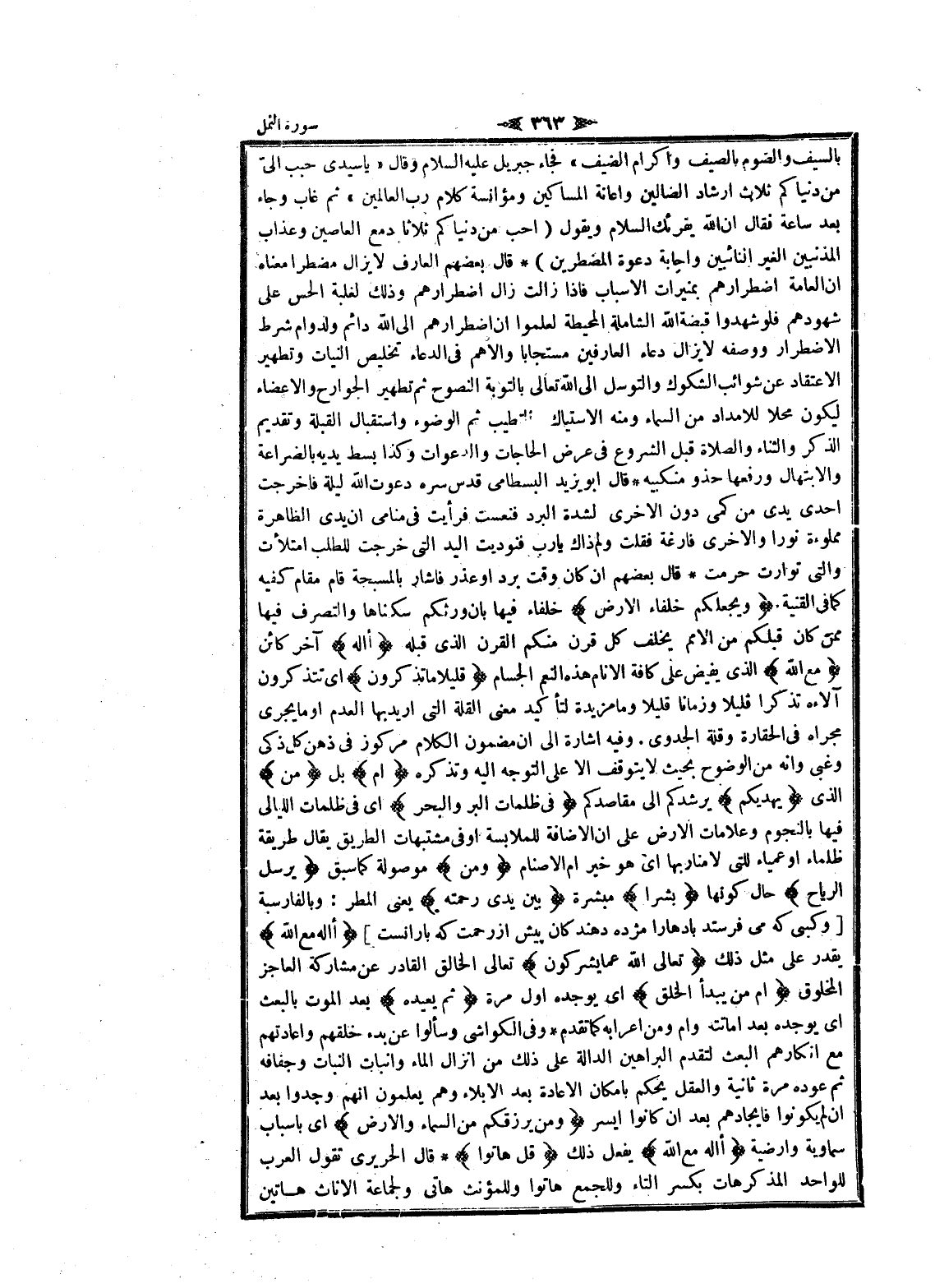بالسيف والصوم بالصيف وإكرام الضيف» فجاء جبريل عليه السلام وقال «يا سيدى حبب الىّ من دنياكم ثلاث ارشاد الضالين واعانة المساكين ومؤانسة كلام رب العالمين» ثم غاب وجاء بعد ساعة فقال ان الله يقرئك السلام ويقول (أحب من دنياكم ثلاثا دمع العاصين وعذاب المذنبين الغير التائبين واجابة دعوة المضطرين) قال بعضهم العارف لا يزال مضطرا معناه ان العامة اضطرارهم بمنيرات الأسباب فاذا زالت زال اضطرارهم وذلك لغلبة الحس على شهودهم فلو شهدوا قبضة الله الشاملة المحيطة لعلموا ان اضطرارهم الى الله دائم ولدوام شرط الاضطرار ووصفه لا يزال دعاء العارفين مستجابا والأهم فى الدعاء تخليص النيات وتطهير الاعتقاد عن شوائب الشكوك والتوسل الى الله تعالى بالتوبة النصوح ثم تطهير الجوارح والأعضاء ليكون محلا للامداد من السماء ومنه الاستياك والتطيب ثم الوضوء واستقبال القبلة وتقديم الذكر والثناء والصلاة قبل الشروع فى عرض الحاجات والدعوات وكذا بسط يديه بالضراعة والابتهال ورفعها حذو منكبيه قال ابو يزيد البسطامي قدس سره دعوت الله ليلة فاخرجت احدى يدى من كمى دون الاخرى لشدة البرد فنعست فرأيت فى منامى ان يدى الظاهرة مملوءة نورا والاخرى فارغة فقلت ولم ذاك يا رب فنوديت اليد التي خرجت للطلب امتلأت والتي توارت حرمت قال بعضهم ان كان وقت برد او عذر فاشار بالمسبحة قام مقام كفيه كما فى القنية وَيَجْعَلُكُمْ خُلَفاءَ الْأَرْضِ خلفاء فيها بان ورثكم سكناها والتصرف فيها ممن كان قبلكم من الأمم يخلف كل قرن منكم القرن الذي قبله أَإِلهٌ آخر كائن مَعَ اللَّهِ الذي يفيض على كافة الأنام هذه النعم الجسام قَلِيلًا ما تَذَكَّرُونَ اى تتذكرون آلاءه تذكرا قليلا وزمانا قليلا وما مزيدة لتأكيد معنى القلة التي أريد بها العدم او ما يجرى مجراه فى الحقارة وقلة الجدوى. وفيه اشارة الى ان مضمون الكلام مركوز فى ذهن كل ذكى وغبى وانه من الوضوح بحيث لا يتوقف الا على التوجه اليه وتذكره ام بل أَمَّنْ الذي يَهْدِيكُمْ يرشدكم الى مقاصدكم فِي ظُلُماتِ الْبَرِّ وَالْبَحْرِ اى فى ظلمات الليالى فيها بالنجوم وعلامات الأرض على ان الاضافة للملابسة او فى مشتبهات الطريق يقال طريقة ظلماء او عمياء للتى لا مناربها اى هو خير أم الأصنام وَمَنْ موصولة كما سبق يُرْسِلُ الرِّياحَ حال كونها بُشْراً مبشرة بَيْنَ يَدَيْ رَحْمَتِهِ يعنى المطر: وبالفارسية [وكسى كه مى فرستد بادها را مژده دهندكان پيش از رحمت كه بارانست] أَإِلهٌ مَعَ اللَّهِ يقدر على مثل ذلك تَعالَى اللَّهُ عَمَّا يُشْرِكُونَ تعالى الخالق القادر عن مشاركة العاجز المخلوق أَمَّنْ يَبْدَؤُا الْخَلْقَ اى يوجده أول مرة ثُمَّ يُعِيدُهُ بعد الموت بالبعث اى يوجده بعد اماتته وأم ومن إعرابه كما تقدم وفى الكواشي وسألوا عن بدء خلقهم واعادتهم مع انكارهم البعث لتقدم البراهين الدالة على ذلك من إنزال الماء وإنبات النبات وجفافه ثم عوده مرة ثانية والعقل يحكم بامكان الاعادة بعد الإبلاء وهم يعلمون انهم وجدوا بعد ان لم يكونوا فايجادهم بعد ان كانوا أيسر وَمَنْ يَرْزُقُكُمْ مِنَ السَّماءِ وَالْأَرْضِ اى بأسباب سماوية وارضية أَإِلهٌ مَعَ اللَّهِ يفعل ذلك قُلْ هاتُوا قال الحريري تقول العرب للواحد المذكر هات بكسر التاء وللجمع هاتوا وللمؤنث هاتى ولجماعة الإناث هاتين