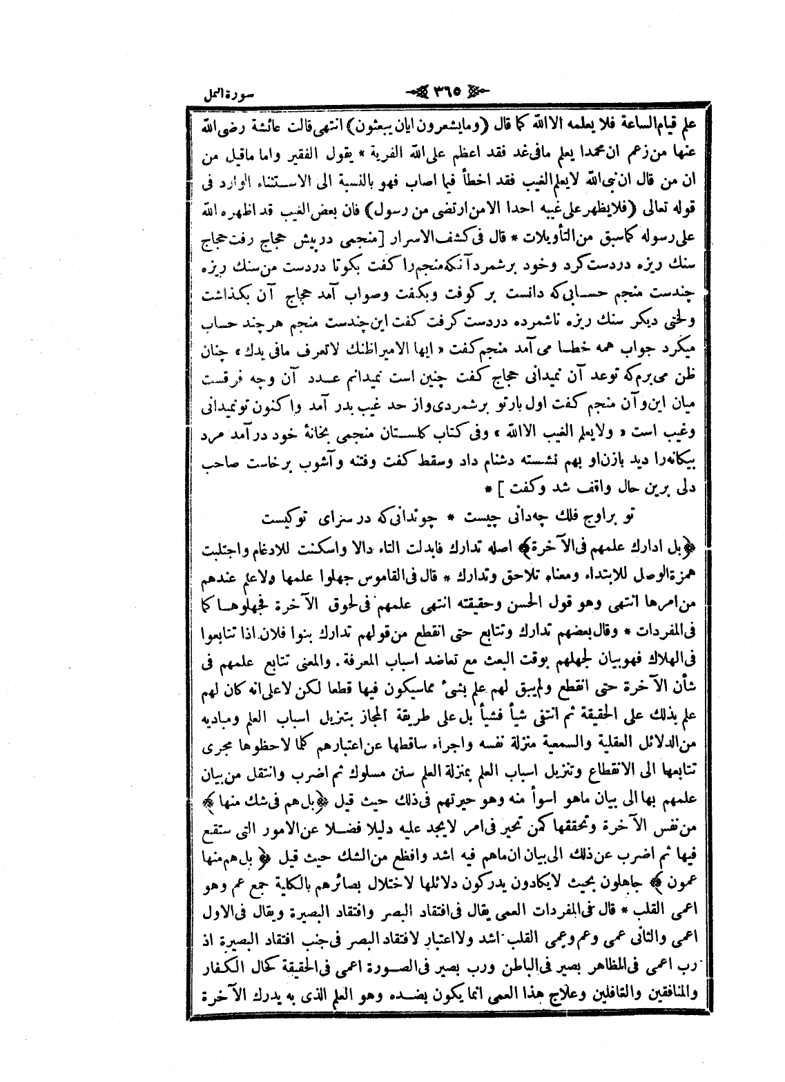 علم قيام الساعة فلا يعلمه الا الله كما قال (وَما يَشْعُرُونَ أَيَّانَ يُبْعَثُونَ) انتهى قالت عائشة رضى الله عنها من زعم ان محمدا يعلم ما فى غد فقد أعظم على الله الفرية يقول الفقير واما ما قيل من ان من قال ان نبى الله لا يعلم الغيب فقد اخطأ فيما أصاب فهو بالنسبة الى الاستثناء الوارد فى قوله تعالى (فَلا يُظْهِرُ عَلى غَيْبِهِ أَحَداً إِلَّا مَنِ ارْتَضى مِنْ رَسُولٍ) فان بعض الغيب قد أظهره الله على رسوله كما سبق من التأويلات قال فى كشف الاسرار [منجمى در پيش حجاج رفت حجاج سنك ريزه در دست كرد وخود بر شمرد آنكه منجم را كفت بگو تا در دست من سنك ريزه چندست منجم حسابى كه دانست بر كوفت وبكفت وصواب آمد حجاج آن بگذاشت ولختى ديكر سنك ريزه ناشمرده در دست كرفت كفت اين چندست منجم هر چند حساب ميكرد جواب همه خطا مى آمد منجم كفت «ايها الأمير أظنك لا تعرف ما فى يدك» چنان ظن مى برم كه توعد آن نميدانى حجاج كفت چنين است نميدانم عدد آن و چهـ فرقست ميان اين وآن منجم كفت أول بار تو بر شمردى واز حد غيب بدر آمد واكنون تو نميدانى وغيب است «ولا يعلم الغيب الا الله» وفى كتاب كلستان منجمى بخانه خود درآمد مرد بيكانه را ديد با زن او بهم نشسته دشنام داد وسقط كفت وفتنه وآشوب برخاست صاحب دلى برين حال واقف شد وكفت]