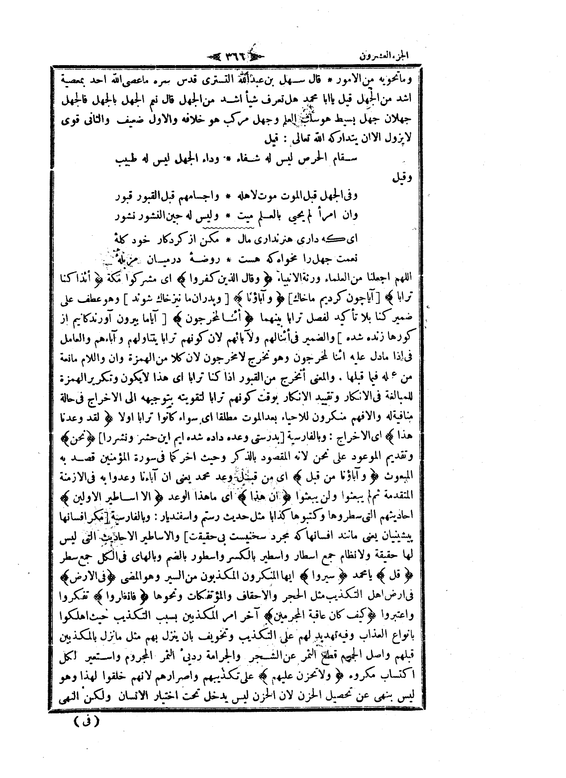 اللهم اجعلنا من العلماء ورثة الأنبياء وَقالَ الَّذِينَ كَفَرُوا اى مشركوا مكة أَإِذا كُنَّا تُراباً [آيا چون كرديم ما خاك] وَآباؤُنا [و پدران ما نيز خاك شوند] وهو عطف على ضمير كنا بلا تأكيد لفصل ترابا بينهما أَإِنَّا لَمُخْرَجُونَ [آيا ما بيرون آورندگانيم از كورها زنده شده] والضمير فى أإنا لهم ولآبائهم لان كونهم ترابا يتناولهم وآباءهم والعامل فى إذا ما دل عليه أإنا لمخرجون وهو نخرج لا مخرجون لان كلا من الهمزة وان واللام مانعة من عمله فيما قبلها. والمعنى أنخرج من القبور إذا كنا ترابا اى هذا لا يكون وتكرير الهمزة للمبالغة فى الإنكار وتقييد الإنكار بوقت كونهم ترابا لتقويته بتوجيهه الى الإخراج فى حالة منافية له والافهم منكرون للاحياء بعد الموت مطلقا اى سواء كانوا ترابا اولا لَقَدْ وُعِدْنا هذا اى الإخراج: وبالفارسية [بدرستى وعده داده شده ايم اين حشر ونشر را] نَحْنُ وتقديم الموعود على نحن لانه المقصود بالذكر وحيث اخر كما فى سورة المؤمنين قصد به المبعوث وَآباؤُنا مِنْ قَبْلُ اى من قبل وعد محمد يعنى ان آباءنا وعدوا به فى الازمنة المتقدمة ثم لم يبعثوا ولن يبعثوا إِنْ هذا اى ما هذا الوعد إِلَّا أَساطِيرُ الْأَوَّلِينَ أحاديثهم التي سطروها وكتبوها كذابا مثل حديث رستم وإسفنديار: وبالفارسية [مكر افسانها پيشينيان يعنى مانند افسانها كه مجرد سخنيست بى حقيقت] والأساطير الأحاديث التي ليس لها حقيقة ولا نظام جمع اسطار واسطير بالكسر واسطور بالضم وبالهاى فى الكل جمع سطر قُلْ يا محمد سِيرُوا ايها المنكرون المكذبون من السير وهو المضي فِي الْأَرْضِ فى ارض اهل التكذيب مثل الحجر والأحقاف والمؤتفكات ونحوها فَانْظُرُوا تفكروا واعتبروا كَيْفَ كانَ عاقِبَةُ الْمُجْرِمِينَ آخر امر المكذبين بسبب التكذيب حيث اهلكوا بانواع العذاب وفيه تهديد لهم على التكذيب وتخويف بان ينزل بهم مثل ما نزل بالمكذبين قبلهم واصل الجرم قطع الثمر عن الشجر والجرامة رديئ الثمر المجروم واستعير لكل اكتساب مكروه وَلا تَحْزَنْ عَلَيْهِمْ على تكذيبهم وإصرارهم لانهم خلقوا لهذا وهو ليس بنهي عن تحصيل الحزن لان الحزن ليس يدخل تحت اختيار الإنسان ولكن النهى