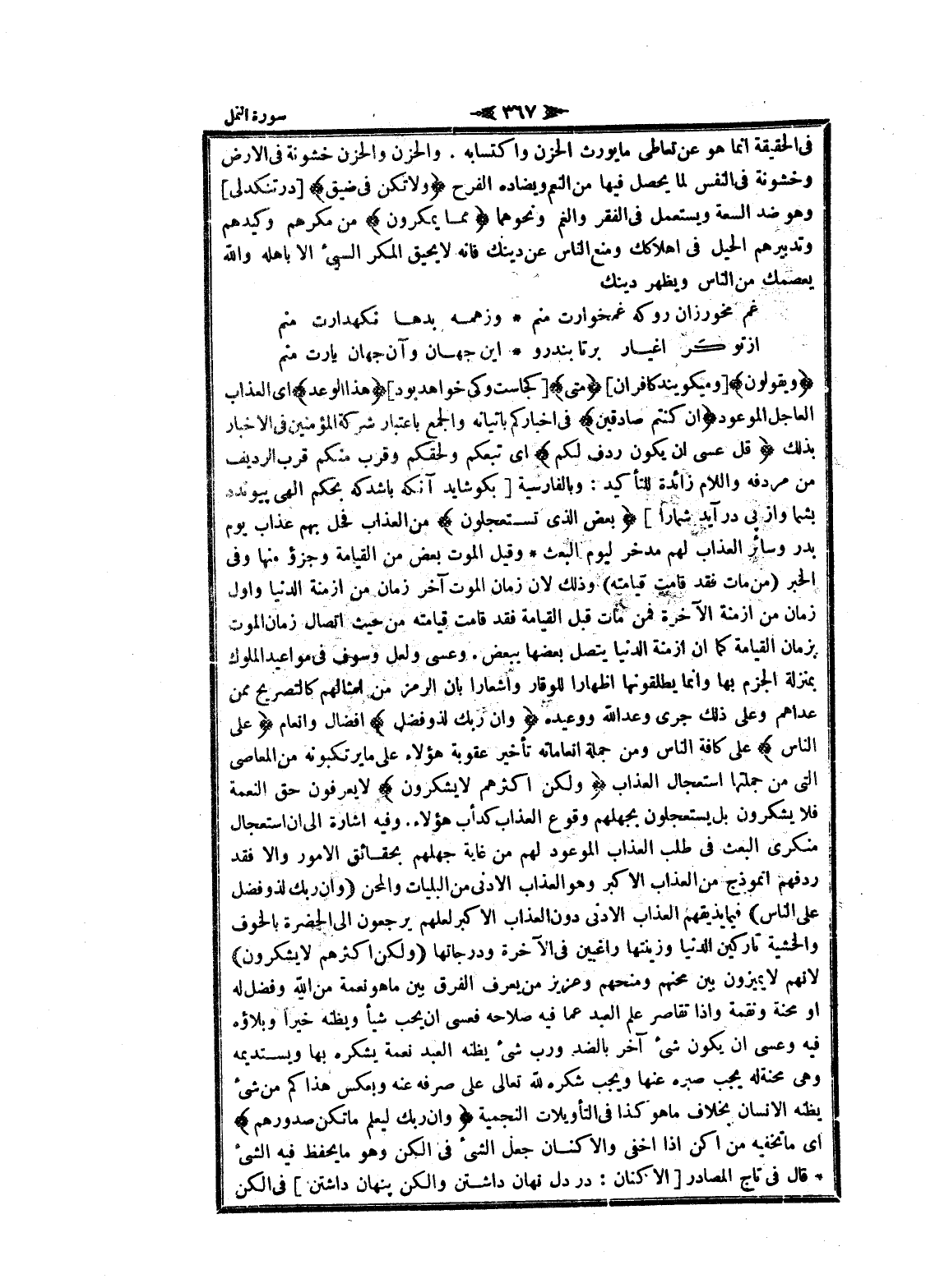 وَيَقُولُونَ [وميكويند كافران] مَتى [كجاست وكى خواهد بود] هذَا الْوَعْدُ اى العذاب العاجل الموعود إِنْ كُنْتُمْ صادِقِينَ فى اخباركم بإتيانه والجمع باعتبار شركة المؤمنين فى الاخبار بذلك قُلْ عَسى أَنْ يَكُونَ رَدِفَ لَكُمْ اى تبعكم ولحقكم وقرب منكم قرب الرديف من مردفه واللام زائدة للتأكيد: وبالفارسية [بكوشايد آنكه باشد كه بحكم الهى پيوندد بشما واز پى درآيد شما را] بَعْضُ الَّذِي تَسْتَعْجِلُونَ من العذاب فحل بهم عذاب يوم بدر وسائر العذاب لهم مدخر ليوم البعث وقيل الموت بعض من القيامة وجزؤ منها وفى الخبر (من مات فقد قامت قيامته) وذلك لان زمان الموت آخر زمان من ازمنة الدنيا وأول زمان من ازمنة الآخرة فمن مات قبل القيامة فقد قامت قيامته من حيث اتصال زمان الموت بزمان القيامة كما ان ازمنة الدنيا يتصل بعضها ببعض. وعسى ولعل وسوف فى مواعيد الملوك بمنزلة الجزم بها وانما يطلقونها إظهارا للوقار واشعارا بان الرمز من أمثالهم كالتصريح ممن عداهم وعلى ذلك جرى وعد الله ووعيده وَإِنَّ رَبَّكَ لَذُو فَضْلٍ إفضال وانعام عَلَى النَّاسِ على كافة الناس ومن جملة انعاماته تأخير عقوبة هؤلاء على ما يرتكبونه من المعاصي التي من جملتها استعجال العذاب وَلَكِنَّ أَكْثَرَهُمْ لا يَشْكُرُونَ لا يعرفون حق النعمة فلا يشكرون بل يستعجلون بجهلهم وقوع العذاب كدأب هؤلاء. وفيه اشارة الى ان استعجال منكرى البعث فى طلب العذاب الموعود لهم من غاية جهلهم بحقائق الأمور والا فقد ردفهم أنموذج من العذاب الأكبر وهو العذاب الأدنى من البليات والمحن (وَإِنَّ رَبَّكَ لَذُو فَضْلٍ عَلَى النَّاسِ) فيما يذيقهم العذاب الأدنى دون العذاب الأكبر لعلهم يرجعون الى الحضرة بالخوف والخشية تاركين الدنيا وزينتها راغبين فى الآخرة ودرجاتها (وَلَكِنَّ أَكْثَرَهُمْ لا يَشْكُرُونَ) لانهم لا يميزون بين محنهم ومنحهم وعزيز من يعرف الفرق بين ما هو نعمة من الله وفضل له او محنة ونقمة وإذا تقاصر علم العبد عما فيه صلاحه فعسى ان يحب شيأ ويظنه خيرا وبلاؤه فيه وعسى ان يكون شىء آخر بالضد ورب شىء يظنه العبد نعمة يشكره بها ويستديمه وهى محنة له يجب صبره عنها ويجب شكره لله تعالى على صرفه عنه وبعكس هذا كم من شىء يظنه الإنسان بخلاف ما هو كذا فى التأويلات النجمية وَإِنَّ رَبَّكَ لَيَعْلَمُ ما تُكِنُّ صُدُورُهُمْ اى ما تخفيه من أكن إذا أخفى والأكنان جعل الشيء فى الكن وهو ما يحفظ فيه الشيء قال فى تاج المصادر [الأكنان: در دل نهان داشتن والكن پنهان داشتن] فى الكن