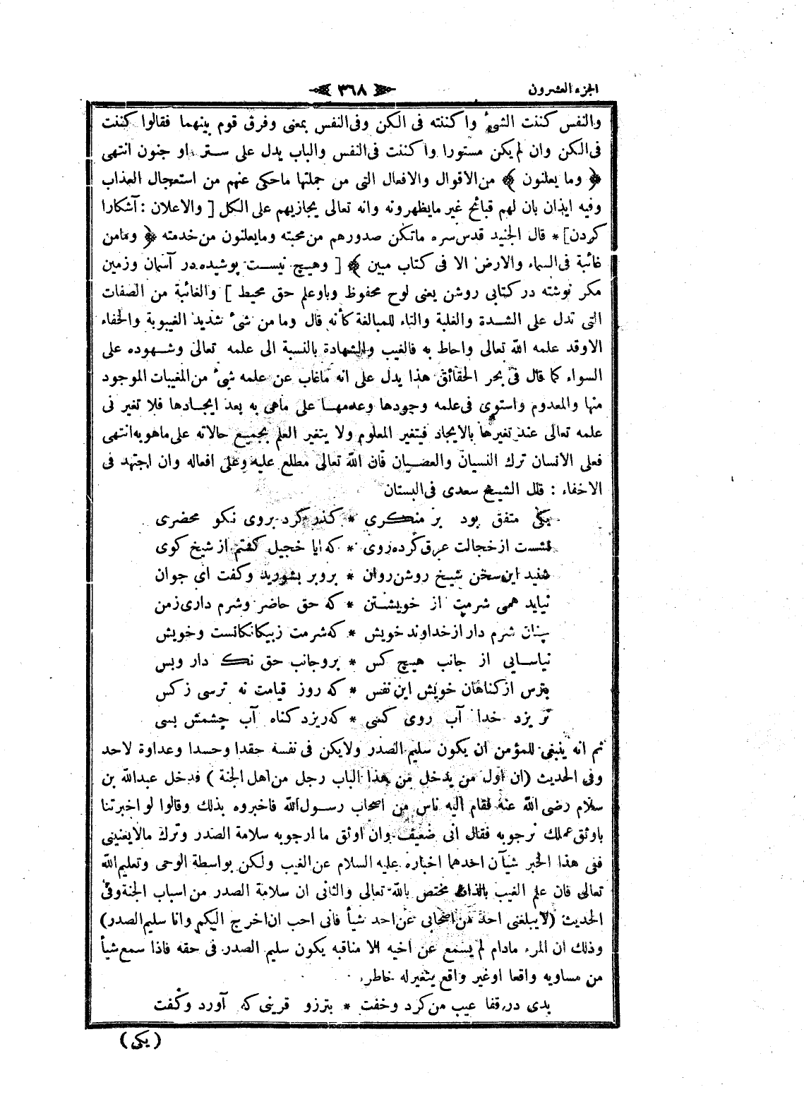 ثم انه ينبغى للمؤمن ان يكون سليم الصدر ولا يكن فى نفسه حقدا وحسدا وعداوة لاحد وفى الحديث (ان أول من يدخل من هذا الباب رجل من اهل الجنة) فدخل عبد الله بن سلام رضى الله عنه فقام اليه ناس من اصحاب رسول الله فاخبروه بذلك وقالوا لو اخبرتنا باوثق عملك نرجو به فقال انى ضعيف وان أوثق ما أرجو به سلامة الصدر وترك ما لا يعنينى ففى هذا الخبر شيآن أحدهما اخباره عليه السلام عن الغيب ولكن بواسطة الوحى وتعليم الله تعالى فان علم الغيب بالذات مختص بالله تعالى والثاني ان سلامة الصدر من اسباب الجنة وفى الحديث (لا يبلغنى أحد من أصحابي عن أحد شيأ فانى أحب ان اخرج إليكم وانا سليم الصدر) وذلك ان المرء مادام لم يسمع عن أخيه الا مناقبه يكون سليم الصدر فى حقه فاذا سمع شيأ من مساويه واقعا او غير واقع يتغير له خاطره