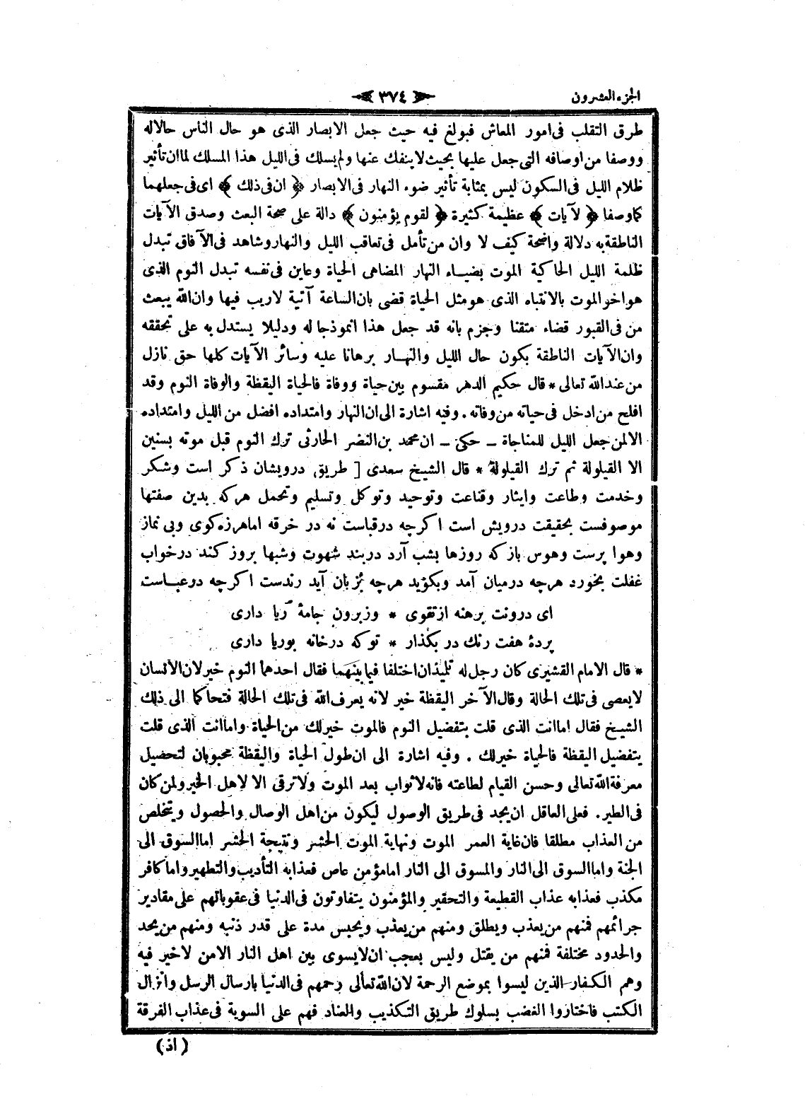 أفلح من ادخل فى حياته من وفاته. وفيه اشارة الى ان النهار وامتداده أفضل من الليل وامتداده الا لمن جعل الليل للمناجاة- حكى- ان محمد بن النضر الحارثي ترك النوم قبل موته بستين الا القيلولة ثم ترك القيلولة قال الشيخ سعدى [طريق درويشان ذكر است وشكر وخدمت وطاعت وإيثار وقناعت وتوحيد وتوكل وتسليم وتحمل هر كه بدين صفتها موصوفست بحقيقت درويش است اگر چهـ در قباست نه در خرقه اما هرزه كوى وبى نماز وهوا پرست وهوس باز كه روزها بشب آرد در بند شهوت وشبها بروز كند در خواب غفلت بخورد هر چهـ در ميان آمد وبگويد هر چهـ بزبان آيد رندست اگر چهـ در عباست