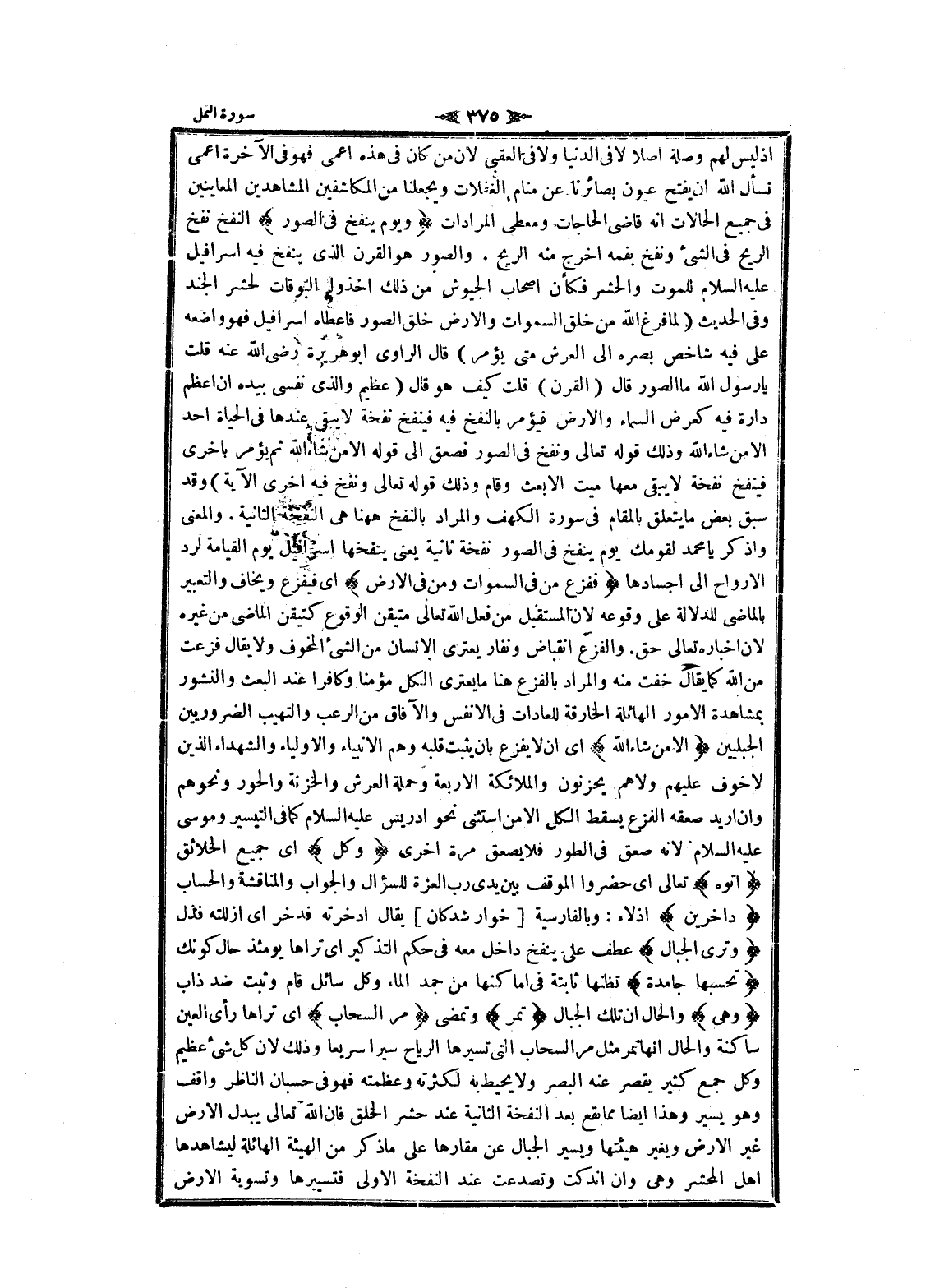 إذ ليس لهم وصلة أصلا لا فى الدنيا ولا فى العقبى لان من كان فى هذه أعمى فهو فى الآخرة أعمى نسأل الله ان يفتح عيون بصائرنا عن منام الغفلات ويجعلنا من المكاشفين المشاهدين المعاينين فى جميع الحالات انه قاضى الحاجات ومعطى المرادات وَيَوْمَ يُنْفَخُ فِي الصُّورِ النفخ نفخ الريح فى الشيء ونفخ بفمه اخرج منه الريح. والصور هو القرن الذي ينفخ فيه اسرافيل عليه السلام للموت والحشر فكأن اصحاب الجيوش من ذلك أخذوا البوقات لحشر الجند وفى الحديث (لما فرغ الله من خلق السموات والأرض خلق الصور فاعطاه اسرافيل فهو واضعه على فيه شاخص بصره الى العرش متى يؤمر) قال الراوي ابو هريرة رضى الله عنه قلت يا رسول الله ما الصور قال (القرن) قلت كيف هو قال (عظيم والذي نفسى بيده ان أعظم دارة فيه كعرض السماء والأرض فيؤمر بالنفخ فيه فينفخ نفخة لا يبقى عندها فى الحياة أحد الا من شاء الله وذلك قوله تعالى ونفخ فى الصور فصعق الى قوله الا من شاء الله ثم يؤمر بأخرى فينفخ نفخة لا يبقى معها ميت الا بعث وقام وذلك قوله تعالى ونفخ فيه اخرى الآية) وقد سبق بعض ما يتعلق بالمقام فى سورة الكهف والمراد بالنفخ هاهنا هى النفخة الثانية. والمعنى واذكر يا محمد لقومك يوم ينفخ فى الصور نفخة ثانية يعنى ينفخها اسرافيل يوم القيامة لرد الأرواح الى أجسادها فَفَزِعَ مَنْ فِي السَّماواتِ وَمَنْ فِي الْأَرْضِ اى فيفزع ويخاف والتعبير بالماضي للدلالة على وقوعه لان المستقبل من فعل الله تعالى متيقن الوقوع كتيقن الماضي من غيره لان اخباره تعالى حق. والفزع انقباض ونفار يعترى الإنسان من الشيء المخوف ولا يقال فزعت من الله كما يقال خفت منه والمراد بالفزع هنا ما يعترى الكل مؤمنا وكافرا عند البعث والنشور بمشاهدة الأمور الهائلة الخارقة للعادات فى الأنفس والآفاق من الرعب والتهيب الضروريين الجبليين إِلَّا مَنْ شاءَ اللَّهُ اى ان لا يفزع بان يثبت قلبه وهم الأنبياء والأولياء والشهداء الذين لا خوف عليهم ولا هم يحزنون والملائكة الاربعة وحملة العرش والخزنة والحور ونحوهم وان أريد صعقه الفزع يسقط الكل الا من استثنى نحو إدريس عليه السلام كما فى التيسير وموسى عليه السلام لانه صعق فى الطور فلا يصعق مرة اخرى وَكُلٌّ اى جميع الخلائق أَتَوْهُ تعالى اى حضروا الموقف بين يدى رب العزة للسؤال والجواب والمناقشة والحساب داخِرِينَ أذلاء: وبالفارسية [خوار شدكان] يقال ادخرته فدخر اى ازللته فذل وَتَرَى الْجِبالَ عطف على ينفخ داخل معه فى حكم التذكير اى تراها يومئذ حال كونك تَحْسَبُها جامِدَةً تظنها ثابتة فى أماكنها من جمد الماء وكل سائل قام وثبت ضد ذاب وَهِيَ والحال ان تلك الجبال تَمُرُّ وتمضى مَرَّ السَّحابِ اى تراها رأى العين ساكنة والحال انها تمر مثل مر السحاب التي تسيرها الرياح سيرا سريعا وذلك لان كل شىء عظيم وكل جمع كثير يقصر عنه البصر ولا يحيط به لكثرته وعظمته فهو فى حسبان الناظر واقف وهو يسير وهذا ايضا مما يقع بعد النفخة الثانية عند حشر الخلق فان الله تعالى يبدل الأرض غير الأرض ويغير هيئتها ويسير الجبال عن مقارها على ما ذكر من الهيئة الهائلة ليشاهدها اهل المحشر وهى وان اندكت وتصدعت عند النفخة الاولى فتسييرها وتسوية الأرض