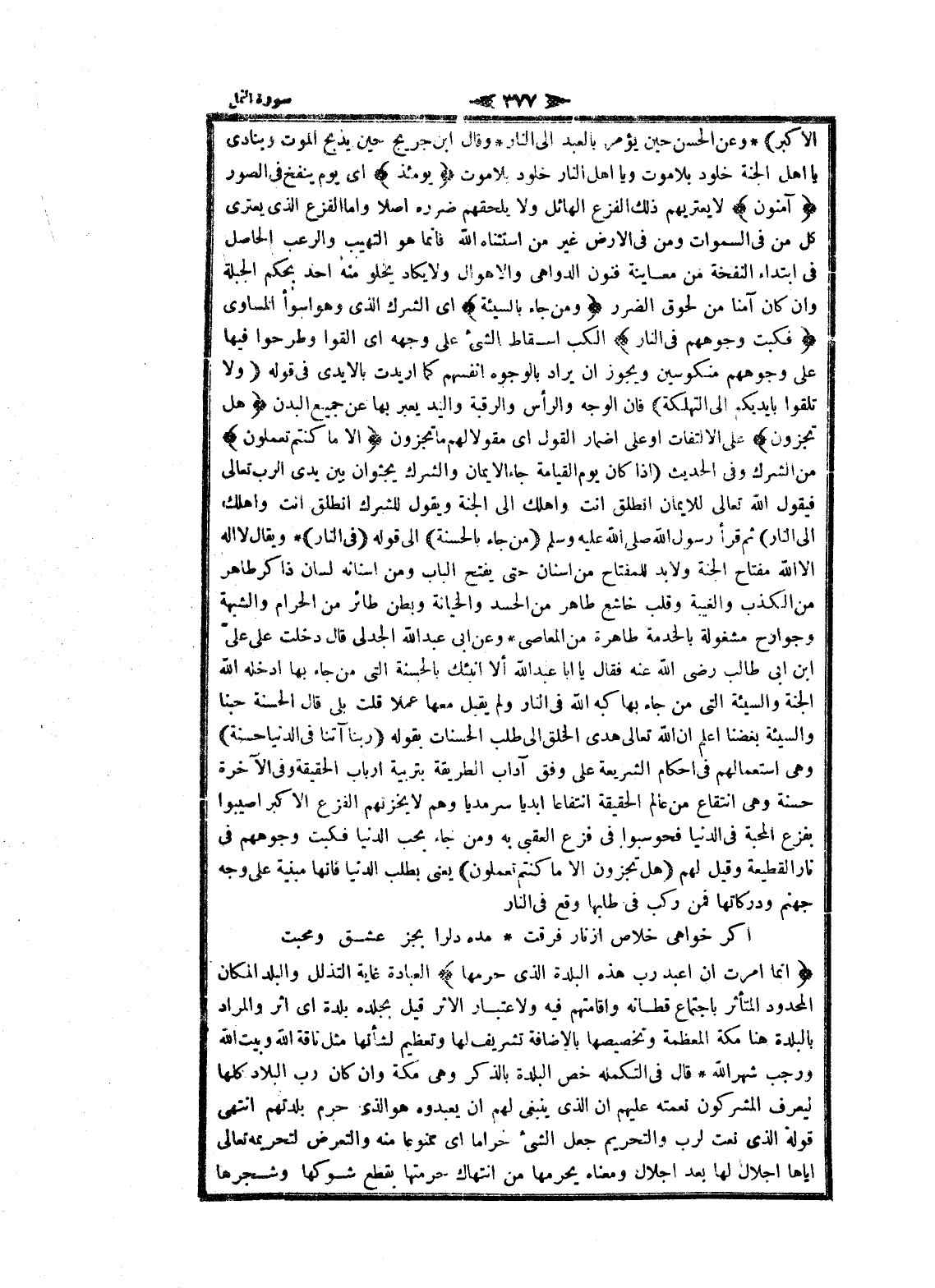 وعن الحسن حين يؤمر بالعبد الى النار وقال ابن جريج حين يذبح الموت وينادى يا اهل الجنة خلود بلا موت ويا اهل النار خلود بلا موت يَوْمَئِذٍ اى يوم ينفخ فى الصور آمِنُونَ لا يعتريهم ذلك الفزع الهائل ولا يلحقهم ضرره أصلا واما الفزع الذي يعترى كل من فى السموات ومن فى الأرض غير من استثناه الله فانما هو التهيب والرعب الحاصل فى ابتداء النفخة من معاينة فنون الدواهي والأهوال ولا يكاد يخلو منه أحد بحكم الجبلة وان كان آمنا من لحوق الضرر وَمَنْ جاءَ بِالسَّيِّئَةِ اى الشرك الذي وهو أسوأ المساوى فَكُبَّتْ وُجُوهُهُمْ فِي النَّارِ الكب إسقاط الشيء على وجهه اى القوا وطرحوا فيها على وجوههم منكوسين ويجوز ان يراد بالوجوه أنفسهم كما اريدت بالأيدي فى قوله (وَلا تُلْقُوا بِأَيْدِيكُمْ إِلَى التَّهْلُكَةِ) فان الوجه والرأس والرقبة واليد يعبر بها عن جميع البدن هَلْ تُجْزَوْنَ على الالتفات او على إضمار القول اى مقولا لهم ما تجزون إِلَّا ما كُنْتُمْ تَعْمَلُونَ من الشرك وفى الحديث (إذا كان يوم القيامة جاء الايمان والشرك يجثوان بين يدى الرب تعالى فيقول الله تعالى للايمان انطلق أنت وأهلك الى الجنة ويقول للشرك انطلق أنت وأهلك الى النار) ثم قرأ رسول الله صلى الله عليه وسلم (مَنْ جاءَ بِالْحَسَنَةِ) الى قوله (فِي النَّارِ) ويقال لا اله الا الله مفتاح الجنة ولا بد للمفتاح من أسنان حتى يفتح الباب ومن أسنانه لسان ذاكر طاهر من الكذب والغيبة وقلب خاشع طاهر من الحسد والخيانة وبطن طائر من الحرام والشبهة وجوارح مشغولة بالخدمة طاهرة من المعاصي وعن ابى عبد الله الجدلي قال دخلت على علىّ ابن ابى طالب رضى الله عنه فقال يا أبا عبد الله ألا أنبئك بالحسنة التي من جاء بها ادخله الله الجنة والسيئة التي من جاء بها كبه الله فى النار ولم يقبل معها عملا قلت بلى قال الحسنة حبنا والسيئة بغضنا اعلم ان الله تعالى هدى الخلق الى طلب الحسنات بقوله (رَبَّنا آتِنا فِي الدُّنْيا حَسَنَةً) وهى استعمالهم فى احكام الشريعة على وفق آداب الطريقة بتربية ارباب الحقيقة وفى الآخرة حسنة وهى انتقاع من عالم الحقيقة انتفاعا ابديا سرمديا وهم لا يخزنهم الفزع الأكبر أصيبوا بفزع المحبة فى الدنيا فحوسبوا فى فزع العقبى به ومن جاء بحب الدنيا فكبت وجوههم فى نار القطيعة وقيل لهم (هَلْ تُجْزَوْنَ إِلَّا ما كُنْتُمْ تَعْمَلُونَ) يعنى بطلب الدنيا فانها مبنية على وجه جهنم ودركاتها فمن ركب فى طلبها وقع فى النار