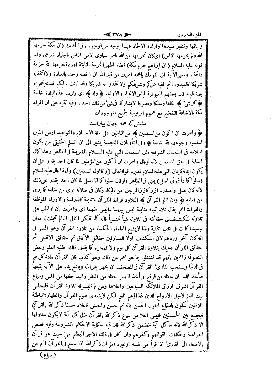 وَأُمِرْتُ أَنْ أَكُونَ مِنَ الْمُسْلِمِينَ من الثابتين على ملة الإسلام والتوحيد او من الذين اسلموا وجوههم لله خاصة وفى التأويلات النجمية يشير الى ان المسلم الحقيقي من يكون إسلامه فى استعمال الشريعة مثل استعمال النبي عليه السلام الشريعة فى الظاهر وهذا كمال العناية فى حق المسلمين لانه لو قال وأمرت ان أكون من المؤمنين لما كان أحد يقدر على ان يكون إيمانه كايمان النبي عليه السلام نظيره قوله تعالى (وَأَنَا أَوَّلُ الْمُسْلِمِينَ) ولهذا قال عليه السلام (صلوا كما رأيتمونى أصلي) يعنى فى الظاهر ولو قال صلوا كما انا أصلي لما كان أحد يقدر على ذلك لانه كان يصلى ولصدره ازيز كازيز المرجل من البكاء وكان فى صلاته يرى من خلفه كما يرى من امامه وَأَنْ أَتْلُوَا الْقُرْآنَ التلاوة قراءة القرآن متتابعة كالدراسة والأوراد الموظفة والقراءة أعم يقال تلاه تبعه متابعة ليس بينهما ما ليس منهما اى وأمرت بان أواظب على تلاوته لتكشف لى حقائقه فى تلاوته شيأ فشيأ فانه كلما تفكر التالي العالم تجلت له معان جديدة كانت فى حجب مخفية ولذا لا يشبع العلماء الحكماء من تلاوة القرآن وهو السر فى انه كان آخر وردهم لان المنكشف اولا للعارفين حقائق الآفاق ثم حقائق الأنفس ثم حقائق القرآن فعليك بتلاوة القرآن كل يوم ولا تهجره كما يفعل ذلك طلبة العلم وبعض المتصوفة زاعمين بانهم قد اشتغلوا بما هو أهم من ذلك وهو كذب فان القرآن مادة كل علم فى الدنيا ويستحب لقارئ القرآن فى المصحف ان يجهر بقراءته ويضع يده على الآية يتبعها فيأخذ اللسان حظه من الرفع ويأخذ البصر حظه من النظر واليد حظها من المس وسماع القرآن اشرف أرزاق الملائكة السياحين وأعلاها ومن لم تتيسر له تلاوة القرآن فليجلس لبث العلم لاجل الأرواح الذين غذاؤهم العلم لكن لا يتعدى علوم القرآن والطهارة الباطنة للاذنين تكون باستماع القول الحسن فانه ثم حسن واحسن فاعلاه حسنا ذكر الله بالقرآن فيجمع بين الحسنين فليس أعلا من سماع ذكر الله بالقرآن مثل كل آية لا يكون مدلولها الا ذكر الله فانه ما كل آية تتضمن ذكر الله فان فيه حكاية الاحكام المشروعة وفيه قصص الفراعنة وحكايات أقوالهم وكفرهم وان كان فى ذلك الاجر العظيم من حيث هو قرآن بالاصغاء الى القارئ إذا قرأ من نفسه او غيره فعلم ان ذكر الله إذا سمع فى القرآن أتم من