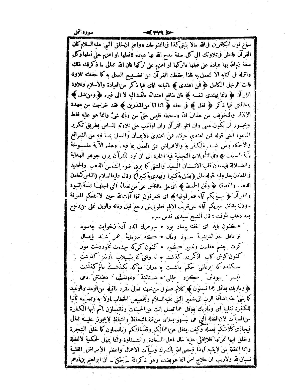 سماع قول الكافرين فى الله ما لا ينبغى كذا فى الفتوحات واعلم ان خلق النبي عليه السلام كان القرآن فانظر فى تلاوتك الى كل صفة مدح الله بها عباده فافعلها او اعزم على فعلها وكل صفة ذم الله بها عباده على فعلها فاتركها او اعزم على تركها فان الله تعالى ما ذكر لك ذلك وأنزله فى كتابه الا لتعمل به فاذا حفظت القرآن عن تضييع العمل به كما حفظته تلاوة فانت الرجل الكامل فَمَنِ اهْتَدى باتباعه إياي فيما ذكر من العبادة والإسلام وتلاوة القرآن فَإِنَّما يَهْتَدِي لِنَفْسِهِ فان منافع اهتدائه عائدة اليه لا الى غيره وَمَنْ ضَلَّ بمخالفتى فيما ذكر فَقُلْ فى حقه إِنَّما أَنَا مِنَ الْمُنْذِرِينَ فقد خرجت من عهدة الانذار والتخويف من عذاب الله وسخطه فليس علىّ من وباله شىء وانما هو عليه فقط ويجوز ان يكون معنى وان اتلو القرآن وان أواظب على تلاوته للناس بطريق تكرير الدعوة فمعنى قوله فمن اهتدى حينئذ فمن اهتدى بالايمان والعمل بما فيه من الشرائع والاحكام ومن ضل بالكفر به والاعراض عن العمل بما فيه. وهذه الآية منسوخة بآية السيف وفى التأويلات النجمية فيه اشارة الى ان نور القرآن يربى جوهر الهداية والضلالة فى معدن قلب الإنسان السعيد والشقي كما يربى ضوء الشمس الذهب والحديد فى المعادن يدل عليه قوله تعالى (يُضِلُّ بِهِ كَثِيراً وَيَهْدِي بِهِ كَثِيراً) وقال عليه السلام (الناس كمعادن الذهب والفضة) وَقُلِ الْحَمْدُ لِلَّهِ اى على ما أفاض علىّ من نعمائه التي أجلها نعمة النبوة والقرآن سَيُرِيكُمْ آياتِهِ فَتَعْرِفُونَها اى فتعرفون انها آيات الله حين لا تنفعكم المعرفة وقال مقاتل سيريكم آياته عن قريب الأيام فطوبى لمن رجع قبل وفاته والويل على من رجع بعد ذهاب الوقت: قال الشيخ سعدى قدس سره