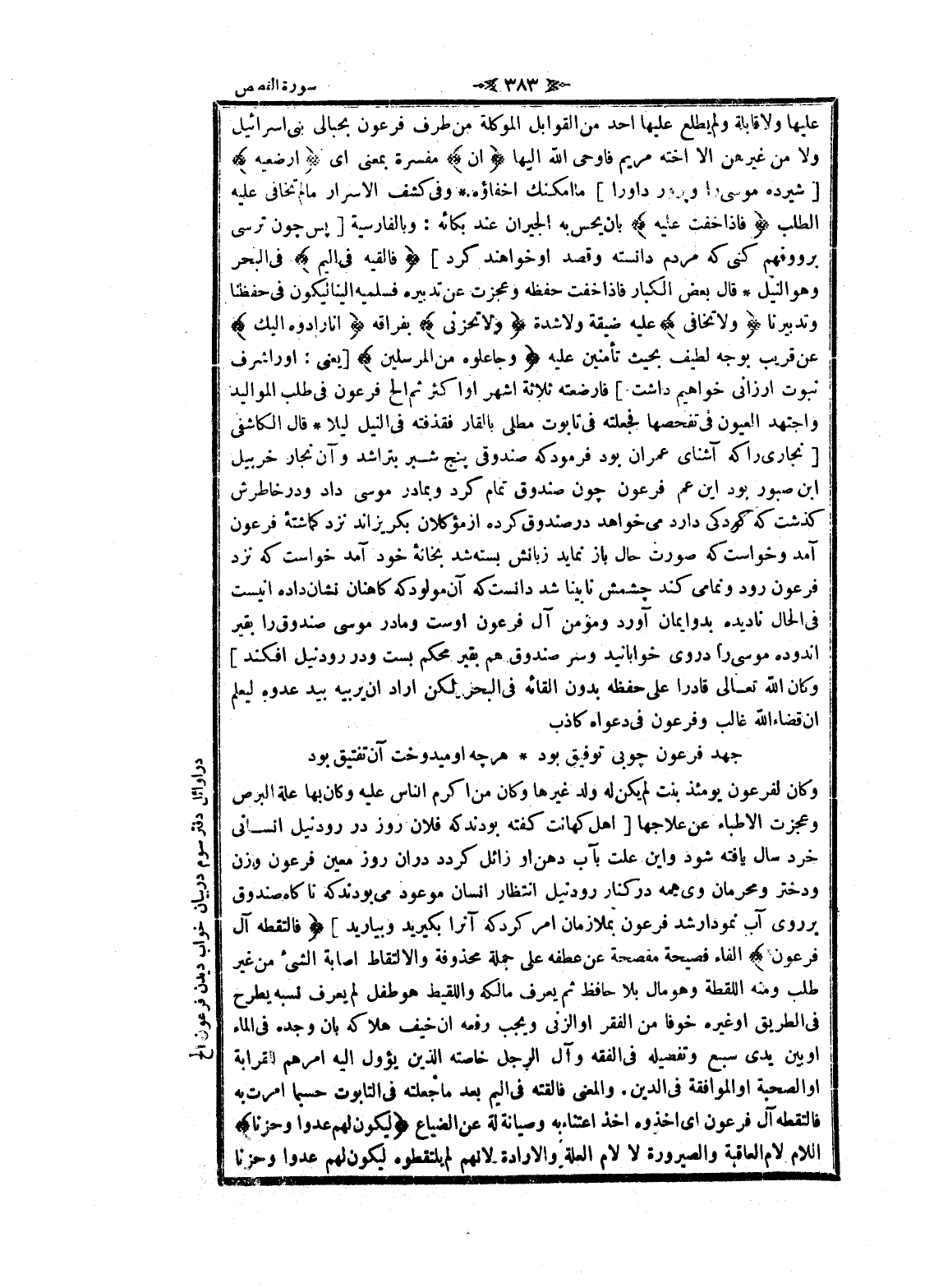 عليها ولا قابلة ولم يطلع عليها أحد من القوابل الموكلة من طرف فرعون بحبالى بنى إسرائيل ولا من غيرهن الا أخته مريم فاوحى الله إليها إِنَّ مفسرة بمعنى اى أَرْضِعِيهِ [شيرده موسى را و پرورد او را] ما أمكنك اخفاؤه وفى كشف الاسرار ما لم تخافي عليه الطلب فَإِذا خِفْتِ عَلَيْهِ بان يحس به الجيران عند بكائه: وبالفارسية [پس چون ترسى برو وفهم كنى كه مردم دانسته وقصد او خواهند كرد] فَأَلْقِيهِ فِي الْيَمِّ فى البحر وهو النيل قال بعض الكبار فاذا خفت حفظه وعجزت عن تدبيره فسلميه إلينا ليكون فى حفظنا وتدبيرنا وَلا تَخافِي عليه ضيقة ولا شدة وَلا تَحْزَنِي بفراقه إِنَّا رَادُّوهُ إِلَيْكِ عن قريب بوجه لطيف بحيث تأمنين عليه وَجاعِلُوهُ مِنَ الْمُرْسَلِينَ [يعنى: او را شرف نبوت ارزانى خواهيم داشت] فارضعته ثلاثة أشهر او اكثر ثم ألح فرعون فى طلب المواليد واجتهد العيون فى تفحصها فجعلته فى تابوت مطلى بالقار فقذفته فى النيل ليلا قال الكاشفى [نجارى را كه آشناى عمران بود فرمود كه صندوقى پنج شبر بتراشد وآن نجار خربيل ابن صبور بود اين عم فرعون چون صندوق تمام كرد وبمادر موسى داد ودر خاطرش كذشت كه كودكى دارد مى خواهد در صندوق كرده از مؤكلان بگريزاند نزد كماشته فرعون آمد وخواست كه صورت حال باز نمايد زبانش بسته شد بخانه خود آمد خواست كه نزد فرعون رود ونمامى كند چشمش نابينا شد دانست كه آن مولود كه كاهنان نشان داده اينست فى الحال ناديده بدو ايمان آورد ومؤمن آل فرعون اوست ومادر موسى صندوق را بقير اندوده موسى را در وى خوابانيد وسر صندوق هم بقير محكم بست ودر رود نيل افكند] وكان الله تعالى قادرا على حفظه بدون القائه فى البحر لكن أراد ان يربيه بيد عدوه ليعلم ان قضاء الله غالب وفرعون فى دعواه كاذب
