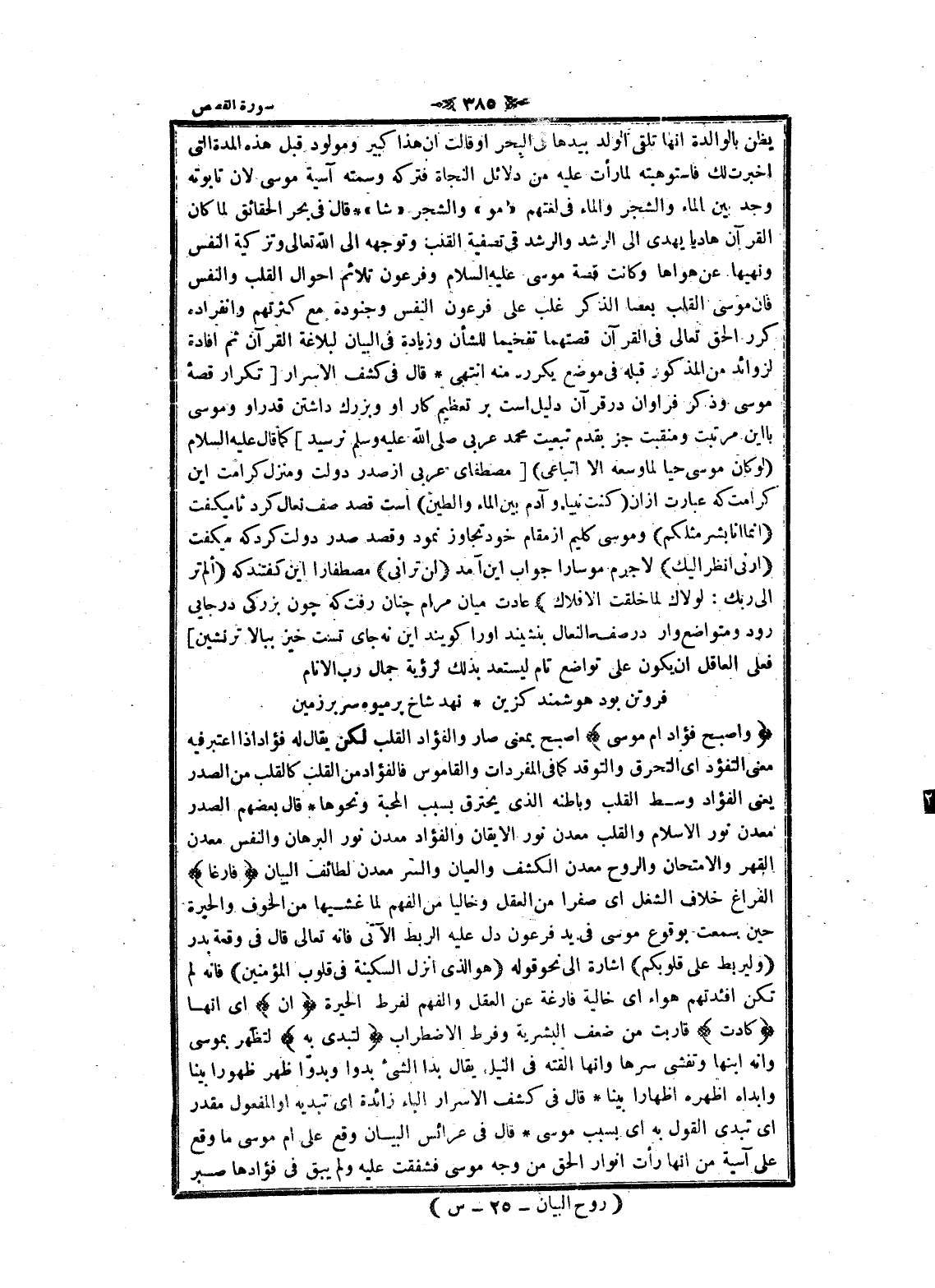 يظن بالوالدة انها تلقى الولد بيدها فى البحر او قالت ان هذا كبير ومولود قبل هذه المدة التي أخبرت لك فاستوهبته لما رأت عليه من دلائل النجاة فتركه وسمته آسية موسى لان تابوته وجد بين الماء والشجر والماء فى لغتهم «مو» والشجر «شا» قال فى بحر الحقائق لما كان القرآن هاديا يهدى الى الرشد والرشد فى تصفية القلب وتوجهه الى الله تعالى وتزكية النفس ونهيها عن هواها وكانت قصة موسى عليه السلام وفرعون تلائم احوال القلب والنفس فان موسى القلب بعصا الذكر غلب على فرعون النفس وجنوده مع كثرتهم وانفراده كرر الحق تعالى فى القرآن قصتهما تفخيما للشأن وزيادة فى البيان لبلاغة القرآن ثم إفادة لزوائد من المذكور قبله فى موضع يكرره منه انتهى قال فى كشف الاسرار [تكرار قصه موسى وذكر فراوان در قرآن دليل است بر تعظيم كار او وبزرك داشتن قدر او وموسى با اين مرتبت ومنقبت جز بقدم تبعيت محمد عربى صلى الله عليه وسلم نرسيد] كما قال عليه السلام (لو كان موسى حيا لما وسعه الا اتباعى) [مصطفاى عربى از صدر دولت ومنزل كرامت اين كرامت كه عبارت از ان (كنت نبيا وآدم بين الماء والطين) است قصد صف نعال كرد تا ميكفت (إِنَّما أَنَا بَشَرٌ مِثْلُكُمْ) وموسى كليم از مقام خود تجاوز نمود وقصد صدر دولت كرد كه ميكفت (أَرِنِي أَنْظُرْ إِلَيْكَ) لا جرم موسا را جواب اين آمد (لَنْ تَرانِي) مصطفا را اين كفتند كه (الم تر الى ربك: لو لاك لما خلقت الافلاك) عادت ميان مرام چنان رفت كه چون بزركى در جايى رود ومتواضع وار در صف النعال بنشيند او را كويند اين نه جاى تست خيز ببالاتر نشين] فعلى العاقل ان يكون على تواضع تام ليستعد بذلك لرؤية جمال رب الأنام