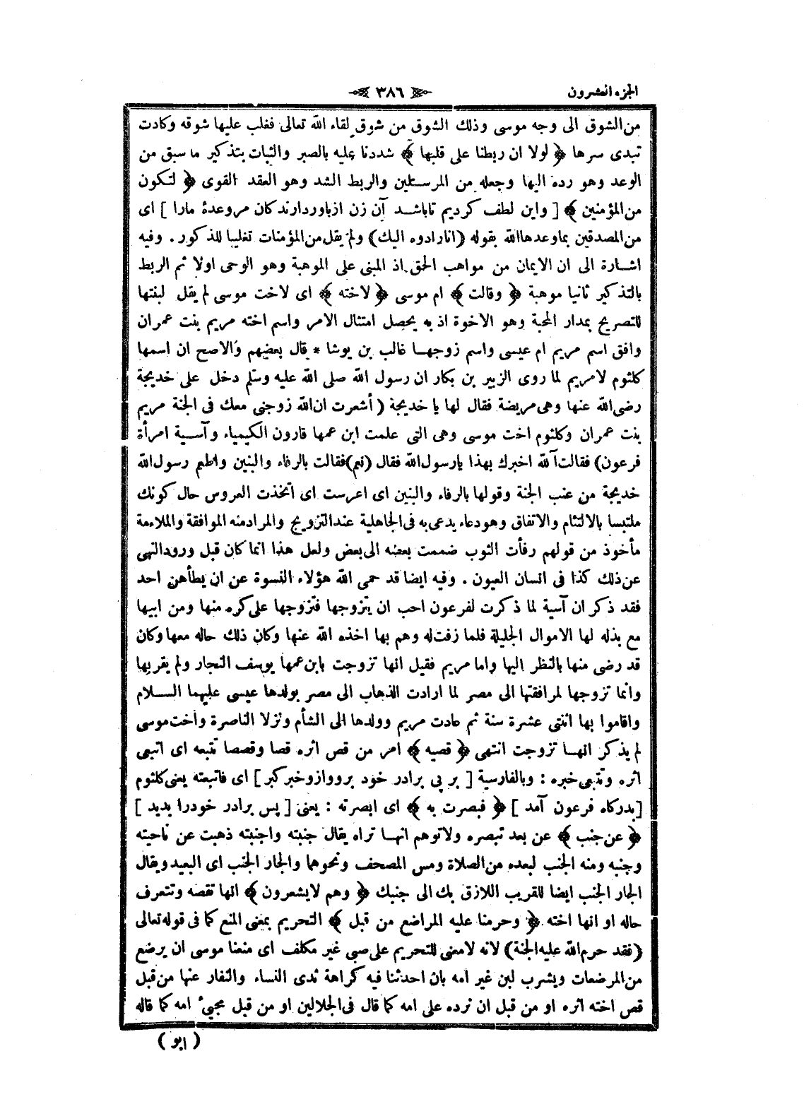 من الشوق الى وجه موسى وذلك الشوق من شوق لقاء الله تعالى فغلب عليها شوقه وكادت تبدى سرها لَوْلا أَنْ رَبَطْنا عَلى قَلْبِها شددنا عليه بالصبر والثبات بتذكير ما سبق من الوعد وهو رده إليها وجعله من المرسلين والربط الشد وهو العقد القوى لِتَكُونَ مِنَ الْمُؤْمِنِينَ [واين لطف كرديم تا باشد آن زن از باور دارند كان مر وعده ما را] اى من المصدقين بما وعدها الله بقوله (إِنَّا رَادُّوهُ إِلَيْكِ) ولم يقل من المؤمنات تغليبا للذكور. وفيه اشارة الى ان الايمان من مواهب الحق إذ المبنى على الموهبة وهو الوحى اولا ثم الربط بالتذكير ثانيا موهبة وَقالَتْ أم موسى لِأُخْتِهِ اى لاخت موسى لم يقل لبنتها للتصريح بمدار المحبة وهو الاخوة إذ به يحصل امتثال الأمر واسم أخته مريم بنت عمران وافق اسم مريم أم عيسى واسم زوجها غالب بن يوشا قال بعضهم والأصح ان اسمها كلثوم لا مريم لما روى الزبير بن بكار ان رسول الله صلى الله عليه وسلم دخل على خديجة رضى الله عنها وهى مريضة فقال لها يا خديجة (أشعرت ان الله زوجنى معك فى الجنة مريم بنت عمران وكلثوم اخت موسى وهى التي علمت ابن عمها قارون الكيمياء وآسية امرأة فرعون) فقالت آلله أخبرك بهذا يا رسول الله فقال (نعم) فقالت بالرفاء والبنين واطعم رسول الله خديجة من عنب الجنة وقولها بالرفاء والبنين اى اعرست اى اتخذت العروس حال كونك ملتبسا بالالتئام والاتفاق وهو دعاء يدعى به فى الجاهلية عند التزويج والمراد منه الموافقة والملاءمة مأخوذ من قولهم رفأت الثوب ضممت بعضه الى بعض ولعل هذا انما كان قبل ورود النهى عن ذلك كذا فى انسان العيون. وفيه ايضا قد حمى الله هؤلاء النسوة عن ان يطأهن أحد فقد ذكر ان آسية لما ذكرت لفرعون أحب ان يتزوجها فتزوجها على كره منها ومن أبيها مع بذله لها الأموال الجليلة فلما زفت له وهم بها اخذه الله عنها وكان ذلك حاله معها وكان قد رضى منها بالنظر إليها واما مريم فقيل انها تزوجت بابن عمها يوسف النجار ولم يقربها وانما تزوجها لمرافقتها الى مصر لما أرادت الذهاب الى مصر بولدها عيسى عليهما السلام وأقاموا بها اثنتي عشرة سنة ثم عادت مريم وولدها الى الشام ونزلا الناصرة واخت موسى لم يذكر انها تزوجت انتهى قُصِّيهِ امر من قص اثره قصا وقصصا تتبعه اى اتبعى اثره وتتبعى خبره: وبالفارسية [بر پى برادر خود برو وازو خبر كبر] اى فاتبعته يعنى كلثوم [بدرگاه فرعون آمد] فَبَصُرَتْ بِهِ اى أبصرته: يعنى [پس برادر خود را بديد] عَنْ جُنُبٍ عن بعد تبصره ولا توهم انها تراه يقال جنبته واجنبته ذهبت عن ناحيته وجنبه ومنه الجنب لبعده من الصلاة ومس المصحف ونحوهما والجار الجنب اى البعيد ويقال الجار الجنب ايضا للقريب اللازق بك الى جنبك وَهُمْ لا يَشْعُرُونَ انها تقصه وتتعرف حاله او انها أخته وَحَرَّمْنا عَلَيْهِ الْمَراضِعَ مِنْ قَبْلُ التحريم بمعنى المنع كما فى قوله تعالى (فَقَدْ حَرَّمَ اللَّهُ عَلَيْهِ الْجَنَّةَ) لانه لا معنى للتحريم على صبى غير مكلف اى منعنا موسى ان يرضع من المرضعات ويشرب لبن غير امه بان أحدثنا فيه كراهة ثدى النساء والنفار عنها من قبل قص أخته اثره او من قبل ان نرده على امه كما قال فى الجلالين او من قبل مجيىء امه كما قاله