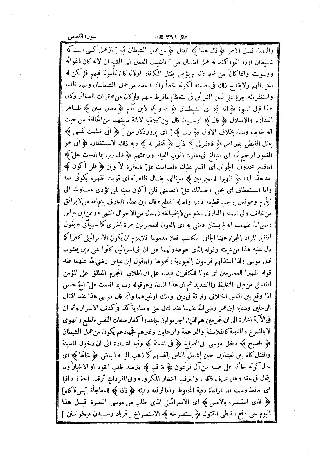 والقضاء فصل الأمر قالَ هذا القتل مِنْ عَمَلِ الشَّيْطانِ [از عمل كسى است كه شيطان او را اغوا كند نه عمل أمثال من] فاضيف العمل الى الشيطان لانه كان باغوائه ووسوسته وانما كان من عمله لانه لم يؤمر بقتل الكفار او لانه كان مأمونا فيهم فلم يكن له اغتيالهم ولا يقدح ذلك فى عصمته لكونه خطأ وانما عده من عمل الشيطان وسماه ظلما واستغفر منه جريا على سنن المقربين فى استعظام ما فرط منهم ولو كان من محقرات الصغائر وكان هذا قبل النبوة إِنَّهُ اى الشيطان عَدُوٌّ لابن آدم مُضِلٌّ مُبِينٌ ظاهر العداوة والإضلال قالَ توسيط قال بين كلاميه لابانة ما بينهما من المخالفة من حيث انه مناجاة ودعاء بخلاف الاول رَبِّ [اى پروردگار من] إِنِّي ظَلَمْتُ نَفْسِي بقتل القبطي بغير امر فَاغْفِرْ لِي ذنبى فَغَفَرَ لَهُ ربه ذلك لاستغفاره أَنِّي أَنَا الْغَفُورُ الرَّحِيمُ اى المبالغ فى مغفرة ذنوب العباد ورحمتهم قالَ رَبِّ بِما أَنْعَمْتَ عَلَيَّ اما قسم محذوف الجواب اى اقسم عليك بانعامك علىّ بالمغفرة لأتوبن فَلَنْ أَكُونَ بعد هذا ابدا ظَهِيراً لِلْمُجْرِمِينَ معينا لهم يقال ظاهرته اى قويت ظهره بكونى معه واما استعطاف اى بحق إحسانك علىّ اعصمني فلن أكون معينا لمن تؤدى معاونته الى الجرم وهو فعل يوجب قطيعة فاعله وأصله القطع قال ابن عطاء العارف بنعم الله من لا يوافق من خالف ولى نعمته والعارف بالمنعم من لا يخالفه فى حال من الأحوال انتهى وعن ابن عباس رضى الله عنهما انه لم يستثن فابتلى به اى بالعون للمجرمين مرة اخرى كما سيأتى يقول الفقير المراد بالمجرم هاهنا الجاني الكاسب فعلا مذموما فلا يلزم ان يكون الاسرائيلى كافرا كما دل عليه هذا من شيعته وقوله بالذي هو عدو لهما على ان بنى إسرائيل كانوا على دين يعقوب قبل موسى ولذا استذلهم فرعون بالعبودية ونحوها واما قول ابن عباس رضى الله عنهما عند قوله ظهيرا للمجرمين اى عونا للكافرين فيدل على ان اطلاق المجرم المطلق على المؤمن الفاسق من قبل التغليظ والتشديد ثم ان هذا الدعاء وهو قوله رب بما أنعمت علىّ إلخ حسن إذا وقع بين الناس اختلاف وفرقة فى دين او ملك او غيرهما وانما قال موسى هذا عند اقتتال الرجلين ودعا به ابن عمر رضى الله عنهما عند قتال على ومعاوية كذا فى كشف الاسرار ثم ان فى الآية اشارة الى ان المجرمين هم الذين أجرموا بان جاهدوا كفار صفات النفس بالطبع والهوى لا بالشرع والمتابعة كالفلاسفة والبراهمة والرهابين وغيرهم فجهادهم يكون من عمل الشيطان فَأَصْبَحَ دخل موسى فى الصباح فِي الْمَدِينَةِ وفيه اشارة الى ان دخول المدينة والقتل كانا بين العشاءين حين اشتغل الناس بانفسهم كما ذهب اليه البعض خائِفاً اى حال كونه خائفا على نفسه من آل فرعون يَتَرَقَّبُ يترصد طلب القود او الاخبار وما يقال فى حقه وهل عرف قاتله. والترقب انتظار المكروه وفى المفردات ترقب احترز راقبا اى حافظ وذلك اما لمراعاة رقبة المحفوظ واما لرفعه رقبته فَإِذَا للمفاجأة [پس ناكاه] الَّذِي اسْتَنْصَرَهُ بِالْأَمْسِ اى الاسرائيلى الذي طلب من موسى النصرة قبل هذا اليوم على دفع القبطي المقتول يَسْتَصْرِخُهُ الاستصراخ [فرياد رسيدن ميخواستن]