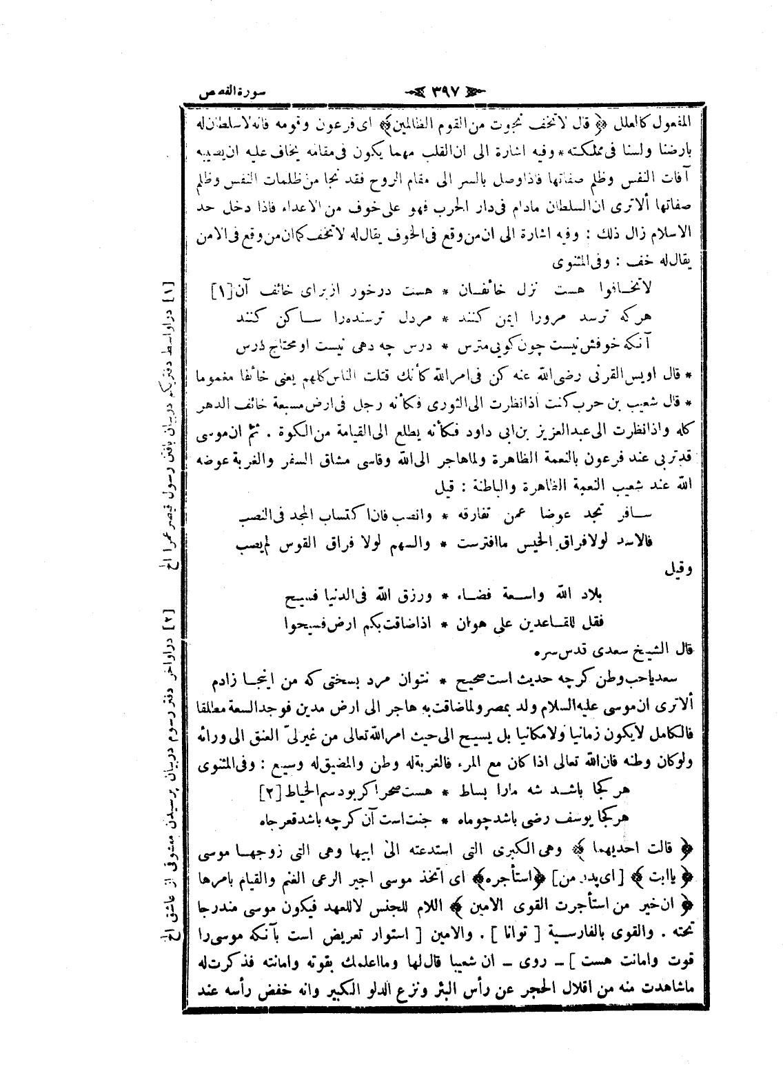 ألا ترى ان موسى عليه السلام ولد بمصر ولما ضاقت به هاجر الى ارض مدين فوجد السعة مطلقا فالكامل لا يكون زمانيا ولا مكانيا بل يسيح الى حيث امر الله تعالى من غير لىّ العنق الى ورائه ولو كان وطنه فان الله تعالى إذا كان مع المرء فالغربة له وطن والمضيق له وسيع: وفى المثنوى