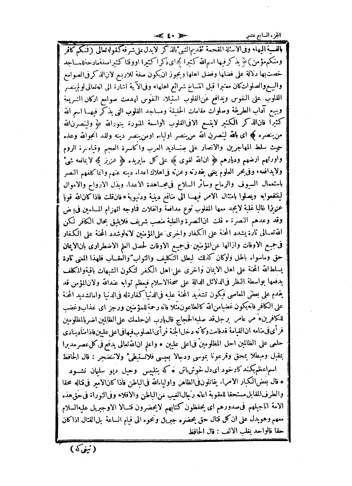 بالنسبة إليها وفى الاسئلة المقحمة تقديم الشيء بالذكر لا يدل على شرفه كقوله تعالى (فَمِنْكُمْ كافِرٌ وَمِنْكُمْ مُؤْمِنٌ) يُذْكَرُ فِيهَا اسْمُ اللَّهِ كَثِيراً اى ذكرا كثيرا او وقتا كثيرا صفة مادحة للمساجد خصت بها دلالة على فضلها وفضل أهلها ويجوز ان يكون صفة للاربع لان الذكر فى الصوامع والبيع والصلوات كان معتبرا قبل انتساخ شرائع أهلها وفى الآية اشارة الى انه تعالى لو لم ينصر القلوب على النفوس ويدافع عن القلوب استيلاء النفوس لهدمت صوامع اركان الشريعة وبيع آداب الطريقة وصلوات مقامات الحقيقة ومساجد القلوب التي يذكر فيها اسم الله كثيرا فان الذكر الكثير لا يتسع الا فى القلوب الواسعة المنورة بنور الله وَلَيَنْصُرَنَّ اللَّهُ مَنْ يَنْصُرُهُ اى بالله لينصرن الله من ينصر أولياءه او من ينصر دينه ولقد أنجز الله وعده حيث سلط المهاجرين والأنصار على صناديد العرب وأكاسرة العجم وقياصرة الروم وأورثهم ارضهم وديارهم إِنَّ اللَّهَ لَقَوِيٌّ على كل ما يريده عَزِيزٌ لا يمانعه شىء ولا يدافعه وفى بحر العلوم يغنى بقدرته وعزته فى إهلاك اعداء دينه عنهم وانما كلفهم النصر باستعمال السيوف والرماح وسائر السلاح فى مجاهدة الأعداء وبذل الأرواح والأموال لينتفعوا به ويصلوا بامتثال الأمر فيها الى منافع دينية ودنيوية فان قلت فاذا كان الله قويا عزيزا غالبا غلبة لا يجد معها المغلوب نوع مدافعة وانفلات فما وجه انهزام المسلمين فى بعض وقد وعدهم النصرة قلت ان النصرة والغلبة منصب شريف فلا يليق بحال الكافر لكن الله تعالى تارة يشدد المحنة على الكفار واخرى على المؤمنين لانه لو شدد المحنة على الكفار فى جميع الأوقات وأزالها عن المؤمنين فى جميع الأوقات لحصل العلم الاضطراري بان الايمان حق وما سواه باطل ولو كان كذلك لبطل التكليف والثواب والعقاب فلهذا المعنى تارة يسلط الله المحنة على اهل الايمان واخرى على اهل الكفر لتكون الشبهات باقية والمكلف يدفعها بواسطة النظر فى الدلائل الدالة على صحة الإسلام فيعظم ثوابه عند الله ولان المؤمن قد يقدم على بعض المعاصي فيكون تشديد المحنة عليه فى الدنيا كفارة له