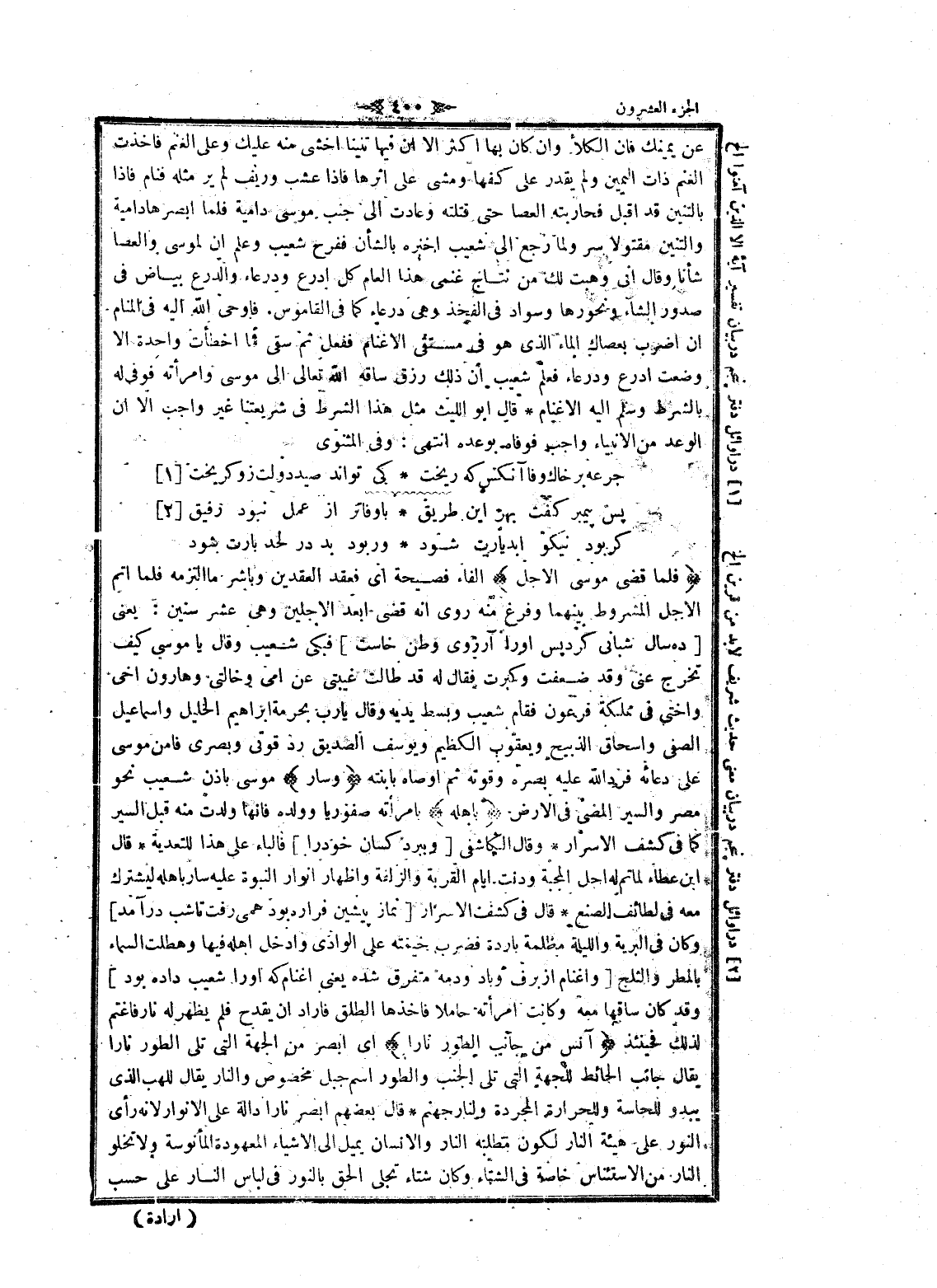 عن يمينك فان الكلأ وان كان بها اكثر الا ان فيها تنينا أخشى منه عليك وعلى الغنم فاخذت الغنم ذات اليمين ولم يقدر على كفها ومشى على اثرها فاذا عشب وريف لم ير مثله فنام فاذا بالتنين قد اقبل فحاربته العصا حتى قتلته وعادت الى جنب موسى دامية فلما ابصر هادامية والتنين مقتولا سر ولما رجع الى شعيب أخبره بالشأن ففرح شعيب وعلم ان لموسى والعصا شأنا وقال انى وهبت لك من نتاج غنمى هذا العام كل ادرع ودرعاء والدرع بياض فى صدور الشاء ونحورها وسواد فى الفخذ وهى درعاء كما فى القاموس. فاوحى الله اليه فى المنام ان اضرب بعصاك الماء الذي هو فى مستقى الأغنام ففعل ثم سقى فما اخطأت واحدة الا وضعت ادرع ودرعاء فعلم شعيب ان ذلك رزق ساقه الله تعالى الى موسى وامرأته فوفى له بالشرط وسلم اليه الأغنام قال ابو الليث مثل هذا الشرط فى شريعتنا غير واجب الا ان الوعد من الأنبياء واجب فوفاه بوعده انتهى: وفى المثنوى