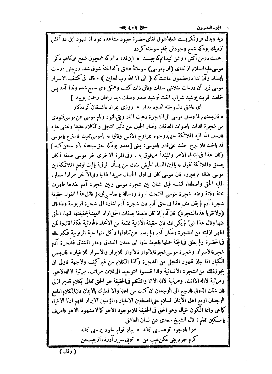 ومرتبة لا اله الا أنت. ومرتبة لا اله الا انا والمتكلم فى الحقيقة هو الحق تعالى بكلام قديم ازلى فان شئت الذوق فارجع الى الوجدان ان كنت من اهله والا فعليك بالايمان فان الكلام اما مع الوجدان او مع اهل الايمان فسلام على المصطفين الأخيار والمؤمنين الأبرار اللهم أرنا الأشياء كما هى وانما الكون خيال وهو الحق فى الحقيقة فلا موجود الا هو كما لا مشهود الا هو فاعرف يا مسكين تغنم: قال الشيخ سعدى عن لسان العاشق