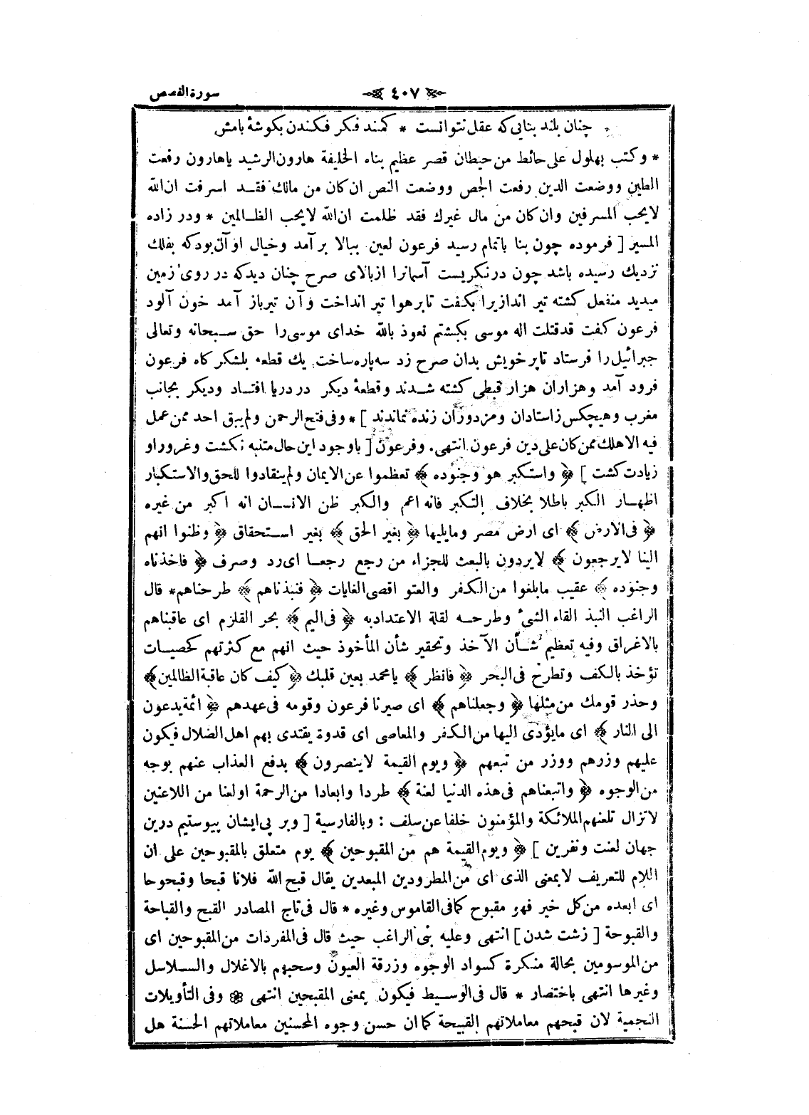 وكتب بهلول على حائط من حيطان قصر عظيم بناه الخليفة هارون الرشيد يا هارون رفعت الطين ووضعت الدين رفعت الجص ووضعت النص ان كان من مالك فقد أسرفت ان الله لا يحب المسرفين وان كان من مال غيرك فقد ظلمت ان الله لا يحب الظالمين ودر زاده المسير [فرموده چون بنا بإتمام رسيد فرعون لعين ببالا برآمد وخيال او آن بود كه بفلك نزديك رسيده باشد چون در نكريست آسمان را از بالاى صرح چنان ديد كه در روى زمين ميديد منفعل كشته تير اندازى را بكفت تا بر هوا تير انداخت وآن تير باز آمد خون آلود فرعون كفت قد قتلت اله موسى بكشتم نعوذ بالله خداى موسى را حق سبحانه وتعالى جبرائيل را فرستاد تا پر خويش بدان صرح زد سه پاره ساخت. يك قطعه بلشگرگاه فرعون فرود آمد وهزاران هزار قبطى كشته شدند وقطعه ديكر در دريا افتاد وديكر بجانب مغرب وهيچكس ز استادان ومزدوران زنده نماندند] وفى فتح الرحمن ولم يبق أحد ممن عمل فيه الا هلك ممن كان على دين فرعون انتهى. وفرعون [با وجود اين حال متنبه نكشت وغرور او زيادت كشت] وَاسْتَكْبَرَ هُوَ وَجُنُودُهُ تعظموا عن الايمان ولم ينقادوا للحق والاستكبار اظهار الكبر باطلا بخلاف التكبر فانه أعم والكبر ظن الإنسان انه اكبر من غيره فِي الْأَرْضِ اى ارض مصر وما يليها بِغَيْرِ الْحَقِّ بغير استحقاق وَظَنُّوا أَنَّهُمْ إِلَيْنا لا يُرْجَعُونَ لا يردون بالبعث للجزاء من رجع رجعا اى رد وصرف فَأَخَذْناهُ وَجُنُودَهُ عقيب ما بلغوا من الكفر والعتو أقصى الغايات فَنَبَذْناهُمْ طرحناهم قال الراغب النبذ إلقاء الشيء وطرحه لقلة الاعتداد به فِي الْيَمِّ بحر القلزم اى عاقبناهم بالاغراق وفيه تعظيم شأن الآخذ وتحقير شأن المأخوذ حيث انهم مع كثرتهم كحصيات تؤخذ بالكف وتطرح فى البحر فَانْظُرْ يا محمد بعين قلبك كَيْفَ كانَ عاقِبَةُ الظَّالِمِينَ وحذر قومك من مثلها وَجَعَلْناهُمْ اى صيرنا فرعون وقومه فى عهدهم أَئِمَّةً يَدْعُونَ إِلَى النَّارِ اى ما يؤدى إليها من الكفر والمعاصي اى قدوة يقتدى بهم اهل الضلال فيكون عليهم وزرهم ووزر من تبعهم وَيَوْمَ الْقِيامَةِ لا يُنْصَرُونَ بدفع العذاب عنهم بوجه من الوجوه وَأَتْبَعْناهُمْ فِي هذِهِ الدُّنْيا لَعْنَةً طردا وابعادا من الرحمة او لعنا من اللاعنين لا تزال تلعنهم الملائكة والمؤمنون خلفا عن سلف: وبالفارسية [وبر پى ايشان پيوستيم درين جهان لعنت ونفرين] وَيَوْمَ الْقِيامَةِ هُمْ مِنَ الْمَقْبُوحِينَ يوم متعلق بالمقبوحين على ان اللام للتعريف لا بمعنى الذي اى من المطرودين المبعدين يقال قبح الله فلانا قبحا وقبحوحا اى أبعده من كل خير فهو مقبوح كما فى القاموس وغيره قال فى تاج المصادر القبح والقباحة والقبوحة [زشت شدن] انتهى وعليه بنى الراغب حيث قال فى المفردات من المقبوحين اى من الموسومين بحالة منكرة كسواد الوجوه وزرقة العيون وسحبهم بالاغلال والسلاسل وغيرها انتهى باختصار قال فى الوسيط فيكون بمعنى المقبحين انتهى وفى التأويلات النجمية لان قبحهم معاملاتهم القبيحة كما ان حسن وجوه المحسنين معاملاتهم الحسنة هل