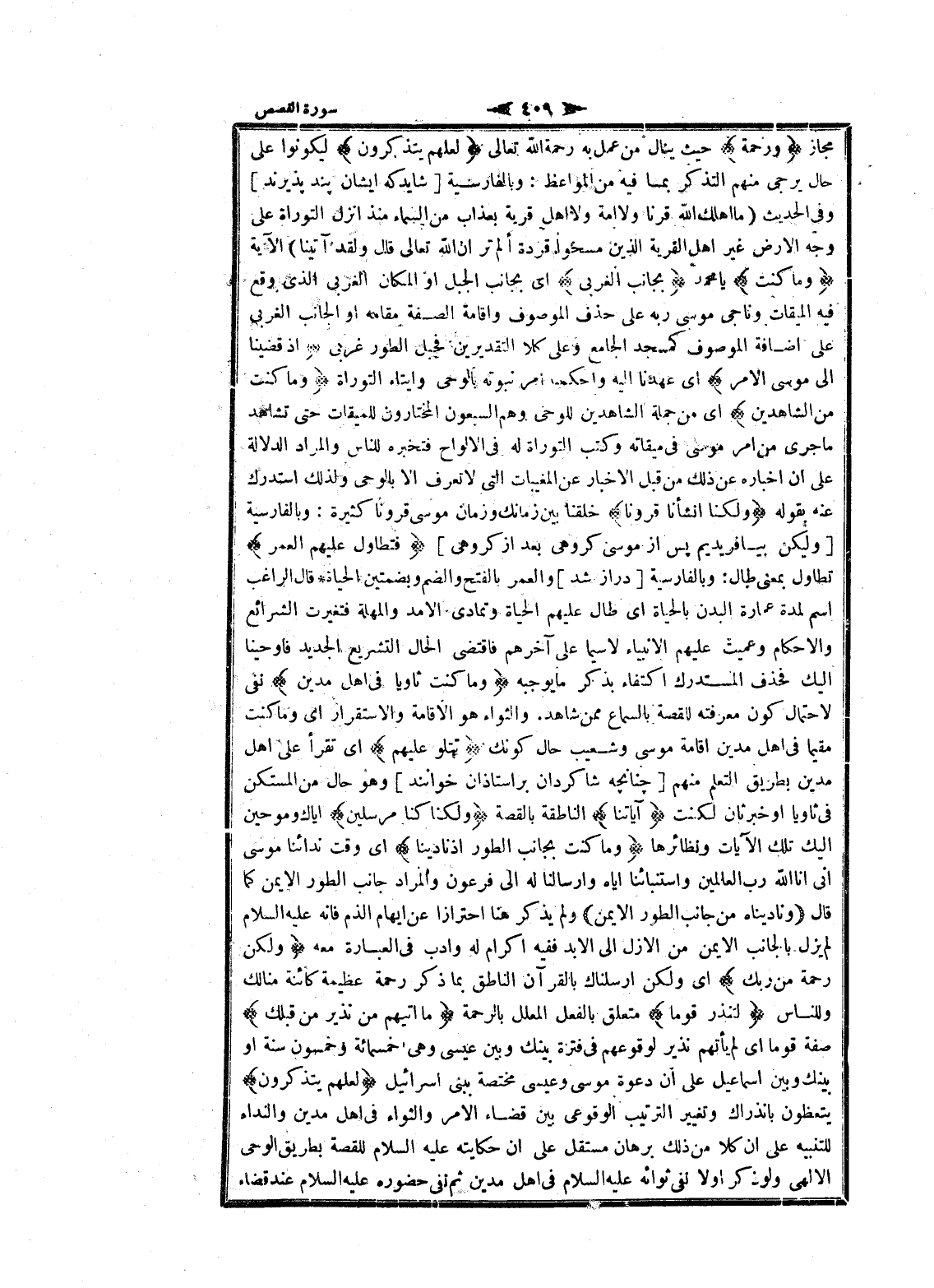 مجاز وَرَحْمَةً حيث ينال من عمل به رحمة الله تعالى لَعَلَّهُمْ يَتَذَكَّرُونَ ليكونوا على حال يرجى منهم التذكر بما فيه من المواعظ: وبالفارسية [شايد كه ايشان پند پذيرند] وفى الحديث (ما أهلك الله قرنا ولا امة ولا اهل قرية بعذاب من السماء منذ انزل التوراة على وجه الأرض غير اهل القرية الذين مسخوا قردة ألم تر ان الله تعالى قال ولقد آتينا) الآية وَما كُنْتَ يا محمد بِجانِبِ الْغَرْبِيِّ اى بجانب الجبل او المكان الغربي الذي وقع فيه الميقات وناجى موسى ربه على حذف الموصوف واقامة الصفة مقامه او الجانب الغربي على اضافة الموصوف كمسجد الجامع وعلى كلا التقديرين فجبل الطور غربى إِذْ قَضَيْنا إِلى مُوسَى الْأَمْرَ اى عهدنا اليه وأحكمنا امر نبوته بالوحى وإيتاء التوراة وَما كُنْتَ مِنَ الشَّاهِدِينَ اى من جملة الشاهدين للوحى وهم السبعون المختارون للميقات حتى تشاهد ماجرى من امر موسى فى ميقاته وكتب التوراة له فى الألواح فتخبره للناس والمراد الدلالة على ان اخباره عن ذلك من قبل الاخبار عن المغيبات التي لا تعرف الا بالوحى ولذلك استدرك عنه بقوله وَلكِنَّا أَنْشَأْنا قُرُوناً خلقنا بين زمانك وزمان موسى قرونا كثيرة: وبالفارسية [وليكن بيافريديم پس از موسى كروهى بعد از كروهى] فَتَطاوَلَ عَلَيْهِمُ الْعُمُرُ تطاول بمعنى طال: وبالفارسية [دراز شد] والعمر بالفتح والضم وبضمتين الحياة قال الراغب اسم لمدة عمارة البدن بالحياة اى طال عليهم الحياة وتمادى الأمد والمهلة فتغيرت الشرائع والاحكام وعميت عليهم الأنبياء لا سيما على آخرهم فاقتضى الحال التشريع الجديد فاوحينا إليك فحذف المستدرك اكتفاء بذكر ما يوجبه وَما كُنْتَ ثاوِياً فِي أَهْلِ مَدْيَنَ نفى لاحتمال كون معرفته للقصة بالسماع ممن شاهد. والثواء هو الاقامة والاستقرار اى وما كنت مقيما فى اهل مدين اقامة موسى وشعيب حال كونك تَتْلُوا عَلَيْهِمْ اى تقرأ على اهل مدين بطريق التعلم منهم [چنانچهـ شاكردان بر استاذان خوانند] وهو حال من المستكن فى ثاويا او خبر ثان لكنت آياتِنا الناطقة بالقصة وَلكِنَّا كُنَّا مُرْسِلِينَ إياك وموحين إليك تلك الآيات ونظائرها وَما كُنْتَ بِجانِبِ الطُّورِ إِذْ نادَيْنا اى وقت ندائنا موسى انى انا الله رب العالمين واستنبائنا إياه وارسالنا له الى فرعون والمراد جانب الطور الايمن كما قال (وَنادَيْناهُ مِنْ جانِبِ الطُّورِ الْأَيْمَنِ) ولم يذكر هنا احترازا عن إيهام الذم فانه عليه السلام لم يزل بالجانب الايمن من الأزل الى الابد ففيه إكرام له وادب فى العبارة معه وَلكِنْ رَحْمَةً مِنْ رَبِّكَ اى ولكن أرسلناك بالقرآن الناطق بما ذكر رحمة عظيمة كائنة منا لك وللناس لِتُنْذِرَ قَوْماً متعلق بالفعل المعلل بالرحمة ما أَتاهُمْ مِنْ نَذِيرٍ مِنْ قَبْلِكَ صفة قوما اى لم يأتهم نذير لوقوعهم فى فترة بينك وبين عيسى وهى خمسمائة وخمسون سنة او بينك وبين إسماعيل على ان دعوة موسى وعيسى مختصة ببني إسرائيل لَعَلَّهُمْ يَتَذَكَّرُونَ يتعظون بانذارك وتغيير الترتيب الوقوعى بين قضاء الأمر والثواء فى اهل مدين والنداء للتنبيه على ان كلا من ذلك برهان مستقل على ان حكايته عليه السلام للقصة بطريق الوحى الإلهي ولو ذكر اولا نفى ثوائه عليه السلام فى اهل مدين ثم نفى حضوره عليه السلام عند قضاء