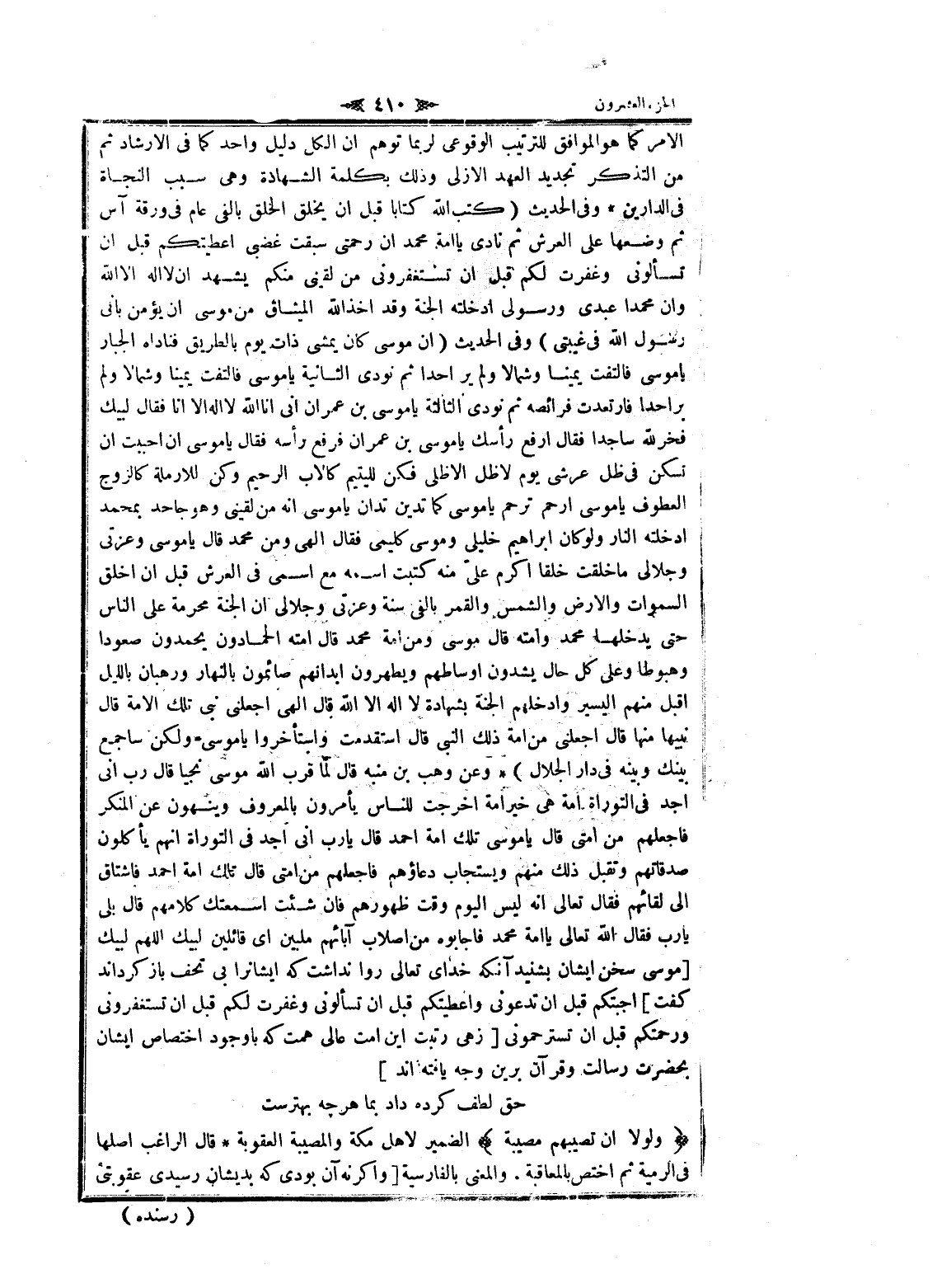الأمر كما هو الموافق للترتيب الوقوعى لربما توهم ان الكل دليل واحد كما فى الإرشاد ثم من التذكر تجديد العهد الأزلي وذلك بكلمة الشهادة وهى سبب النجاة فى الدارين وفى الحديث (كتب الله كتابا قبل ان يخلق الخلق بألفي عام فى ورقة آس ثم وضعها على العرش ثم نادى يا امة محمد ان رحمتى سبقت غضبى أعطيتكم قبل ان تسألونى وغفرت لكم قبل ان تستغفرونى من لقينى منكم يشهد ان لا اله الا الله وان محمدا عبدى ورسولى أدخلته الجنة وقد أخذ الله الميثاق من موسى ان يؤمن بانى رسول الله فى غيبتى) وفى الحديث (ان موسى كان يمشى ذات يوم بالطريق فناداه الجبار يا موسى فالتفت يمينا وشمالا ولم ير أحدا ثم نودى الثانية يا موسى فالتفت يمينا وشمالا ولم ير أحدا فارتعدت فرائصه ثم نودى الثالثة يا موسى بن عمران انى انا الله لا اله الا انا فقال لبيك فخر لله ساجدا فقال ارفع رأسك يا موسى بن عمران فرفع رأسه فقال يا موسى ان أحببت ان تسكن فى ظل عرشى يوم لا ظل الا ظلى فكن لليتيم كالاب الرحيم وكن للارملة كالزوج العطوف يا موسى ارحم ترحم يا موسى كما تدين تدان يا موسى انه من لقينى وهو جاحد بمحمد أدخلته النار ولو كان ابراهيم خليلى وموسى كليمى فقال الهى ومن محمد قال يا موسى وعزتى وجلالى ما خلقت خلقا أكرم علىّ منه كتبت اسمه مع اسمى فى العرش قبل ان اخلق السموات والأرض والشمس والقمر بألفي سنة وعزتى وجلالى ان الجنة محرمة على الناس حتى يدخلها محمد وأمته قال موسى ومن امة محمد قال أمته الحمادون يحمدون صعودا وهبوطا وعلى كل حال يشدون أوساطهم ويطهرون أبدانهم صائمون بالنهار ورهبان بالليل اقبل منهم اليسير وأدخلهم الجنة بشهادة لا اله الا الله قال الهى اجعلنى نبى تلك الامة قال نبيها منها قال اجعلنى من امة ذلك النبي قال استقدمت واستأخروا يا موسى ولكن ساجمع بينك وبينه فى دار الجلال) وعن وهب بن منبه قال لما قرب الله موسى نجيا قال رب انى أجد فى التوراة امة هى خير امة أخرجت للناس يأمرون بالمعروف وينهون عن المنكر فاجعلهم من أمتي قال يا موسى تلك امة احمد قال يا رب انى أجد فى التوراة انهم يأكلون صدقاتهم وتقبل ذلك منهم ويستجاب دعاؤهم فاجعلهم من أمتي قال تلك امة احمد فاشتاق الى لقائهم فقال تعالى انه ليس اليوم وقت ظهورهم فان شئت أسمعتك كلامهم قال بلى يا رب فقال الله تعالى يا امة محمد فاجابوه من أصلاب آبائهم ملبين اى قائلين لبيك اللهم لبيك [موسى سخن ايشان بشنيد آنكه خداى تعالى روا نداشت كه ايشانرا بي تحف باز كرداند كفت] أجبتكم قبل ان تدعونى وأعطيتكم قبل ان تسألونى وغفرت لكم قبل ان تستغفرونى ورحمتكم قبل ان تسترحمونى [زهى رتبت اين امت عالى همت كه با وجود اختصاص ايشان بحضرت رسالت وقرآن برين وجه يافته اند]