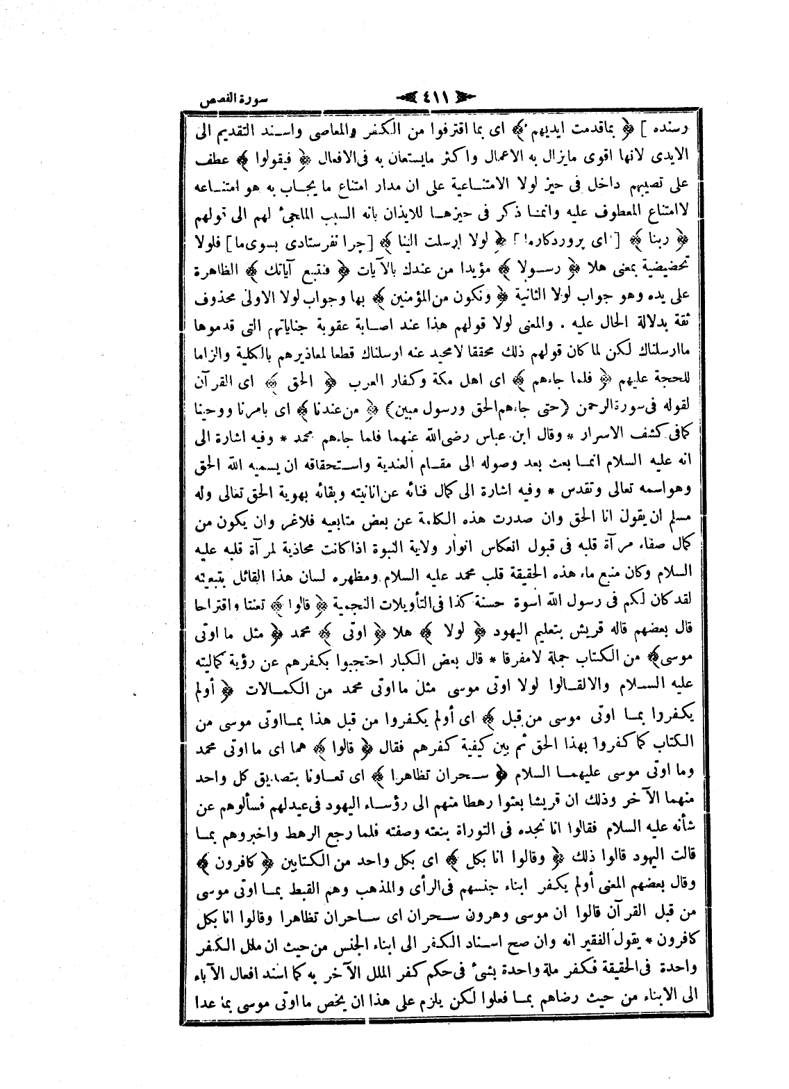 رسنده] بِما قَدَّمَتْ أَيْدِيهِمْ اى بما اقترفوا من الكفر والمعاصي وأسند التقديم الى الأيدي لانها أقوى ما يزال به الأعمال واكثر ما يستعان به فى الافعال فَيَقُولُوا عطف على تصيبهم داخل فى حيز لولا الامتناعية على ان مدار امتناع ما يجاب به هو امتناعه لا امتناع المعطوف عليه وانما ذكر فى حيزها للايذان بانه السبب الملجئ لهم الى قولهم رَبَّنا [اى پروردگار ما] لَوْلا أَرْسَلْتَ إِلَيْنا [چرا نفرستادى بسوى ما] فلولا تحضيضية بمعنى هلا رَسُولًا مؤيدا من عندك بالآيات فَنَتَّبِعَ آياتِكَ الظاهرة على يده وهو جواب لولا الثانية وَنَكُونَ مِنَ الْمُؤْمِنِينَ بها وجواب لولا الاولى محذوف ثقة بدلالة الحال عليه. والمعنى لولا قولهم هذا عند إصابة عقوبة جناياتهم التي قدموها ما أرسلناك لكن لما كان قولهم ذلك محققا لا محيد عنه أرسلناك قطعا لمعاذيرهم بالكلية وإلزاما للحجة عليهم فَلَمَّا جاءَهُمُ اى اهل مكة وكفار العرب الْحَقُّ اى القرآن لقوله فى سورة الرحمن (حَتَّى جاءَهُمُ الْحَقُّ وَرَسُولٌ مُبِينٌ) مِنْ عِنْدِنا اى بامرنا ووحينا كما فى كشف الاسرار وقال ابن عباس رضى الله عنهما فلما جاءهم محمد وفيه اشارة الى انه عليه السلام انما بعث بعد وصوله الى مقام العندية واستحقاقه ان يسميه الله الحق وهو اسمه تعالى وتقدس وفيه اشارة الى كمال فنائه عن انانيته وبقائه بهوية الحق تعالى وله مسلم ان يقول انا الحق وان صدرت هذه الكلمة عن بعض متابعيه فلا غرو ان يكون من كمال صفاء مرآة قلبه فى قبول انعكاس أنوار ولاية النبوة إذا كانت محاذية لمرآة قلبه عليه السلام وكان منبع ماء هذه الحقيقة قلب محمد عليه السلام ومظهره لسان هذا القائل بتبعيته لقد كان لكم فى رسول الله أسوة حسنة كذا فى التأويلات النجمية قالُوا تعنتا واقتراحا قال بعضهم قاله قريش بتعليم اليهود لَوْلا هلا أُوتِيَ محمد مِثْلَ ما أُوتِيَ مُوسى من الكتاب جملة لا مفرقا قال بعض الكبار احتجبوا بكفرهم عن رؤية كماليته عليه السلام والا لقالوا لولا اوتى موسى مثل ما اوتى محمد من الكمالات أَوَلَمْ يَكْفُرُوا بِما أُوتِيَ مُوسى مِنْ قَبْلُ اى أو لم يكفروا من قبل هذا بما اوتى موسى من الكتاب كما كفروا بهذا الحق ثم بين كيفية كفرهم فقال قالُوا هما اى ما اوتى محمد وما اوتى موسى عليهما السلام سِحْرانِ تَظاهَرا اى تعاونا بتصديق كل واحد منهما الآخر وذلك ان قريشا بعثوا رهطا منهم الى رؤساء اليهود فى عيد لهم فسألوهم عن شأنه عليه السلام فقالوا انا نجده فى التوراة بنعته وصفته فلما رجع الرهط واخبروهم بما قالت اليهود قالوا ذلك وَقالُوا إِنَّا بِكُلٍّ اى بكل واحد من الكتابين كافِرُونَ وقال بعضهم المعنى أو لم يكفر أبناء جنسهم فى الرأى والمذهب وهم القبط بما اوتى موسى من قبل القرآن قالوا ان موسى وهرون سحران اى ساحران تظاهرا وقالوا انا بكل كافرون يقول الفقير انه وان صح اسناد الكفر الى أبناء الجنس من حيث ان ملل الكفر واحدة فى الحقيقة فكفر ملة واحدة بشىء فى حكم كفر الملل الآخر به كما أسند افعال الآباء الى الأبناء من حيث رضاهم بما فعلوا لكن يلزم على هذا ان يخص ما اوتى موسى بما عدا