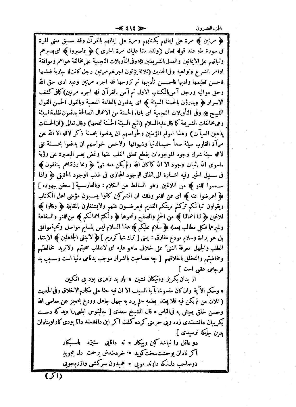 مَرَّتَيْنِ مرة على ايمانهم بكتابهم ومرة على ايمانهم بالقرآن وقد سبق معنى المرة فى سورة طه عند قوله تعالى (وَلَقَدْ مَنَنَّا عَلَيْكَ مَرَّةً أُخْرى) بِما صَبَرُوا اى بصبرهم وثباتهم على الايمانين والعمل بالشريعتين وفى التأويلات النجمية على مخالفة هواهم وموافقة أوامر الشرع ونواهيه وفى الحديث (ثلاثة يؤتون أجرهم مرتين رجل كانت له جارية فعلمها فاحسن تعليمها وادبها فاحسن تأديبها ثم تزوجها فله اجره مرتين وعبد ادى حق الله وحق مواليه ورجل آمن بالكتاب الاول ثم آمن بالقرآن فله اجره مرتين) كما فى كشف الاسرار وَيَدْرَؤُنَ بِالْحَسَنَةِ السَّيِّئَةَ اى يدفعون بالطاعة المعصية وبالقول الحسن القول القبيح وفى التأويلات النجمية اى بأداء الحسنة من الأعمال الصالحة يدفعون ظلمة السيئة وهى مخالفات الشريعة كما قال عليه السلام (اتبع السيئة الحسنة تمحها) وقال تعالى (إِنَّ الْحَسَناتِ يُذْهِبْنَ السَّيِّئاتِ) وهذا لعوام المؤمنين ولخواصهم ان يدفعوا بحسنة ذكر لا اله الا الله عن مرآة القلوب سيئة صدأ حب الدنيا وشهواتها ولا خص خواصهم ان يدفعوا بحسنة نفى لا اله سيئة شرك وجود الموجودات بقطع تعلق القلب عنها وغض بصر البصيرة عن رؤية ما سوى الله بإثبات وجود الا الله كما كان الله ولم يكن معه شىء وَمِمَّا رَزَقْناهُمْ يُنْفِقُونَ فى سبيل الخير وفيه اشارة الى انفاق الوجود المجازى فى طلب الوجود الحقيقي وَإِذا سَمِعُوا اللَّغْوَ من اللاغين وهو الساقط من الكلام: وبالفارسية [سخن بيهوده] أَعْرَضُوا عَنْهُ اى عن اللغو وذلك ان المشركين كانوا يسبون مؤمنى اهل الكتاب ويقولون تبا لكم تركتم دينكم القديم فيعرضون عنهم ولا يشتغلون بالمقابلة وَقالُوا للاغين لَنا أَعْمالُنا من الحلم والصفح ونحوهما وَلَكُمْ أَعْمالُكُمْ من اللغو والسفاهة وغيرهما فكل مطالب بعمله سَلامٌ عَلَيْكُمْ هذا السلام ليس بتسليم مواصل وتحية موافق بل هو براءة وسلام مودع مفارق: يعنى [ترك شما كرديم] لا نَبْتَغِي الْجاهِلِينَ) الابتغاء الطلب والجهل معرفة الشيء على خلاف ما هو عليه اى لا نطلب صحبتهم ولا نريد مخالطتهم ومخاطبتهم والتخلق بأخلاقهم [چهـ مصاحبت با اشرار موجب بدنامى دنيا است وسبب بد فرجامى عقبى است]