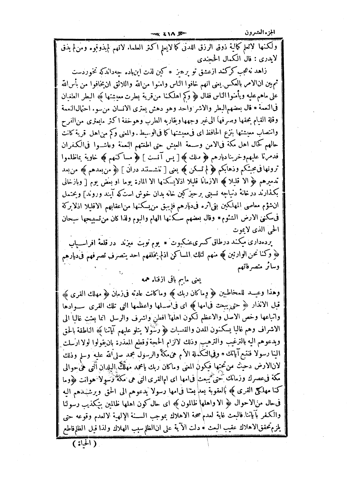 ثم بين ان الأمر بالعكس يعنى انهم خافوا الناس وأمنوا من الله واللائق ان يخافوا من بأس الله على ما هم عليه ويأمنوا الناس فقال وَكَمْ أَهْلَكْنا مِنْ قَرْيَةٍ بَطِرَتْ مَعِيشَتَها البطر الطغيان فى النعمة قال بعضهم البطر والأشر واحد وهو دهش يعترى الإنسان من سوء احتمال النعمة وقلة القيام بحقها وصرفها الى غير وجهها ويقاربه الطرب وهو خفة اكثر ما يعترى من الفرح وانتصاب معيشتها بنزع الحافظ اى فى معيشتها كما فى الوسيط. والمعنى وكم من اهل قرية كانت حالهم كحال اهل مكة فى الامن وسعة العيش حتى أطغتهم النعمة وعاشوا فى الكفران فدمرنا عليهم وخربنا ديارهم فَتِلْكَ [پس آنست] مَساكِنُهُمْ خاوية بما ظلموا ترونها فى مجيئكم وذهابكم لَمْ تُسْكَنْ يعنى [ننشستند دران] مِنْ بَعْدِهِمْ من بعد تدميرهم إِلَّا قَلِيلًا الا زمانا قليلا إذ لا يسكنها الا المارة يوما او بعض يوم [وباز خالى بگذارند در خانه دنيا چهـ نشستى برخيز كين خانه بدان خوش است كه آيند وروند] ويحتمل ان شؤم معاصى المهلكين بقي اثره فى ديارهم فلم يبق من يسكنها من أعقابهم الا قليلا إذ لا بركة فى سكنى الأرض الشؤم وقال بعضهم سكنها الهام والبوم ولذا كان من تسبيحها سبحان الحي الذي لا يموت