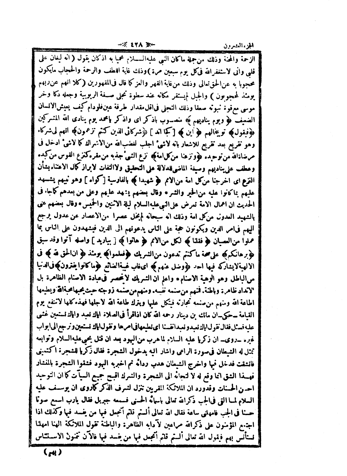 الزحمة والمحنة وذلك من جمله ما كان النبي عليه السلام محميا به إذ كان يقول (انه ليغان على قلبى وانى لاستغفر الله فى كل يوم سبعين مرة) وذلك غابة اللطف والرحمة والحجاب ما يكون محجوبا به عن الحق تعالى وذلك من غاية القهر والعز كما قال فى المقهورين (كَلَّا إِنَّهُمْ عَنْ رَبِّهِمْ يَوْمَئِذٍ لَمَحْجُوبُونَ) والجبل لم يستقر مكانه عند سطوة تجلى صفة الربوبية وجعله دكا وخر موسى مع قوة نبوته صعقا وذلك التجلي فى اقل مقدار طرفة عين فلو دام كيف يعيش الإنسان الضعيف وَيَوْمَ يُنادِيهِمْ منصوب باذكر اى واذكر يا محمد يوم ينادى الله المشركين فَيَقُولُ توبيخا لهم أَيْنَ [كجااند] شُرَكائِيَ الَّذِينَ كُنْتُمْ تَزْعُمُونَ انهم لى شركاء وهو تقريع بعد تقريع للاشعار بانه لا شىء اجلب لغضب الله من الإشراك كما لا شىء ادخل فى مرضاة الله من توحيده وَنَزَعْنا مِنْ كُلِّ أُمَّةٍ نزع الشيء جذبه من مقره كنزع القوس من كبده وعطف على يناديهم وصيغة الماضي للدلالة على التحقيق ولا التفات لابراز كمال الاعتناء بشأن النزع اى أخرجنا من كل امة من الأمم شَهِيداً بالفارسية [كواه] وهو نبيهم يشهد عليهم بما كانوا عليه من الخير والشر وقال بعضهم يشهد عليهم وعلى من بعدهم كما جاء فى الحديث ان اعمال الامة تعرض على النبي عليه السلام ليلة الاثنين والخميس وقال بعضهم عنى بالشهيد العدول من كل امة وذلك انه سبحانه لم يخل عصرا من الاعصار عن عدول يرجع إليهم فى امر الدين ويكونون حجة على الناس يدعونهم الى الدين فيشهدون على الناس بما عملوا من العصيان فَقُلْنا لكل من الأمم هاتُوا [بياريد] وأصله آتوا وقد سبق بُرْهانَكُمْ على صحة ما كنتم تدعون من الشريك فَعَلِمُوا يومئذ أَنَّ الْحَقَّ لِلَّهِ فى الالهية لا يشاركه فيها أحد وَضَلَّ عَنْهُمْ اى غاب غيبة الضائع وَما كانُوا يَفْتَرُونَ فى الدنيا من الباطل وهو الوهية الأصنام واعلم ان الشريك لا ينحصر فى عبادة الأصنام الظاهرة بل الانداد ظاهرة وباطنة. فمنهم من صنمه نفسه. ومنهم من صنمه زوجته حيث يحبها محبة الله ويطيعها إطاعة الله ومنهم من صنمه تجارته فيتكل عليها ويترك طاعة الله لاجلها فهذه كلها لا تنفع يوم القيامة- حكى- ان مالك بن دينار رحمه الله كان إذا قرأ فى الصلاة إياك نعبد وإياك نستعين غشى عليه فسئل فقال نقول إياك نعبد ونعبد أنفسنا اى نطيعها فى أمرها ونقول إياك نستعين ونرجع الى أبواب غيره- روى- ان زكريا عليه السلام لما هرب من اليهود بعد ان قتل يحيى عليه السلام وتوابعه تمثل له الشيطان فى صورة الراعي وأشار اليه بدخول الشجرة فقال زكريا للشجرة اكتمينى فانشقت فدخل فيها واخرج الشيطان هدب ردائه ثم اخبر به اليهود فشقوا الشجرة بالمنشار فهذا الشق انما وقع له لا لتجائه الى الشجرة والشرك أقبح جميع السيئات كما ان التوحيد احسن الحسنات وقد ورد ان الملائكة المقربين تنزل لشرف الذكر كما روى ان يوسف عليه السلام لما القى فى الجب ذكر الله تعالى بأسمائه الحسنى فسمعه جبريل فقال يا رب اسمع صوتا حسنا فى الجب فامهلنى ساعة فقال الله تعالى ألستم قلتم أتجعل فيها من يفسد فيها وكذلك إذا اجتمع المؤمنون على ذكر الله مراعين لآدابه الظاهرة والباطنة تقول الملائكة الهنا أمهلنا نستأنس بهم فيقول الله تعالى ألستم قلتم أتجعل فيها من يفسد فيها فالآن تتمنون الاستئناس