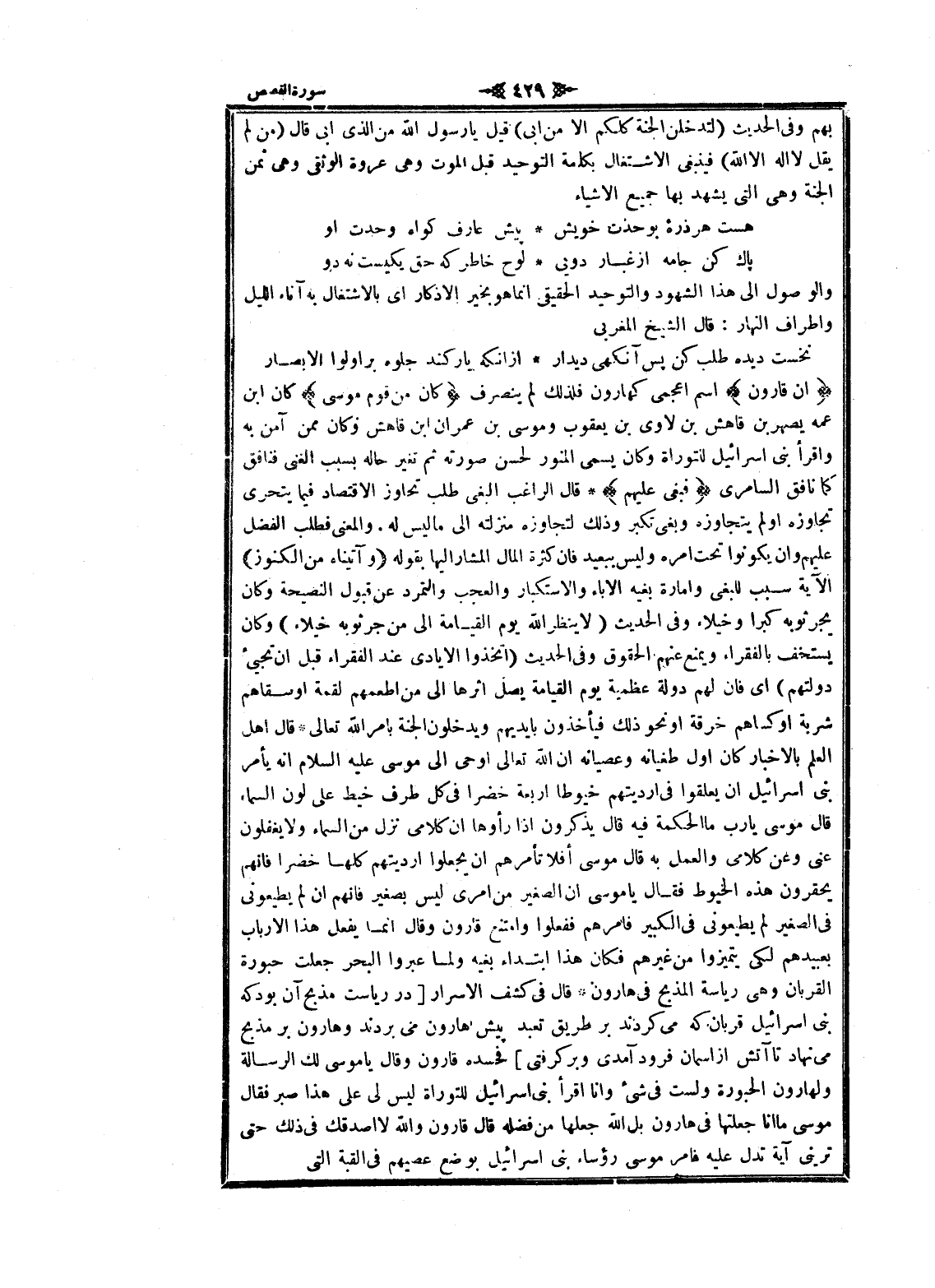 إِنَّ قارُونَ اسم أعجمي كهارون فلذلك لم ينصرف كانَ مِنْ قَوْمِ مُوسى كان ابن عمه يصهر بن قاهش بن لاوى بن يعقوب وموسى بن عمران ابن قاهش وكان ممن آمن به واقرأ بنى إسرائيل للتوراة وكان يسمى المنور لحسن صورته ثم تغير حاله بسبب الغنى فنافق كما نافق السامري فَبَغى عَلَيْهِمْ قال الراغب البغي طلب تجاوز الاقتصاد فيما يتحرى تجاوزه او لم يتجاوزه وبغى تكبر وذلك لتجاوزه منزلته الى ما ليس له. والمعنى فطلب الفضل عليهم وان يكونوا تحت امره وليس ببعيد فان كثرة المال المشار إليها بقوله (وَآتَيْناهُ مِنَ الْكُنُوزِ) الآية سبب للبغى وامارة بغيه الإباء والاستكبار والعجب والتمرد عن قبول النصيحة وكان يجر ثوبه كبرا وخيلاء وفى الحديث (لا ينظر الله يوم القيامة الى من جر ثوبه خيلاء) وكان يستخف بالفقراء ويمنع عنهم الحقوق وفى الحديث (اتخذوا الأيادي عند الفقراء قبل ان تجيىء دولتهم) اى فان لهم دولة عظمية يوم القيامة يصل اثرها الى من أطعمهم لقمة او سقاهم شربة او كساهم خرقة او نحو ذلك فيأخذون بايديهم ويدخلون الجنة بامر الله تعالى قال اهل العلم بالأخبار كان أول طغيانه وعصيانه ان الله تعالى اوحى الى موسى عليه السلام انه يأمر بنى إسرائيل ان يعلقوا فى أرديتهم خيوطا اربعة خضرا فى كل طرف خيط على لون السماء قال موسى يا رب ما الحكمة فيه قال يذكرون إذا رأوها ان كلامى نزل من السماء ولا يغفلون عنى وعن كلامى والعمل به قال موسى أفلا تأمرهم ان يجعلوا أرديتهم كلها خضرا فانهم يحقرون هذه الخيوط فقال يا موسى ان الصغير من امرى ليس بصغير فانهم ان لم يطيعونى فى الصغير لم يطيعونى فى الكبير فامرهم ففعلوا وامتنع قارون وقال انما يفعل هذا الأرباب بعبيدهم لكى يتميزوا من غيرهم فكان هذا ابتداء بغيه ولما عبروا البحر جعلت حبورة القربان وهى رياسة المذبح فى هارون قال فى كشف الاسرار [در رياست مذبح آن بود كه بنى إسرائيل قربان كه مى كردند بر طريق تعبد پيش هارون مى بردند وهارون بر مذبح مى نهاد تا آتش از اسمان فرود آمدى وبر كرفتى] فحسده قارون وقال يا موسى لك الرسالة ولهارون الحبورة ولست فى شىء وانا اقرأ بنى إسرائيل للتوراة ليس لى على هذا صبر فقال موسى ما انا جعلتها فى هارون بل الله جعلها من فضله قال قارون والله لا أصدقك فى ذلك حتى ترينى آية تدل عليه فامر موسى رؤساء بنى إسرائيل بوضع عصيهم فى القبة التي