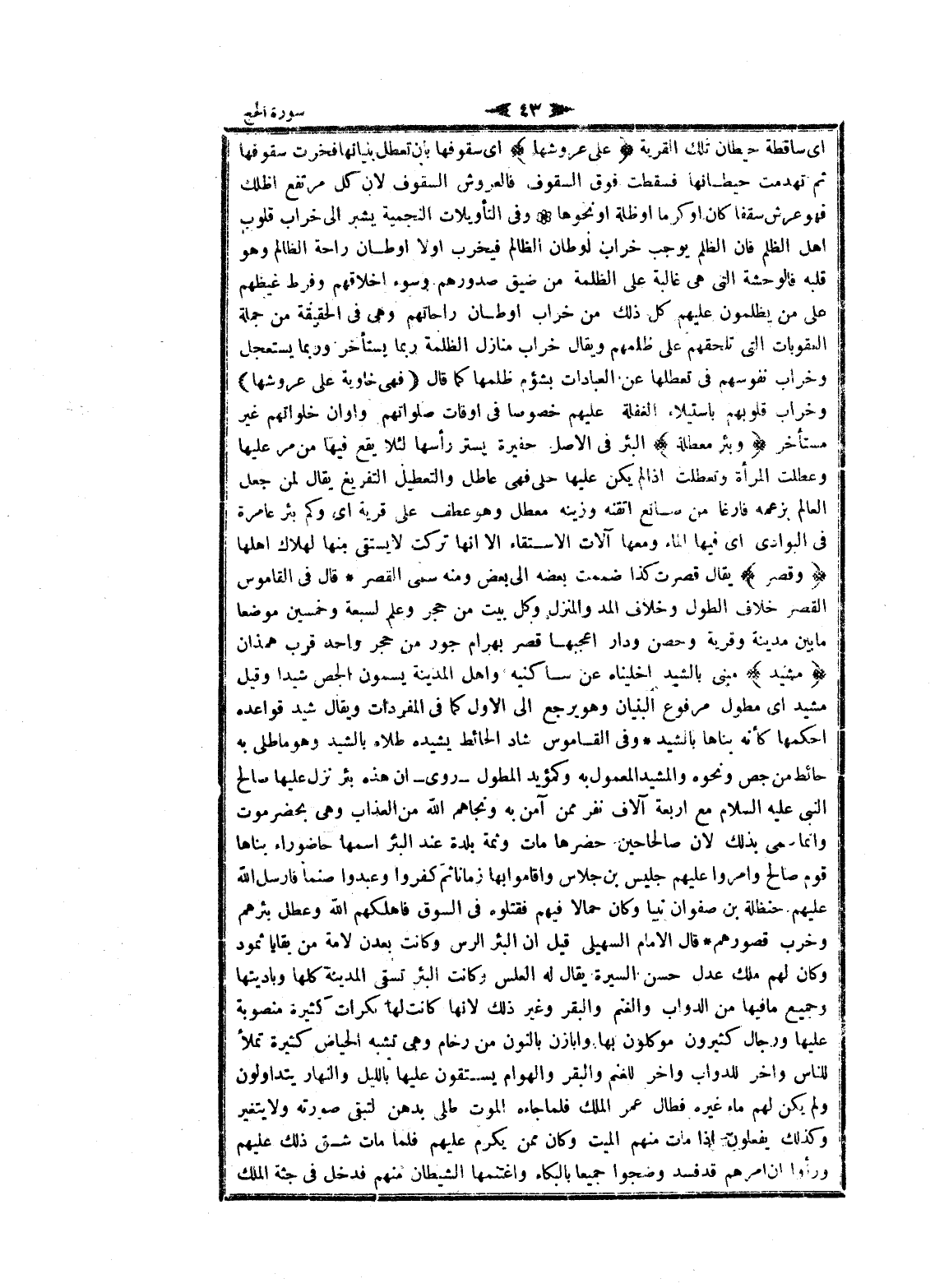 ودار أعجبها قصر بهرام جور من حجر واحد قرب همذان مَشِيدٍ مبنى بالشيد أخليناه عن ساكنيه واهل المدينة يسمون الجص شيدا وقيل مشيد اى مطول مرفوع البنيان وهو يرجع الى الاول كما فى المفردات ويقال شيد قواعده أحكمها كأنه بناها بالشيد وفى القاموس شاد الحائط يشيده طلاه بالشيد وهو ما طلى به حائط من جص ونحوه والمشيد المعمول به وكمؤيد المطول- روى- ان هذه بئر نزل عليها صالح النبي عليه السلام مع اربعة آلاف نفر ممن آمن به ونجاهم الله من العذاب وهى بحضر موت وانما سمى بذلك لان صالحاحين حضرها مات وثمة بلدة عند البئر اسمها حاضوراء بناها قوم صالح وأمروا عليهم جليس بن جلاس وأقاموا بها زمانا ثم كفروا وعبدوا صنما فارسل الله عليهم حنظلة بن صفوان نبيا وكان حمالا فيهم فقتلوه فى السوق فاهلكهم الله وعطل بئرهم وخرب قصورهم قال الامام السهيلي قيل ان البئر الرس وكانت بعدن لامة من بقايا ثمود وكان لهم ملك عدل حسن السيرة يقال له العلس وكانت البئر تسقى المدينة كلها وباديتها وجميع ما فيها من الدواب والغنم والبقر وغير ذلك لانها كانت لها بكرات كثيرة منصوبة عليها ورجال كثيرون موكلون بها وابازن بالنون من رخام وهى تشبه الحياض كثيرة تملأ للناس واخر للدواب واخر للغنم والبقر والهوام يستقون عليها بالليل والنهار يتداولون ولم يكن لهم ماء غيره فطال عمر الملك فلما جاءه الموت طلى بدهن لتبقى صورته ولا يتغير وكذلك يفعلون إذا مات منهم الميت وكان ممن يكرم عليهم فلما مات شق ذلك عليهم ورأوا ان أمرهم قد فسد وضجوا جميعا بالبكاء واغتنمها الشيطان منهم فدخل فى جثة الملك
