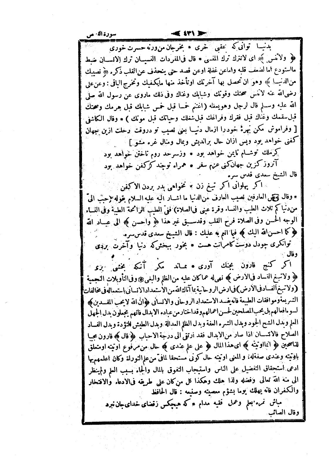 وقال بعض العارفين نصيب العارف من الدنيا ما أشار اليه عليه السلام بقوله (حبب الىّ من دنياكم ثلاث الطيب والنساء وقرة عينى فى الصلاة) ففى الطيب الرائحة الطيبة وفى النساء الوجه الحسن وفى الصلاة فرح القلب وقد سبق غير هذا وَأَحْسِنْ الى عباد الله كَما أَحْسَنَ اللَّهُ إِلَيْكَ فيما أنعم به عليك: قال الشيخ سعدى قدس سره