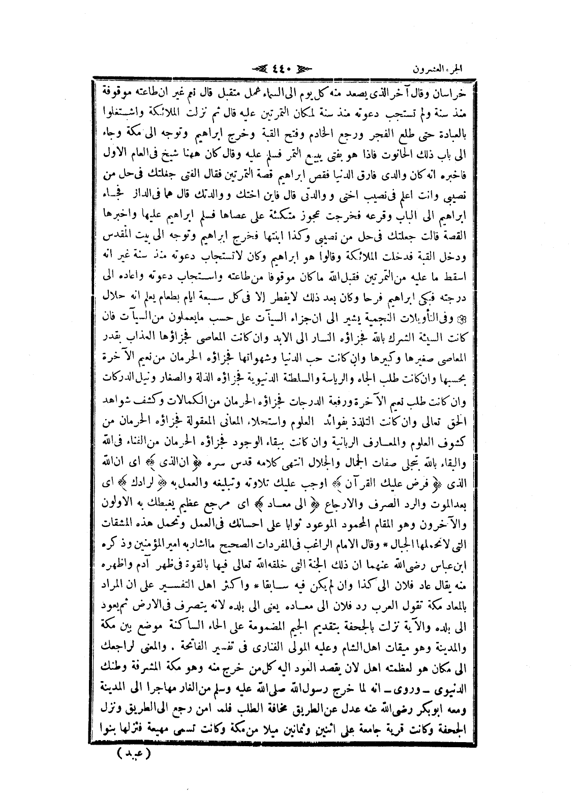 خراسان وقال آخر الذي يصعد منه كل يوم الى السماء عمل متقبل قال نعم غير ان طاعته موقوفة منذ سنة ولم تستجب دعوته منذ سنة لمكان التمرتين عليه قال ثم نزلت الملائكة واشتغلوا بالعبادة حتى طلع الفجر ورجع الخادم وفتح القبة وخرج ابراهيم وتوجه الى مكة وجاء الى باب ذلك الحانوت فاذا هو بفتى يبيع التمر فسلم عليه وقال كان هاهنا شيخ فى العام الاول فاخبره انه كان والدي فارق الدنيا فقص ابراهيم قصة التمرتين فقال الفتى جعلتك فى حل من نصيبى وأنت اعلم فى نصيب أختي ووالدتي قال فاين أختك ووالدتك قال هما فى الدار فجاء ابراهيم الى الباب وقرعه فخرجت عجوز متكئة على عصاها فسلم ابراهيم عليها وأخبرها القصة قالت جعلتك فى حل من نصيبى وكذا ابنتها فخرج ابراهيم وتوجه الى بيت المقدس ودخل القبة فدخلت الملائكة وقالوا هو ابراهيم وكان لا تستجاب دعوته منذ سنة غير انه أسقط ما عليه من التمرتين فقبل الله ما كان موقوفا من طاعته واستجاب دعوته وإعادة الى درجته فبكى ابراهيم فرحا وكان بعد ذلك لا يفطر الا فى كل سبعة ايام بطعام يعلم انه حلال وفى التأويلات النجمية يشير الى ان جزاء السيئات على حسب ما يعملون من السيئات فان كانت السيئة الشرك بالله فجزاؤه النار الى الابد وان كانت المعاصي فجزاؤها العذاب بقدر المعاصي صغيرها وكبيرها وان كانت حب الدنيا وشهواتها فجزاؤه الحرمان من نعيم الآخرة بحسبها وان كانت طلب الجاه والرياسة والسلطنة الدنيوية فجزاؤه الذلة والصغار ونيل الدركات وان كانت طلب نعيم الآخرة ورفعة الدرجات فجزاؤه الحرمان من الكمالات وكشف شواهد الحق تعالى وان كانت التلذذ بفوائد العلوم واستحلاء المعاني المعقولة فجزاؤه الحرمان من كشوف العلوم والمعارف الربانية وان كانت ببقاء الوجود فجزاؤه الحرمان من الفناء فى الله والبقاء بالله بتجلى صفات الجمال والجلال انتهى كلامه قدس سره إِنَّ الَّذِي اى ان الله الذي فَرَضَ عَلَيْكَ الْقُرْآنَ أوجب عليك تلاوته وتبليغه والعمل به لَرادُّكَ اى بعد الموت والرد الصرف والإرجاع إِلى مَعادٍ اى مرجع عظيم يغبطك به الأولون والآخرون وهو المقام المحمود الموعود ثوابا على إحسانك فى العمل وتحمل هذه المشقات التي لا تحملها الجبال وقال الامام الراغب فى المفردات الصحيح ما أشار به امير المؤمنين وذكره ابن عباس رضى الله عنهما ان ذلك الجنة التي خلقه الله تعالى فيها بالقوة فى ظهر آدم وأظهره منه يقال عاد فلان الى كذا وان لم يكن فيه سابقا واكثر اهل التفسير على ان المراد بالمعاد مكة تقول العرب رد فلان الى معاده يعنى الى بلده لانه يتصرف فى الأرض ثم يعود الى بلده والآية نزلت بالجحفة بتقديم الجيم المضمومة على الحاء الساكنة موضع بين مكة والمدينة وهو ميقات اهل الشام وعليه المولى الفنارى فى تفسير الفاتحة. والمعنى لراجعك الى مكان هو لعظمته اهل لان يقصد العود اليه كل من خرج منه وهو مكة المشرفة وطنك الدنيوي- وروى- انه لما خرج رسول الله صلى الله عليه وسلم من الغار مهاجرا الى المدينة ومعه أبو بكر رضى الله عنه عدل عن الطريق مخافة الطلب فلما أمن رجع الى الطريق ونزل الجحفة وكانت قرية جامعة على اثنين وثمانين ميلا من مكة وكانت تسمى مهيعة فنزلها بنوا
